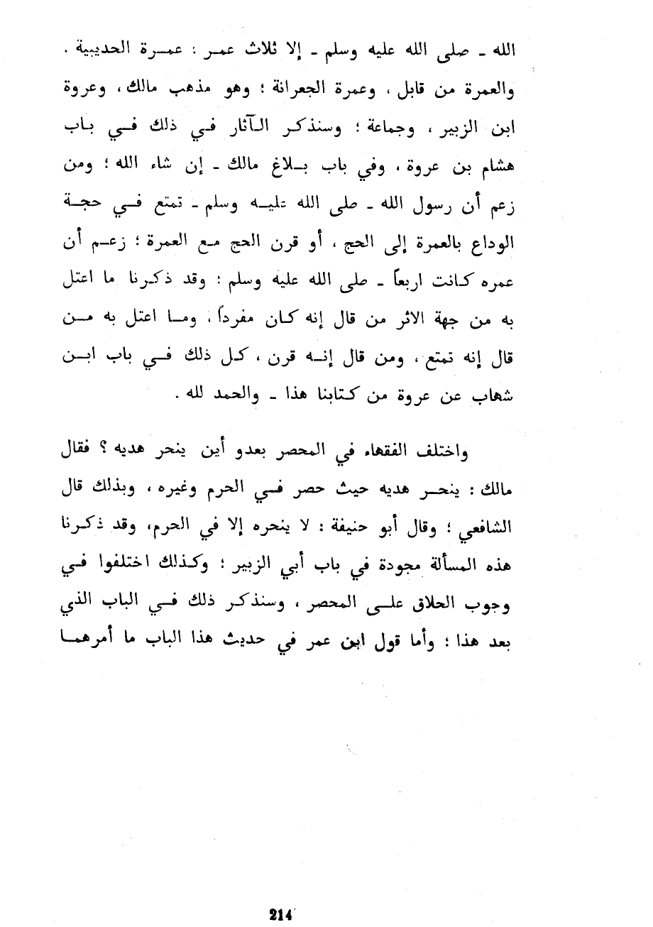 اللَّهِ صَلَّى اللَّهُ عَلَيْهِ وَسَلَّمَ إِلَّا ثَلَاثَ عمر عمر الْحُدَيْبِيَةِ وَالْعُمْرَةَ مِنْ قَابِلٍ وَعُمْرَةَ الْجِعِرَّانَةِ وَهُوَ مَذْهَبُ مَالِكٍ وَعُرْوَةَ بْنِ الزُّبَيْرِ وَجَمَاعَةٍ وَسَنَذْكُرُ الْآثَارَ فِي ذَلِكَ فِي بَابِ هِشَامِ بْنِ عُرْوَةَ وَفِي بَابِ بَلَاغِ مَالِكٍ إِنْ شَاءَ اللَّهُ وَمَنْ زَعَمَ أَنَّ رَسُولَ اللَّهِ صَلَّى اللَّهُ عَلَيْهِ وَسَلَّمَ تَمَتَّعَ فِي حَجَّةِ الْوَدَاعِ بِالْعُمْرَةِ إِلَى الْحَجِّ أَوْ قَرَنَ الْحَجَّ مَعَ الْعُمْرَةِ زَعَمَ أَنَّ عُمَرَهُ كَانَتْ أَرْبَعًا صَلَّى اللَّهُ عَلَيْهِ وَسَلَّمَ وَقَدْ ذَكَرْنَا مَا اعْتَلَّ بِهِ مِنْ جِهَةِ الْأَثَرِ مَنْ قَالَ إِنَّهُ كَانَ مُفْرِدًا وَمَا اعْتَلَّ بِهِ مَنْ قَالَ إِنَّهُ تَمَتَّعَ وَمَنْ قَالَ إِنَّهُ قَرَنَ كُلُّ ذَلِكَ فِي بَابِ ابْنِ شِهَابٍ عَنْ عُرْوَةَ مِنْ كِتَابِنَا هَذَا وَالْحَمْدُ لِلَّهِ وَاخْتَلَفَ الْفُقَهَاءُ فِي الْمُحْصَرِ بِعَدُوٍّ أَيْنَ يَنْحَرُ هَدْيَهُ فَقَالَ مَالِكٌ يَنْحَرُ هَدْيَهُ حَيْثُ حُصِرَ فِي الْحَرَمِ وَغَيْرِهِ وَبِذَلِكَ قَالَ الشَّافِعِيُّ وَقَالَ أَبُو حَنِيفَةَ لَا يَنْحَرُهُ إِلَّا فِي الْحَرَمِ وَقَدْ ذَكَرْنَا هَذِهِ الْمَسْأَلَةَ مُجَوَّدَةً فِي بَابِ أَبِي الزُّبَيْرِ وَكَذَلِكَ اخْتَلَفُوا فِي وُجُوبِ الْحِلَاقِ عَلَى الْمُحْصَرِ وَسَنَذْكُرُ ذَلِكَ فِي الْبَابِ الَّذِي بَعْدَ هَذَا وَأَمَّا قَوْلُ ابْنِ عُمَرَ فِي حَدِيثِ هَذَا الْبَابِ مَا أَمْرُهُمَا