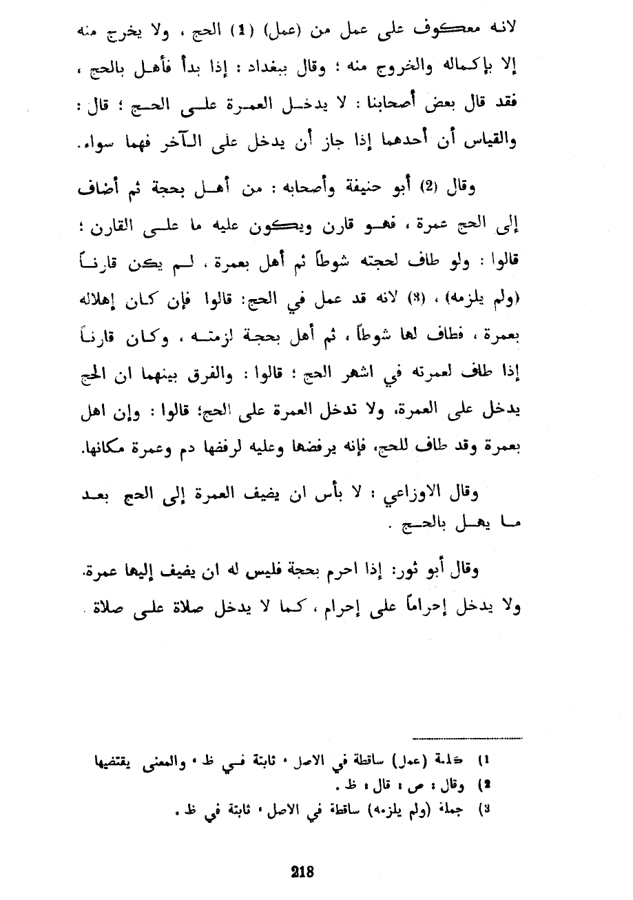 لِأَنَّهُ مَعْكُوفٌ عَلَى عَمَلٍ مِنْ (عَمَلِ) الْحَجِّ وَلَا يَخْرُجُ مِنْهُ إِلَّا بِإِكْمَالِهِ وَالْخُرُوجِ مِنْهُ وَقَالَ بِبَغْدَادَ إِذَا بَدَأَ فَأَهَلَّ بِالْحَجِّ فَقَدْ قَالَ بَعْضُ أَصْحَابِنَا لَا يُدْخِلُ الْعُمْرَةَ عَلَى الْحَجِّ قَالَ وَالْقِيَاسُ أَنَّ أَحَدَهُمَا إِذَا جَازَ أَنْ يَدْخُلَ عَلَى الْآخَرِ فَهُمَا سَوَاءٌ وَقَالَ أَبُو حَنِيفَةَ وَأَصْحَابُهُ مَنْ أَهَلَّ بِحَجَّةٍ ثُمَّ أَضَافَ إِلَى الْحَجِّ عُمْرَةً فَهُوَ قَارِنٌ وَيَكُونُ عَلَيْهِ مَا عَلَى الْقَارِنِ قَالُوا وَلَوْ طَافَ لِحَجَّتِهِ شَوْطًا ثُمَّ أَهَلَّ بِعُمْرَةٍ لَمْ يَكُنْ قَارِنًا (وَلَمْ يَلْزَمْهُ) لِأَنَّهُ قَدْ عَمِلَ فِي الْحَجِّ قَالُوا فَإِنْ كَانَ إِهْلَالُهُ بِعُمْرَةٍ فَطَافَ لَهَا شَوْطًا ثُمَّ أَهَلَّ بِحَجَّةٍ لَزِمَتْهُ وَكَانَ قَارِنًا إِذَا طَافَ لِعُمْرَتِهِ فِي أَشْهُرِ الْحَجِّ قَالُوا وَالْفَرْقُ بَيْنَهُمَا أَنَّ الْحَجَّ يَدْخُلُ عَلَى الْعُمْرَةِ وَلَا تَدْخُلُ الْعُمْرَةُ عَلَى الْحَجِّ قَالُوا وَإِنْ أَهَلَّ بِعُمْرَةٍ وَقَدْ طَافَ لِلْحَجِّ فَإِنَّهُ يَرْفُضُهَا وَعَلَيْهِ لِرَفْضِهَا دَمٌ وَعُمْرَةٌ مَكَانَهَا وَقَالَ الْأَوْزَاعِيُّ لَا بَأْسَ أَنْ يُضِيفَ الْعُمْرَةَ إِلَى الْحَجِّ بَعْدَ مَا يُهِلُّ بِالْحَجِّ وَقَالَ أَبُو ثَوْرٍ إِذَا أَحْرَمَ بِحَجَّةٍ فَلَيْسَ لَهُ أَنْ يُضِيفَ إِلَيْهَا عُمْرَةً وَلَا يُدْخِلَ إِحْرَامًا عَلَى إِحْرَامٍ كَمَا لَا يُدْخِلُ صَلَاةً عَلَى صَلَاةٍ
