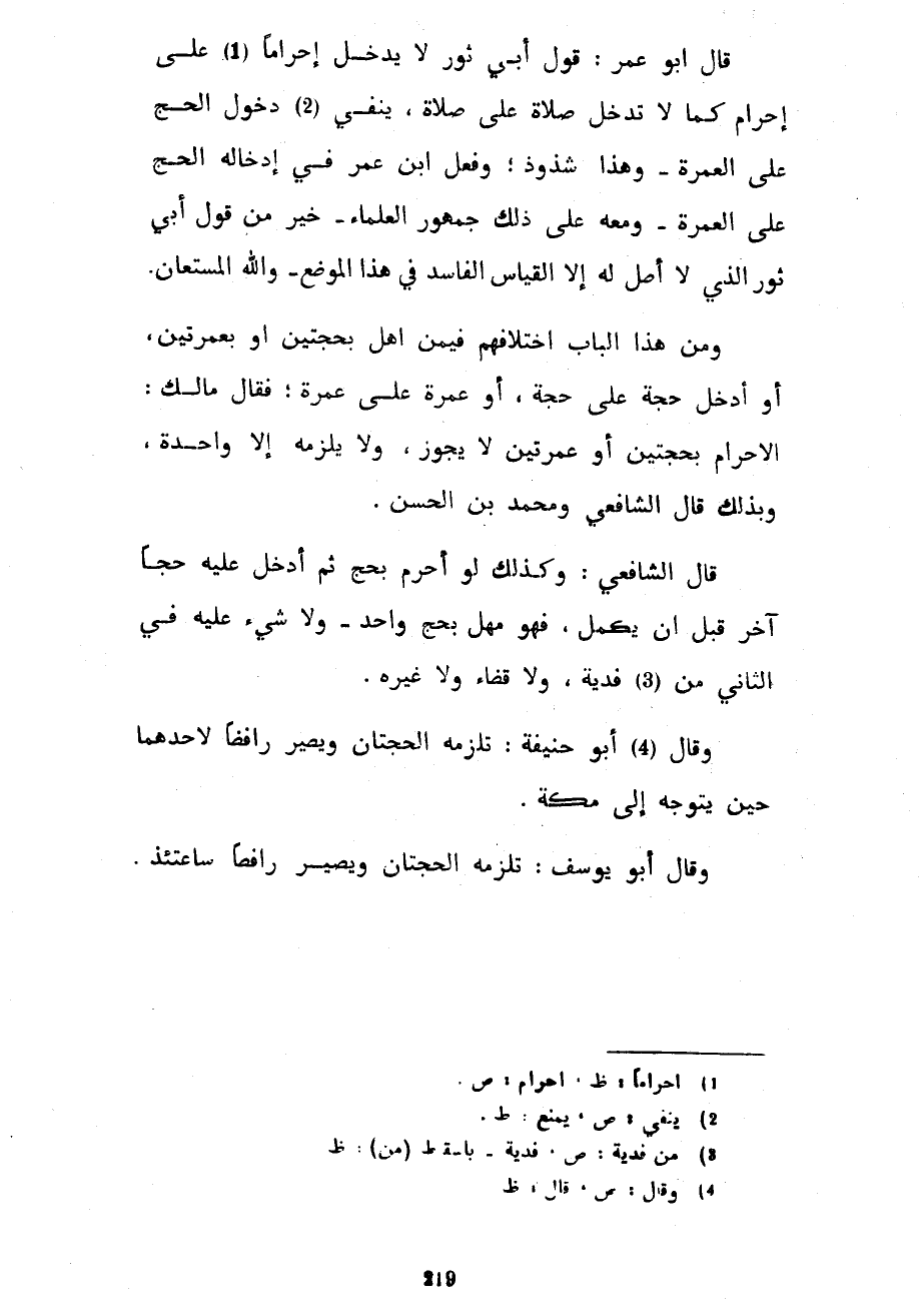 قَالَ أَبُو عُمَرَ قَوْلُ أَبِي ثَوْرٍ لَا يُدْخِلُ إِحْرَامًا عَلَى إِحْرَامٍ كَمَا لَا تَدْخُلُ صَلَاةٌ عَلَى صَلَاةٍ يَنْفِي دُخُولَ الْحَجِّ عَلَى الْعُمْرَةِ وَهَذَا شُذُوذٌ وَفِعْلُ ابْنِ عُمَرَ فِي إِدْخَالِهِ الْحَجَّ عَلَى الْعُمْرَةِ وَمَعَهُ عَلَى ذَلِكَ جُمْهُورُ الْعُلَمَاءِ خَيْرٌ مِنْ قَوْلِ أَبِي ثَوْرٍ الَّذِي لَا أَصْلَ لَهُ إِلَّا الْقِيَاسُ الْفَاسِدُ فِي هَذَا الْمَوْضِعِ وَاللَّهُ الْمُسْتَعَانُ وَمِنْ هَذَا الْبَابِ اخْتِلَافُهُمْ فِيمَنْ أَهَلَّ بِحَجَّتَيْنِ أَوْ بِعُمْرَتَيْنِ أَوْ أَدْخَلَ حَجَّةً عَلَى حَجَّةٍ أَوْ عُمْرَةً عَلَى عُمْرَةٍ فَقَالَ مَالِكٌ الْإِحْرَامُ بِحَجَّتَيْنِ أَوْ عُمْرَتَيْنِ لَا يَجُوزُ وَلَا يَلْزَمُهُ إِلَّا وَاحِدَةٌ وَبِذَلِكَ قَالَ الشَّافِعِيُّ وَمُحَمَّدُ بْنُ الْحَسَنِ قَالَ الشَّافِعِيُّ وَكَذَلِكَ لَوْ أَحْرَمَ بِحَجٍّ ثُمَّ أَدْخَلَ عَلَيْهِ حَجًّا آخَرَ قَبْلَ أَنْ يُكْمِلَ فَهُوَ مُهِلٌّ بِحَجٍّ وَاحِدٍ وَلَا شَيْءَ عَلَيْهِ فِي الثَّانِي مِنْ فِدْيَةٍ وَلَا قَضَاءٍ وَلَا غَيْرِهِ وَقَالَ أَبُو حَنِيفَةَ تَلْزَمُهُ الْحَجَّتَانِ وَيَصِيرُ رَافِضًا لِأَحَدِهِمَا حِينَ يَتَوَجَّهُ إِلَى مَكَّةَ وَقَالَ أَبُو يُوسُفَ تَلْزَمُهُ الْحَجَّتَانِ وَيَصِيرُ رَافِضًا سَاعَتَئِذٍ