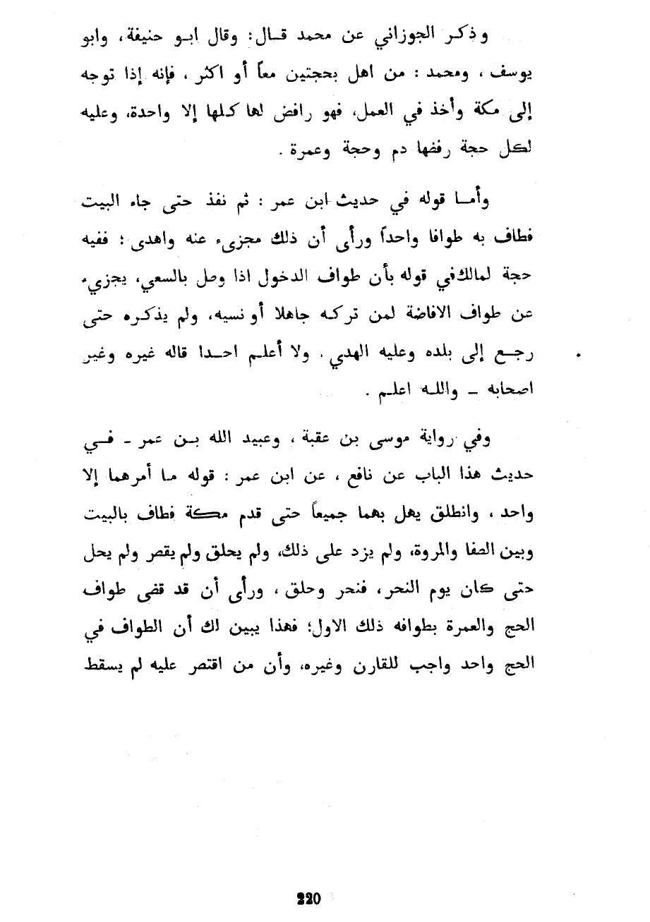 وَذَكَرَ الْجَوْزَانِيُّ عَنْ مُحَمَّدٍ قَالَ وَقَالَ أَبُو حَنِيفَةَ وَأَبُو يُوسُفَ وَمُحَمَّدٌ مَنْ أَهَلَّ بِحَجَّتَيْنِ مَعًا أَوْ أَكْثَرَ فَإِنَّهُ إِذَا تَوَجَّهَ إِلَى مَكَّةَ وَأَخَذَ فِي الْعَمَلِ فَهُوَ رَافِضٌ لَهَا كُلِّهَا إِلَّا وَاحِدَةٍ وَعَلَيْهِ لِكُلِّ حَجَّةٍ رَفَضَهَا دَمٌ وَحَجَّةٌ وَعُمْرَةٌ وَأَمَّا قَوْلُهُ فِي حَدِيثِ ابْنِ عُمَرَ ثُمَّ نَفَذَ حَتَّى جَاءَ الْبَيْتَ فطاف به طوافا واحدا ورأى أَنَّ ذَلِكَ مُجْزِئٌ عَنْهُ وَأَهْدَى فَفِيهِ حُجَّةٌ لمالك فِي قَوْلِهِ بِأَنَّ طَوَافَ الدُّخُولِ إِذَا وَصَلَ بِالسَّعْيِ يُجْزِئُ عَنْ طَوَافِ الْإِفَاضَةِ لِمَنْ تَرَكَهُ جَاهِلًا أَوْ نَسِيَهُ وَلَمْ يَذْكُرْهُ حَتَّى رَجَعَ إِلَى بَلَدِهِ وَعَلَيْهِ الْهَدْيُ وَلَا أَعْلَمُ أَحَدًا قَالَهُ غَيْرَهُ وَغَيْرَ أَصْحَابِهِ وَاللَّهِ أَعْلَمُ وَفِي رِوَايَةِ مُوسَى بْنِ عُقْبَةَ وَعُبَيْدِ اللَّهِ بْنِ عُمَرَ فِي حَدِيثِ هَذَا الْبَابِ عَنْ نَافِعٍ عَنِ ابْنِ عُمَرَ قَوْلُهُ مَا أَمْرُهُمَا إِلَّا وَاحِدٌ وَانْطَلَقَ يُهِلُّ بِهِمَا جَمِيعًا حَتَّى قَدِمَ مَكَّةَ فَطَافَ بِالْبَيْتِ وَبَيْنَ الصَّفَا وَالْمَرْوَةِ وَلَمْ يَزِدْ عَلَى ذَلِكَ وَلَمْ يَحْلِقْ وَلَمْ يُقَصِّرْ وَلَمْ يَحِلَّ حَتَّى كَانَ يَوْمُ النَّحْرِ فَنَحَرَ وَحَلَقَ وَرَأَى أَنْ قَدْ قَضَى طَوَافَ الْحَجِّ وَالْعُمْرَةِ بِطَوَافِهِ ذَلِكَ الْأَوَّلِ فَهَذَا يُبَيِّنُ لَكَ أَنَّ الطَّوَافَ فِي الْحَجِّ وَاحِدٌ وَاجِبٌ لِلْقَارِنِ وَغَيْرِهِ وَأَنَّ مَنِ اقْتَصَرَ عَلَيْهِ لَمْ يُسْقِطْ