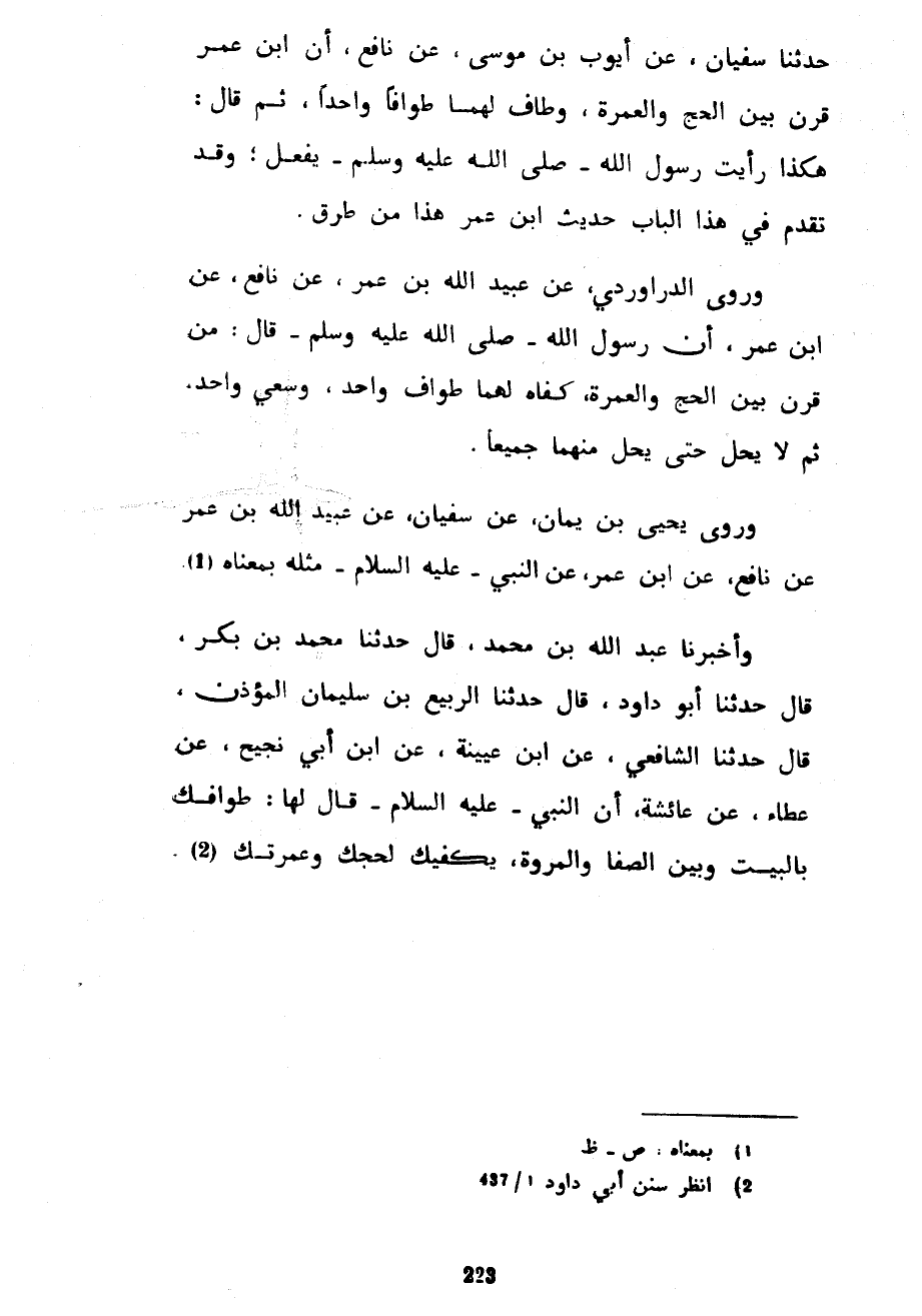 حَدَّثَنَا سُفْيَانُ عَنْ أَيُّوبَ بْنِ مُوسَى عَنْ نَافِعٍ أَنَّ ابْنَ عُمَرَ قَرَنَ بَيْنَ الْحَجِّ وَالْعُمْرَةِ وَطَافَ لَهُمَا طَوَافًا وَاحِدًا ثُمَّ قَالَ هَكَذَا رَأَيْتُ رَسُولَ اللَّهِ صَلَّى اللَّهُ عَلَيْهِ وَسَلَّمَ يَفْعَلُ وَقَدْ تَقَدَّمَ فِي هَذَا الْبَابِ حَدِيثُ ابْنِ عُمَرَ هَذَا مِنْ طُرُقٍ وَرَوَى الدَّرَاوَرْدِيُّ عَنْ عُبَيْدِ اللَّهِ بْنِ عُمَرَ عَنْ نَافِعٍ عَنِ ابْنِ عُمَرَ أَنَّ رَسُولَ اللَّهِ صَلَّى اللَّهُ عَلَيْهِ وَسَلَّمَ قَالَ مَنْ قَرَنَ بَيْنَ الْحَجَّ وَالْعُمْرَةَ كَفَاهُ لَهُمَا طَوَافٌ وَاحِدٌ وَسَعْيٌ وَاحِدٌ ثُمَّ لَا يَحِلَّ حَتَّى يَحِلَّ مِنْهُمَا جَمِيعًا وَرَوَى يَحْيَى بْنُ يَمَانٍ عَنْ سُفْيَانَ عَنْ عُبَيْدِ اللَّهِ بْنِ عُمَرَ عَنْ نَافِعٍ عَنِ ابْنِ عُمَرَ عَنِ النَّبِيِّ عَلَيْهِ السَّلَامُ مِثْلَهُ بِمَعْنَاهُ وَأَخْبَرَنَا عَبْدُ اللَّهِ بْنُ مُحَمَّدٍ قَالَ حَدَّثَنَا مُحَمَّدُ بْنُ بَكْرٍ قَالَ حَدَّثَنَا أَبُو دَاوُدَ قَالَ حَدَّثَنَا الرَّبِيعُ بْنُ سُلَيْمَانَ الْمُؤَذِّنُ قَالَ حَدَّثَنَا الشَّافِعِيُّ عَنِ ابْنُ عُيَيْنَةَ عَنِ ابْنِ أَبِي نَجِيحٍ عَنْ عَطَاءٍ عَنْ عَائِشَةَ أَنَّ النَّبِيَّ عَلَيْهِ السَّلَامُ قَالَ لَهَا طَوَافُكِ بِالْبَيْتِ وَبَيْنَ الصَّفَا وَالْمَرْوَةِ يَكْفِيكِ لحجك وعمرتك