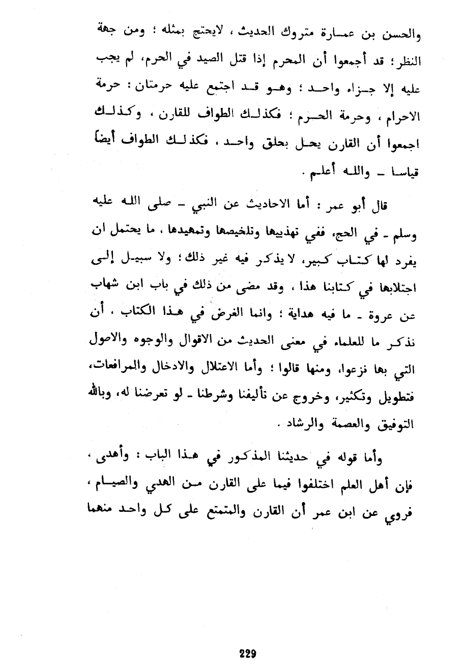 وَالْحَسَنُ بْنُ عُمَارَةَ مَتْرُوكُ الْحَدِيثِ لَا يُحْتَجُّ بِمِثْلِهِ وَمِنْ جِهَةِ النَّظَرِ قَدْ أَجْمَعُوا أَنَّ الْمُحْرِمَ إِذَا قَتَلَ الصَّيْدَ فِي الْحَرَمِ لَمْ يَجِبْ عَلَيْهِ إِلَّا جَزَاءٌ وَاحِدٌ وَهُوَ قَدِ اجْتَمَعَ عَلَيْهِ حُرْمَتَانِ حُرْمَةُ الْإِحْرَامِ وَحُرْمَةُ الْحَرَمِ فَكَذَلِكَ الطَّوَافُ لِلْقَارِنِ وَكَذَلِكَ أَجْمَعُوا أَنَّ الْقَارِنَ يَحِلُّ بِحَلْقٍ وَاحِدٍ فَكَذَلِكَ الطَّوَافُ أَيْضًا قِيَاسًا وَاللَّهُ أَعْلَمُ قَالَ أَبُو عُمَرَ أَمَّا الْأَحَادِيثُ عَنِ النَّبِيِّ صَلَّى اللَّهُ عَلَيْهِ وَسَلَّمَ فِي الحج ففي تهذيبها وتلخيصهها وَتَمْهِيدِهَا مَا يُحْتَمَلُ أَنْ يُفْرَدَ لَهَا كِتَابٌ كبير لا يذكر فيه غير ذَلِكَ وَلَا سَبِيلَ إِلَى اجْتِلَابِهَا فِي كِتَابِنَا هَذَا وَقَدْ مَضَى مِنْ ذَلِكَ فِي بَابِ ابْنِ شِهَابٍ عَنْ عُرْوَةَ مَا فِيهِ هِدَايَةٌ وَإِنَّمَا الْغَرَضُ فِي هَذَا الْكِتَابِ أَنْ نَذْكُرَ مَا لِلْعُلَمَاءِ فِي مَعْنَى الْحَدِيثِ مِنَ الْأَقْوَالِ وَالْوُجُوهِ وَالْأُصُولِ الَّتِي بِهَا نَزَعُوا وَمِنْهَا قَالُوا وَأَمَّا الِاعْتِلَالُ وَالْإِدْخَالُ وَالْمُرَافَعَاتُ فَتَطْوِيلٌ وَتَكْثِيرٌ وَخُرُوجٌ عَنْ تَأْلِيفِنَا وَشَرْطِنَا لَوْ تَعَرَّضْنَا لَهُ وَبِاللَّهِ التَّوْفِيقُ وَالْعِصْمَةُ وَالرَّشَادُ وَأَمَّا قَوْلُهُ فِي حَدِيثِنَا الْمَذْكُورِ فِي هَذَا الْبَابِ وَأَهْدَى فَإِنَّ أَهْلَ الْعِلْمِ اخْتَلَفُوا فِيمَا عَلَى الْقَارِنِ مِنَ الْهَدْيِ وَالصِّيَامِ فَرُوِيَ عَنِ ابْنِ عُمَرَ أَنَّ الْقَارِنَ وَالْمُتَمَتِّعَ عَلَى كُلِّ وَاحِدٍ مِنْهُمَا