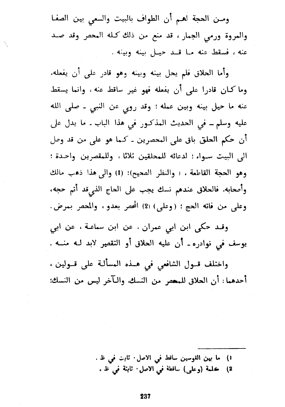 وَمِنَ الْحُجَّةِ لَهُمْ أَنَّ الطَّوَافَ بِالْبَيْتِ وَالسَّعْيَ بَيْنَ الصَّفَا وَالْمَرْوَةِ وَرَمْيَ الْجِمَارِ قَدْ مُنِعَ مِنْ ذَلِكَ كُلِّهِ الْمُحْصَرُ وَقَدْ صُدَّ عَنْهُ فَسَقَطَ عَنْهُ مَا قَدْ حِيلَ بَيْنَهُ وَبَيْنَهُ وَأَمَّا الْحِلَاقُ فَلَمْ يُحَلْ بَيْنَهُ وَبَيْنَهُ وَهُوَ قَادِرٌ عَلَى أَنْ يَفْعَلَهُ وَمَا كَانَ قَادِرًا على أن يفعله فهو غير سَاقِطٌ عَنْهُ وَإِنَّمَا يَسْقُطُ عَنْهُ مَا حِيلَ بَيْنَهُ وَبَيْنَ عَمَلِهِ وَقَدْ رُوِيَ عَنِ النَّبِيِّ صَلَّى اللَّهُ عَلَيْهِ وَسَلَّمَ فِي الْحَدِيثِ الْمَذْكُورِ فِي هَذَا الْبَابِ مَا يَدُلُّ عَلَى أَنَّ حُكْمَ الْحَلْقِ بَاقٍ عَلَى الْمُحْصَرِينَ كَمَا هُوَ عَلَى مَنْ قَدْ وَصَلَ إِلَى الْبَيْتِ سَوَاءً لِدُعَائِهِ لِلْمُحَلِّقِينَ ثَلَاثًا وَلِلْمُقَصِّرِينَ وَاحِدَةً وَهُوَ الْحُجَّةُ الْقَاطِعَةُ (وَالنَّظَرُ الصَّحِيحُ) وَإِلَى هَذَا ذَهَبَ مَالِكٌ وَأَصْحَابُهُ فَالْحِلَاقُ عِنْدَهُمْ نُسُكٌ يَجِبُ عَلَى الْحَاجِّ الَّذِي قَدْ أَتَمَّ حَجَّهُ وَعَلَى مَنْ فَاتَهُ الْحَجُّ (وَعَلَى) الْمُحْصَرِ بِعَدُوٍّ وَالْمُحْصَرِ بِمَرَضٍ وَقَدْ حَكَى ابْنُ أَبِي عِمْرَانَ عَنِ ابْنِ سَمَاعَةَ عَنْ أَبِي يُوسُفَ فِي نَوَادِرِهِ أَنَّ عَلَيْهِ الْحِلَاقَ أَوِ التَّقْصِيرَ لَا بُدَّ لَهُ مِنْهُ وَاخْتَلَفَ قَوْلُ الشَّافِعِيِّ فِي هَذِهِ الْمَسْأَلَةِ عَلَى قَوْلَيْنِ أَحَدِهِمَا أَنَّ الْحِلَاقَ لِلْمُحْصَرِ مَنَ النُّسُكِ وَالْآخَرِ لَيْسَ مِنَ النُّسُكِ