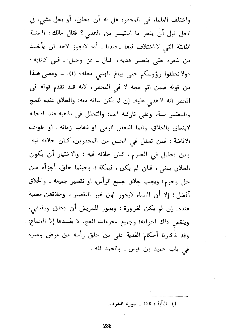 وَاخْتَلَفَ الْعُلَمَاءُ فِي الْمُحْصَرِ هَلْ لَهُ أَنْ يَحْلِقَ أَوْ يَحِلَّ بِشَيْءٍ فِي الْحِلِّ قَبْلَ أَنْ يَنْحَرَ مَا اسْتَيْسَرَ مِنَ الْهَدْيِ فَقَالَ مَالِكٌ السُّنَّةُ الثَّابِتَةُ الَّتِي لَا اخْتِلَافَ فِيهَا عِنْدَنَا أَنَّهُ لَا يَجُوزُ لِأَحَدٍ أَنْ يَأْخُذَ مِنْ شَعْرِهِ حَتَّى يَنْحَرَ هَدْيَهُ قَالَ عَزَّ وجل في كتابه ولا تحلقوا رؤوسكم حَتَّى يَبْلُغَ الْهَدْيُ مَحِلَّهُ وَمَعْنَى هَذَا مِنْ قَوْلِهِ فِيمَنْ أَتَمَّ حَجَّهُ لَا فِي الْمُحْصَرِ لِأَنَّهُ قَدْ تَقَدَّمَ قَوْلُهُ فِي الْمُحْصَرِ أَنَّهُ لَا هَدْيَ عَلَيْهِ إِنْ لَمْ يَكُنْ سَاقَهُ مَعَهُ وَالْحِلَاقُ عِنْدَهُ لِلْحَجِّ وَلِلْمُعْتَمِرِ سُنَّةٌ وَعَلَى تَارِكِهِ الدَّمُ وَالتَّحَلُّلُ فِي مَذْهَبِهِ عِنْدَ أَصْحَابِهِ لَا يَتَعَلَّقُ بِالْحِلَاقِ وَإِنَّمَا التَّحَلُّلُ الرَّمْيُ أَوْ ذَهَابُ زَمَانِهِ أَوْ طَوَافُ الْإِفَاضَةِ فَمَنْ تَحَلَّلَ فِي الْحِلِّ مِنَ الْمُحْصَرِينَ كَانَ حِلَاقُهُ فِيهِ وَمَنْ تَحَلَّلَ فِي الْحَرَمِ كَانَ حِلَاقُهُ فِيهِ وَالِاخْتِيَارُ أَنْ يَكُونَ الْحِلَاقُ بِمِنًى فَإِنْ لَمْ يَكُنْ فَبِمَكَّةَ وَحَيْثُمَا حَلَقَ أَجْزَأَهُ مِنْ حِلٍّ وَحَرَمٍ وَيَجِبُ حِلَاقُ جَمِيعِ الرَّأْسِ أَوْ تَقْصِيرُ جَمِيعِهِ وَالْحِلَاقُ أَفْضَلُ إِلَّا أَنَّ النِّسَاءَ لَا يَجُوزُ لَهُنَّ غَيْرُ التَّقْصِيرِ وَحِلَاقُهُنَّ مَعْصِيَةٌ عِنْدَهُ إِنْ لَمْ يَكُنْ لِضَرُورَةٍ وَيَجُوزُ لِلْمَرِيضِ أَنْ يَحْلِقَ وَيَفْتَدِيَ وَيَنْقُصُ ذَلِكَ إِحْرَامَهُ وَجَمِيعُ مُحَرَّمَاتِ الْحَجِّ لَا يُفْسِدُهَا إِلَّا الْجِمَاعُ وَقَدْ ذَكَرْنَا أَحْكَامَ الْفِدْيَةِ عَلَى مَنْ حَلَقَ رَأْسَهُ مِنْ مَرَضٍ وَغَيْرِهِ فِي بَابِ حُمَيْدِ بْنِ قَيْسٍ وَالْحَمْدُ لِلَّهِ