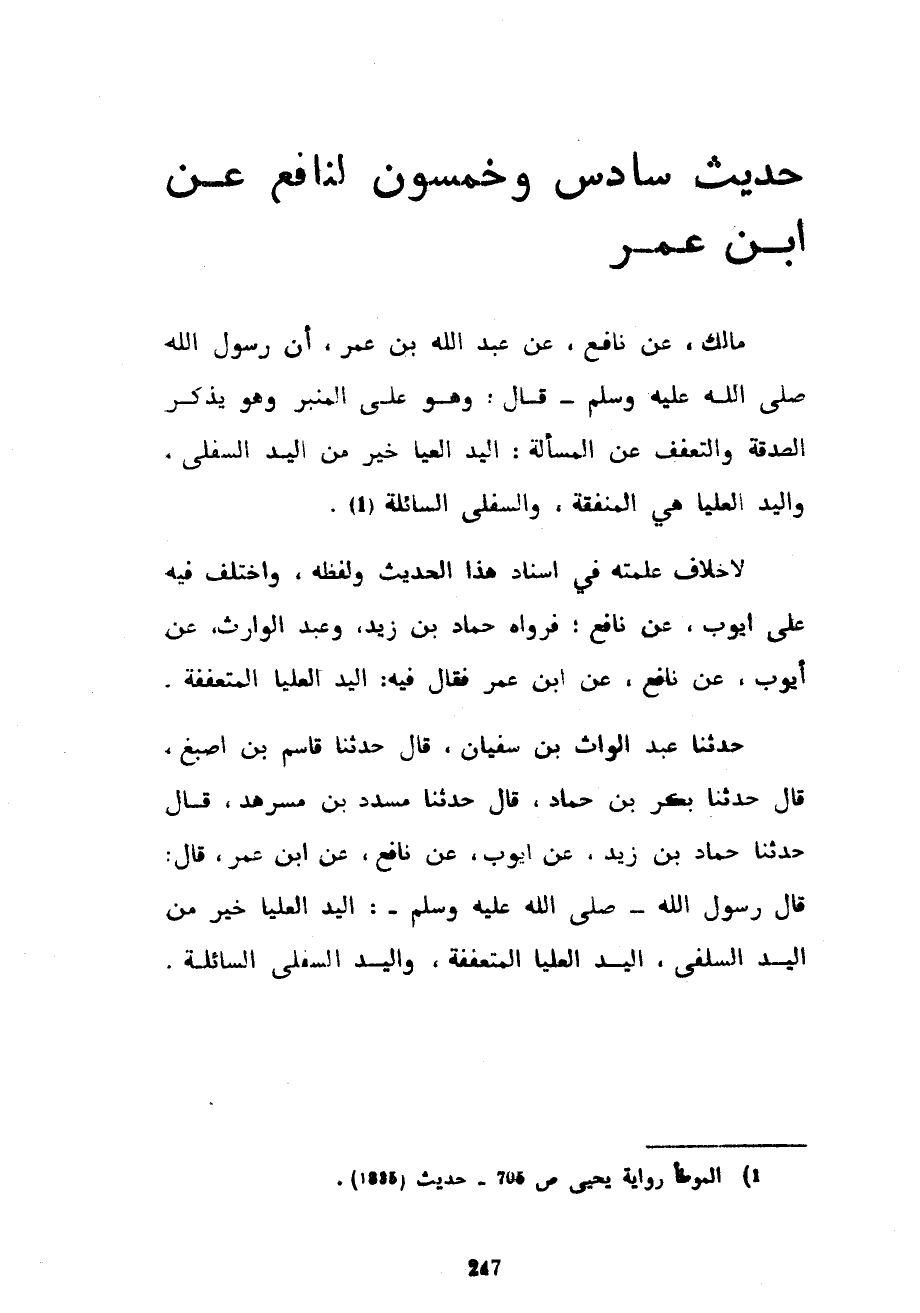 حَدِيثٌ سَادِسٌ وَخَمْسُونَ لِنَافِعٍ عَنِ ابْنِ عُمَرَ مَالِكٌ عَنْ نَافِعٍ عَنْ عَبْدِ اللَّهِ بْنِ عُمَرَ أَنَّ رَسُولَ اللَّهِ صَلَّى اللَّهُ عَلَيْهِ وَسَلَّمَ قَالَ وَهُوَ عَلَى الْمِنْبَرِ وَهُوَ يَذْكُرُ الصَّدَقَةَ وَالتَّعَفُّفَ عَنِ الْمَسْأَلَةِ الْيَدُ الْعُلْيَا خَيْرٌ مِنَ الْيَدِ السُّفْلَى وَالْيَدُ الْعُلْيَا هِيَ الْمُنْفِقَةُ وَالسُّفْلَى السَّائِلَةُ لَا خِلَافَ عَلِمْتُهُ فِي إِسْنَادِ هَذَا الْحَدِيثِ وَلَفْظِهِ وَاخْتُلِفَ فِيهِ عَلَى أَيُّوبَ عَنْ نَافِعٍ فَرَوَاهُ حَمَّادُ بْنُ زَيْدٍ وَعَبْدُ الْوَارِثِ عَنْ أَيُّوبَ عَنْ نَافِعٍ عَنِ ابْنِ عُمَرَ فَقَالَ فِيهِ الْيَدُ الْعُلْيَا الْمُتَعَفِّفَةُ حَدَّثَنَا عَبْدُ الْوَارِثِ بْنُ سُفْيَانَ قَالَ حَدَّثَنَا قَاسِمُ بْنُ أَصْبَغَ قَالَ حَدَّثَنَا بَكْرُ بْنُ حَمَّادٍ قَالَ حَدَّثَنَا مُسَدَّدُ بْنُ مُسَرْهَدٍ قَالَ حَدَّثَنَا حَمَّادُ بْنُ زَيْدٍ عَنْ أَيُّوبَ عَنْ نَافِعٍ عَنِ ابْنِ عُمَرَ قَالَ قَالَ رَسُولُ اللَّهِ صَلَّى اللَّهُ عَلَيْهِ وَسَلَّمَ الْيَدُ الْعُلْيَا خَيْرٌ مِنَ الْيَدِ السُّفْلَى الْيَدُ الْعُلْيَا الْمُتَعَفِّفَةُ وَالْيَدُ السفلى السائلة