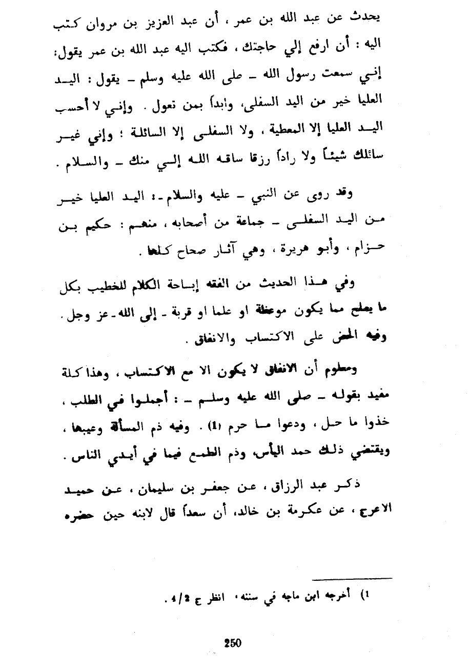 يُحَدِّثُ عَنْ عَبْدِ اللَّهِ بْنِ عُمَرَ أَنَّ عَبْدَ الْعَزِيزِ بْنَ مَرْوَانَ كَتَبَ إِلَيْهِ أَنِ ارْفَعْ إِلَيَّ حَاجَتَكَ فَكَتَبَ إِلَيْهِ عَبْدُ اللَّهِ بْنُ عُمَرَ يَقُولُ إِنِّي سَمِعْتُ رَسُولَ اللَّهِ صَلَّى اللَّهُ عَلَيْهِ وَسَلَّمَ يَقُولُ الْيَدُ الْعُلْيَا خَيْرٌ مِنَ الْيَدِ السُّفْلَى وَابْدَأْ بِمَنْ تَعُولُ وَإِنِّي لَا أَحْسَبُ الْيَدَ الْعُلْيَا إِلَّا الْمُعْطِيَةَ وَلَا السُّفْلَى إِلَّا السَّائِلَةَ وَإِنِّي غَيْرُ سَائِلِكَ شَيْئًا وَلَا رَادًّا رِزْقًا سَاقَهُ اللَّهُ إِلَيَّ مِنْكَ وَالسَّلَامُ وَقَدْ رَوَى عَنِ النَّبِيِّ عَلَيْهِ السَّلَامُ الْيَدُ الْعُلْيَا خَيْرٌ مِنَ الْيَدِ السُّفْلَى جَمَاعَةٌ مِنْ أَصْحَابِهِ مِنْهُمْ حَكِيمُ بْنُ حِزَامٍ وَأَبُو هُرَيْرَةَ وَهِيَ آثَارٌ صِحَاحٌ كُلُّهَا وَفِي هَذَا الْحَدِيثِ مِنَ الْفِقْهِ إِبَاحَةُ الْكَلَامِ لِلْخَطِيبِ بِكُلِّ مَا يَصْلُحُ مِمَّا يَكُونُ مَوْعِظَةً أَوْ عِلْمًا أَوْ قُرْبَةً إِلَى اللَّهِ عَزَّ وَجَلَّ وَفِيهِ الْحَضُّ عَلَى الِاكْتِسَابِ وَالْإِنْفَاقِ وَمَعْلُومٌ أَنَّ الْإِنْفَاقَ لَا يَكُونُ إِلَّا مَعَ الِاكْتِسَابِ وَهَذَا كله مفيد بِقَوْلِهِ صَلَّى اللَّهُ عَلَيْهِ وَسَلَّمَ أَجْمِلُوا فِي الطَّلَبِ خُذُوا مَا حَلَّ وَدَعُوا مَا حَرُمَ وَفِيهِ ذَمُّ الْمَسْأَلَةِ وَعَيْبُهَا وَيَقْتَضِي ذَلِكَ حَمْدَ الْيَأْسِ وَذَمَّ الطَّمَعِ فِيمَا فِي أَيْدِي النَّاسِ ذَكَرَ عَبْدُ الرَّزَّاقِ عَنْ جَعْفَرِ بْنِ سُلَيْمَانَ عَنْ حُمَيْدٍ الْأَعْرَجِ عَنْ عِكْرِمَةَ بْنِ خَالِدٍ أَنَّ سَعْدًا قَالَ لِابْنِهِ حِينَ حَضَرَهُ