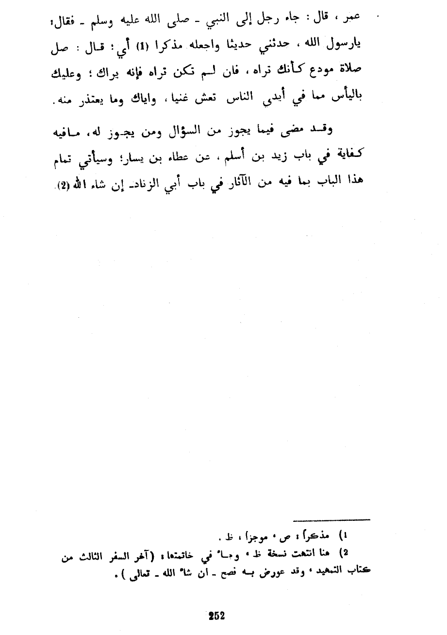 عُمَرَ قَالَ جَاءَ رَجُلٌ إِلَى النَّبِيِّ صَلَّى اللَّهُ عَلَيْهِ وَسَلَّمَ فَقَالَ يَا رَسُولَ اللَّهِ حدثني وَاجْعَلْهُ مُذَكِّرًا أَيْ قَالَ صَلِّ صَلَاةَ مُوَدِّعٍ كَأَنَّكَ تَرَاهُ فَإِنْ لَمْ تَكُنْ تَرَاهُ فَإِنَّهُ يَرَاكَ وَعَلَيْكَ بِالْيَأْسِ مِمَّا فِي أَيْدِي النَّاسِ تَعِشْ غَنِيًّا وَإِيَّاكَ وَمَا يُعْتَذَرُ مِنْهُ وَقَدْ مَضَى فِيمَا يَجُوزُ مِنَ السُّؤَالِ وَمَنْ يَجُوزُ لَهُ مَا فِيهِ كِفَايَةٌ فِي بَابِ زَيْدِ بْنِ أَسْلَمَ عَنْ عَطَاءِ بْنِ يَسَارٍ وَسَيَأْتِي تَمَامُ هَذَا الْبَابِ بِمَا فِيهِ مِنَ الْآثَارِ فِي بَابِ أَبِي الزِّنَادِ إِنْ شَاءَ اللَّهُ