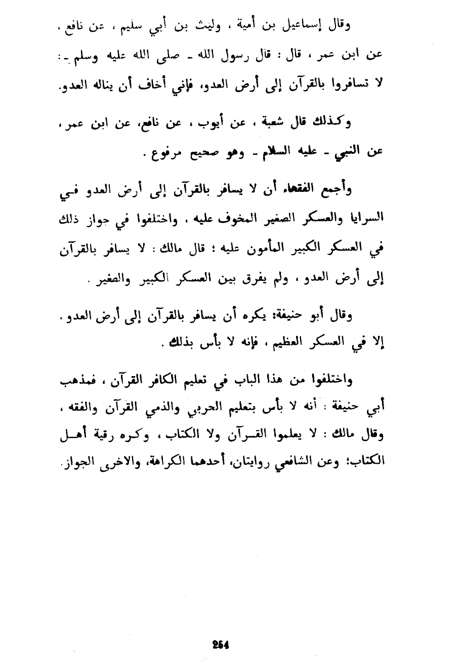وَقَالَ إِسْمَاعِيلُ بْنُ أُمَيَّةَ وَلَيْثُ بْنُ أَبِي سليم عن نفع عَنِ ابْنِ عُمَرَ قَالَ قَالَ رَسُولُ اللَّهِ صَلَّى اللَّهُ عَلَيْهِ وَسَلَّمَ لَا تُسَافِرُوا بِالْقُرْآنِ إِلَى أَرْضِ الْعَدُوِّ فَإِنِّي أَخَافُ أَنْ يَنَالَهُ الْعَدُوُّ وَكَذَلِكَ قَالَ شُعْبَةُ عَنْ أَيُّوبَ عَنْ نَافِعٍ عَنِ ابْنِ عُمَرَ عَنِ النَّبِيِّ عَلَيْهِ السَّلَامُ وَهُوَ صَحِيحٌ مَرْفُوعٌ وَأَجْمَعَ الْفُقَهَاءُ أَنْ لَا يُسَافَرَ بِالْقُرْآنِ إِلَى أَرْضِ الْعَدُوِّ فِي السَّرَايَا وَالْعَسْكَرِ الصَّغِيرِ الْمَخُوفِ عَلَيْهِ وَاخْتَلَفُوا فِي جَوَازِ ذَلِكَ فِي الْعَسْكَرِ الْكَبِيرِ الْمَأْمُونِ عَلَيْهِ قَالَ مَالِكٌ لَا يُسَافَرُ بِالْقُرْآنِ إِلَى أَرْضِ الْعَدُوِّ وَلَمْ يُفَرِّقْ بَيْنَ الْعَسْكَرِ الْكَبِيرِ وَالصَّغِيرِ وَقَالَ أَبُو حَنِيفَةَ يُكْرَهُ أَنْ يُسَافَرَ بِالْقُرْآنِ إِلَى أَرْضِ الْعَدُوِّ إِلَّا فِي الْعَسْكَرِ الْعَظِيمِ فَإِنَّهُ لَا بَأْسَ بِذَلِكَ وَاخْتَلَفُوا مِنْ هَذَا الْبَابِ فِي تَعْلِيمِ الْكَافِرِ الْقُرْآنَ فَمَذْهَبُ أَبِي حَنِيفَةَ أَنَّهُ لَا بَأْسَ بِتَعْلِيمِ الْحَرْبِيِّ وَالذِّمِّيِّ الْقُرْآنَ وَالْفِقْهَ وَقَالَ مَالِكٌ لَا يُعَلَّمُوا الْقُرْآنَ وَلَا الْكِتَابَ وَكَرِهَ رُقْيَةَ أَهْلِ الْكِتَابِ وَعَنِ الشَّافِعِيِّ رِوَايَتَانِ أَحَدُهُمَا الْكَرَاهَةُ وَالْأُخْرَى الْجَوَازُ