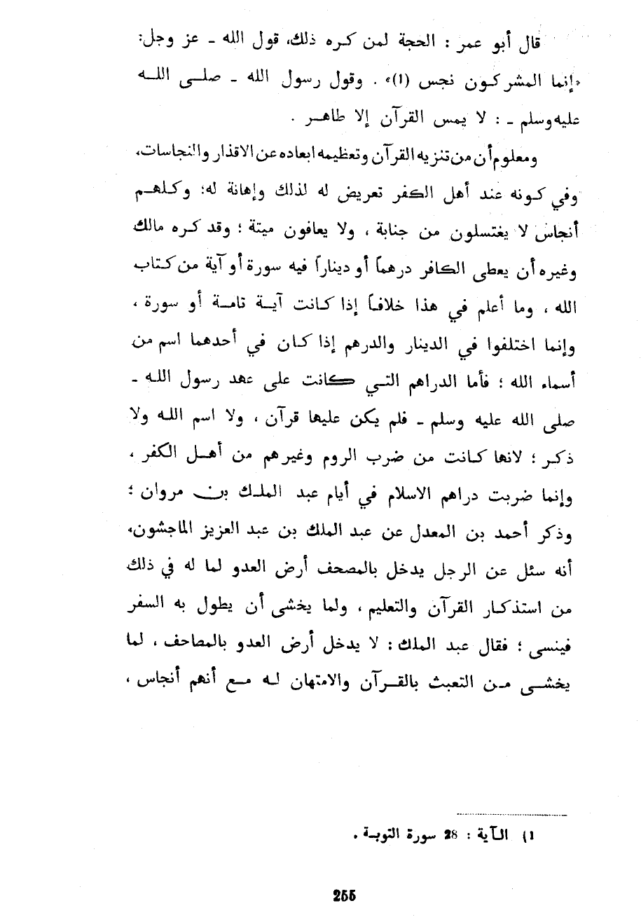 قَالَ أَبُو عُمَرَ الْحُجَّةُ لِمَنْ كَرِهَ ذَلِكَ قَوْلُ اللَّهِ عَزَّ وَجَلَّ إِنَّمَا الْمُشْرِكُونَ نَجَسٌ وَقَوْلُ رَسُولِ اللَّهِ صَلَّى اللَّهُ عَلَيْهِ وَسَلَّمَ لَا يَمَسَّ الْقُرْآنَ إِلَّا طَاهِرٌ وَمَعْلُومٌ أَنَّ مِنْ تَنْزِيهِ الْقُرْآنِ وَتَعْظِيمِهِ إِبْعَادَهُ عَنِ الْأَقْذَارِ وَالنَّجَاسَاتِ وَفِي كَوْنِهِ عِنْدَ أَهْلِ الْكُفْرِ تَعْرِيضٌ لَهُ لِذَلِكَ وَإِهَانَةٌ لَهُ وَكُلُّهُمْ أَنْجَاسٌ لَا يَغْتَسِلُونَ مِنْ جَنَابَةٍ وَلَا يَعَافُونَ مَيْتَةً وَقَدْ كَرِهَ مَالِكٌ وَغَيْرُهُ أَنْ يُعْطَى الْكَافِرُ دِرْهَمًا أَوْ دِينَارًا فِيهِ سُورَةٌ أَوْ آيَةٌ مِنْ كِتَابِ اللَّهِ وَمَا أَعْلَمُ فِي هَذَا خِلَافًا إِذَا كَانَتْ آيَةً تَامَّةً أَوْ سُورَةً وَإِنَّمَا اختلفوا في الدنيار وَالدِّرْهَمِ إِذَا كَانَ فِي أَحَدِهِمَا اسْمٌ مِنْ أَسْمَاءِ اللَّهِ فَأَمَّا الدَّرَاهِمُ الَّتِي كَانَتْ عَلَى عَهْدِ رَسُولِ اللَّهِ صَلَّى اللَّهُ عَلَيْهِ وَسَلَّمَ فَلَمْ يَكُنْ عَلَيْهَا قُرْآنٌ وَلَا اسْمُ اللَّهِ وَلَا ذِكْرٌ لِأَنَّهَا كَانَتْ مِنْ ضَرْبِ الرُّومِ وَغَيْرِهِمْ مِنْ أَهْلِ الْكُفْرِ وَإِنَّمَا ضُرِبَتْ دَرَاهِمُ الْإِسْلَامِ فِي أَيَّامِ عَبْدِ الْمَلِكِ بْنِ مَرْوَانَ وَذَكَرَ أَحْمَدُ بْنُ الْمُعَدَّلِ عَنْ عَبْدِ الْمَلِكِ بْنِ عَبْدِ الْعَزِيزِ الْمَاجِشُونِ أَنَّهُ سُئِلَ عَنِ الرَّجُلِ يَدْخُلُ بِالْمُصْحَفِ أَرْضَ الْعَدُوِّ لِمَا لَهُ فِي ذَلِكَ مِنِ اسْتِذْكَارِ الْقُرْآنِ وَالتَّعْلِيمِ وَلِمَا يَخْشَى أَنْ يَطُولَ بِهِ السَّفَرُ فَيَنْسَى فَقَالَ عَبْدُ الْمَلِكِ لَا يُدْخَلُ أَرْضُ الْعَدُوِّ بِالْمَصَاحِفِ لِمَا يُخْشَى مِنَ التَّعَبُّثِ بِالْقُرْآنِ وَالِامْتِهَانِ لَهُ مَعَ أَنَّهُمْ أَنْجَاسٌ