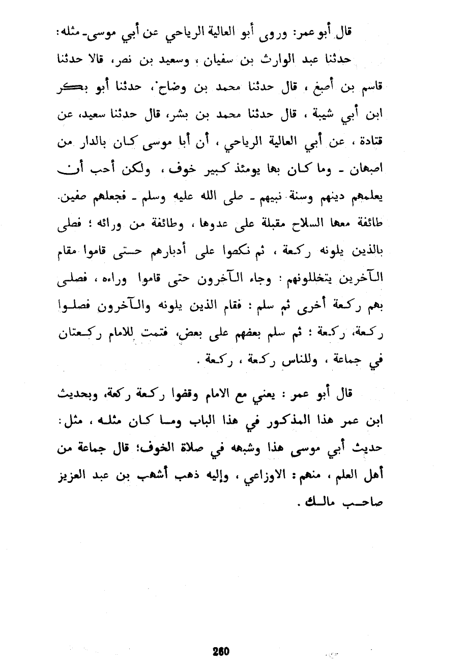 قَالَ أَبُو عُمَرَ وَرَوَى أَبُو الْعَالِيَةِ الرِّيَاحِيُّ عَنْ أَبِي مُوسَى مِثْلَهُ حَدَّثَنَا عَبْدُ الْوَارِثِ بْنُ سُفْيَانَ وَسَعِيدُ بْنُ نَصْرٍ قَالَا حَدَّثَنَا قَاسِمُ بْنُ أَصْبَغَ قَالَ حَدَّثَنَا مُحَمَّدُ بْنُ وَضَّاحٍ حَدَّثَنَا أَبُو بَكْرِ بْنُ أَبِي شَيْبَةَ قَالَ حَدَّثَنَا مُحَمَّدُ بْنُ بِشْرٍ قَالَ حَدَّثَنَا سَعِيدٌ عَنْ قَتَادَةَ عَنْ أَبِي الْعَالِيَةِ الرِّيَاحِيِّ أَنَّ أَبَا مُوسَى كَانَ بِالدَّارِ مِنْ أَصْبَهَانَ وَمَا كَانَ بِهَا يَوْمَئِذٍ كَبِيرُ خَوْفٍ وَلَكِنْ أَحَبَّ أَنْ يُعَلِّمَهُمْ دِينَهُمْ وَسُنَّةَ نَبِيِّهِمْ صَلَّى اللَّهُ عَلَيْهِ وَسَلَّمَ فَجَعَلَهُمْ صَفَّيْنِ طَائِفَةٌ مَعَهَا السِّلَاحُ مُقْبِلَةٌ عَلَى عَدُوِّهَا وَطَائِفَةٌ مِنْ وَرَائِهِ فَصَلَّى بِالَّذِينَ يَلُونَهُ رَكْعَةً ثُمَّ نَكَصُوا عَلَى أدبارهم حتى قاموا مقام الآخرين يَتَخَلَّلُونَهُمْ وَجَاءَ الْآخَرُونَ حَتَّى قَامُوا وَرَاءَهُ فَصَلَّى بِهِمْ رَكْعَةً أُخْرَى ثُمَّ سَلَّمَ فَقَامَ الَّذِينَ يَلُونَهُ وَالْآخَرُونَ فَصَلَّوْا رَكْعَةً رَكْعَةً ثُمَّ سَلَّمَ بَعْضُهُمْ عَلَى بَعْضٍ فَتَمَّتْ لِلْإِمَامِ رَكْعَتَانِ فِي جَمَاعَةٍ وَلِلنَّاسِ رَكْعَةٌ رَكْعَةً قَالَ أَبُو عُمَرَ يَعْنِي مَعَ الْإِمَامِ وَقَضَوْا رَكْعَةً رَكْعَةً وَبِحَدِيثِ ابْنِ عُمَرَ هَذَا الْمَذْكُورِ فِي هَذَا الْبَابِ وَمَا كَانَ مِثْلَهُ مِثْلُ حَدِيثِ أَبِي مُوسَى هَذَا وَشِبْهِهِ فِي صَلَاةِ الْخَوْفِ قَالَ جَمَاعَةٌ مِنْ أَهْلِ الْعِلْمِ مِنْهُمُ الْأَوْزَاعِيُّ وَإِلَيْهِ ذَهَبَ أَشْهَبُ بْنُ عَبْدِ الْعَزِيزِ صَاحِبُ مَالِكٍ