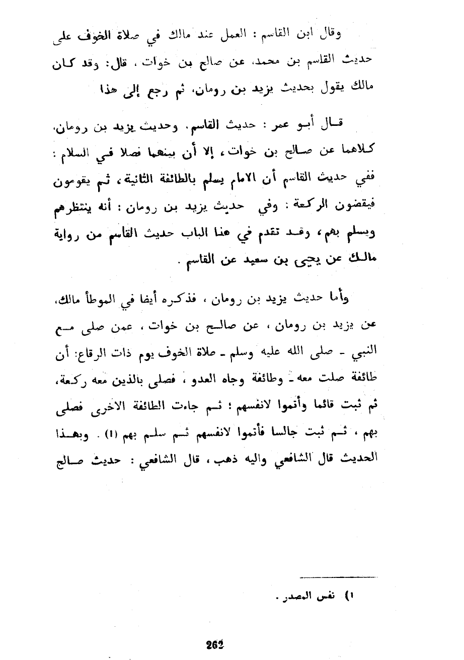 وَقَالَ ابْنُ الْقَاسِمِ الْعَمَلُ عِنْدَ مَالِكٍ فِي صَلَاةِ الْخَوْفِ عَلَى حَدِيثِ الْقَاسِمِ بْنِ مُحَمَّدٍ عَنْ صَالِحِ بْنِ خَوَّاتٍ قَالَ وَقَدْ كَانَ مَالِكٌ يَقُولُ بِحَدِيثِ يَزِيدَ بْنِ رُومَانَ ثُمَّ رَجَعَ إِلَى هَذَا قَالَ أَبُو عُمَرَ حَدِيثُ الْقَاسِمِ وَحَدِيثُ يَزِيدَ بْنِ رُومَانَ كِلَاهُمَا عَنْ صَالِحِ بْنِ خَوَّاتٍ إِلَّا أَنَّ بَيْنَهُمَا فَصْلًا فِي السَّلَامِ فَفِي حَدِيثِ الْقَاسِمِ أَنَّ الْإِمَامَ يُسَلِّمُ بِالطَّائِفَةِ الثَّانِيَةِ ثُمَّ يَقُومُونَ فَيَقْضُونَ الرَّكْعَةَ وَفِي حَدِيثِ يَزِيدَ بْنِ رُومَانَ أَنَّهُ يَنْتَظِرُهُمْ وَيُسَلِّمُ بِهِمْ وَقَدْ تَقَدَّمَ فِي هَذَا الْبَابِ حَدِيثُ الْقَاسِمِ مِنْ رِوَايَةِ مَالِكٍ عَنْ يَحْيَى بْنِ سَعِيدٍ عَنِ الْقَاسِمِ وَأَمَّا حَدِيثُ يَزِيدَ بْنِ رُومَانَ فَذَكَرَهُ أَيْضًا فِي الْمُوَطَّإِ مَالِكٌ عَنْ يَزِيدَ بْنِ رُومَانَ عَنْ صَالِحِ بْنِ خَوَّاتٍ عَمَّنْ صَلَّى مَعَ النَّبِيِّ صَلَّى اللَّهُ عَلَيْهِ وَسَلَّمَ صَلَاةَ الْخَوْفِ يَوْمَ ذَاتِ الرِّقَاعِ أَنَّ طَائِفَةً صَلَّتْ مَعَهُ وَطَائِفَةً وِجَاهُ الْعَدُوِّ فَصَلَّى بِالَّذِينَ مَعَهُ رَكْعَةً ثُمَّ ثَبَتَ قَائِمًا وَأَتَمُّوا لِأَنْفُسِهِمْ ثُمَّ جَاءَتِ الطَّائِفَةُ الْأُخْرَى فَصَلَّى بِهِمْ ثُمَّ ثَبَتَ جَالِسًا فَأَتَمُّوا لِأَنْفُسِهِمْ ثُمَّ سَلَّمَ بِهِمْ وَبِهَذَا الْحَدِيثِ قَالَ الشَّافِعِيُّ وَإِلَيْهِ ذهب قال الشافعي حديث صالح