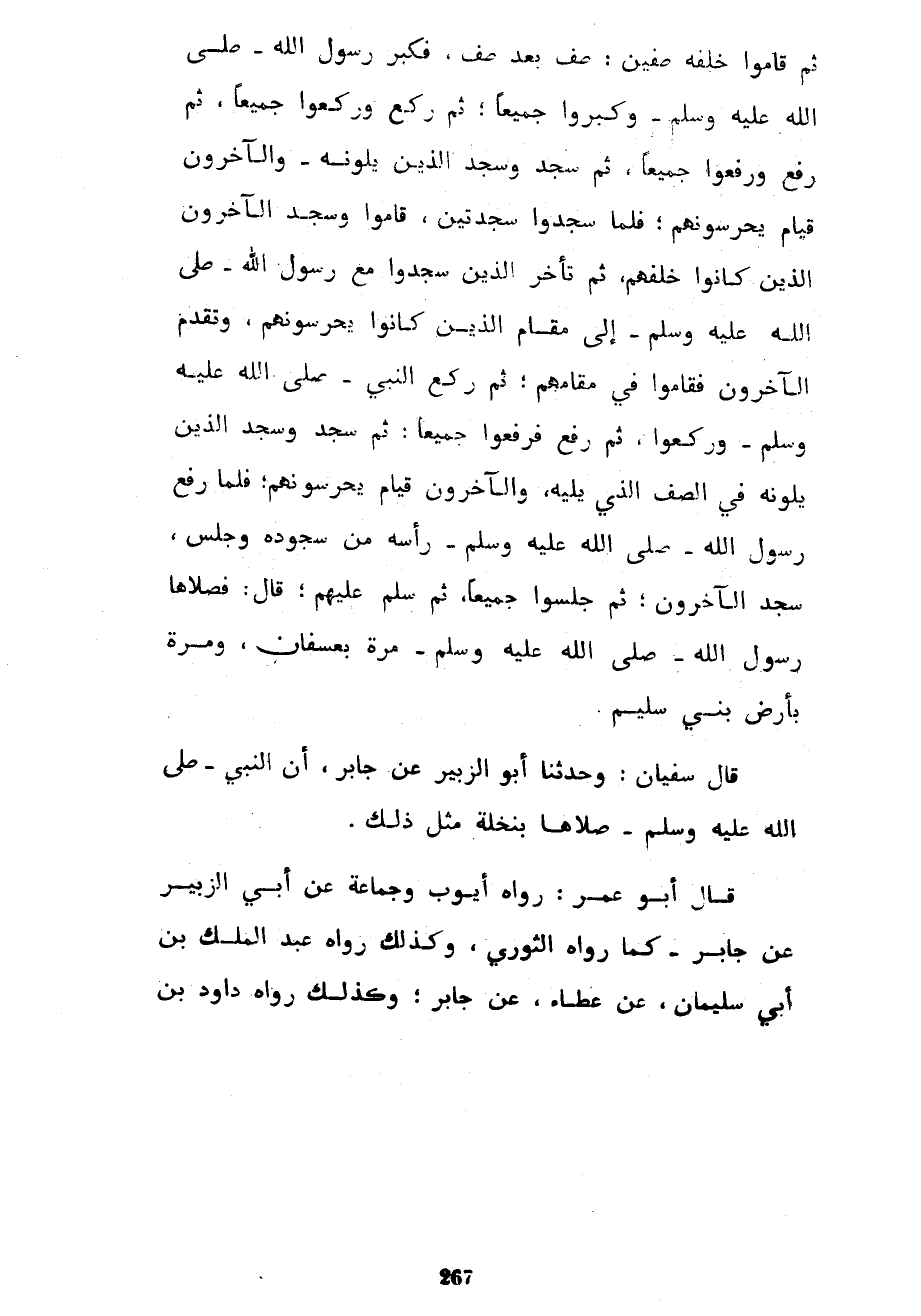 ثم قاموا خلفه صفين صف بعد صف فكبر رَسُولِ اللَّهِ صَلَّى اللَّهُ عَلَيْهِ وَسَلَّمَ وَكَبَّرُوا جَمِيعًا ثُمَّ رَكَعَ وَرَكَعُوا جَمِيعًا ثُمَّ رَفَعَ وَرَفَعُوا جَمِيعًا ثُمَّ سَجَدَ وَسَجَدَ الَّذِينَ يَلُونَهُ وَالْآخَرُونَ قِيَامٌ يَحْرُسُونَهُمْ فَلَمَّا سَجَدُوا سَجْدَتَيْنِ قَامُوا وَسَجَدَ الْآخَرُونَ الَّذِينَ كَانُوا خَلْفَهُمْ ثُمَّ تَأَخَّرَ الَّذِينَ سَجَدُوا مَعَ رَسُولِ اللَّهِ صَلَّى اللَّهُ عَلَيْهِ وَسَلَّمَ إِلَى مَقَامِ الَّذِينَ كَانُوا يَحْرُسُونَهُمْ وَتَقَدَّمَ الْآخَرُونَ فَقَامُوا فِي مَقَامِهِمْ ثُمَّ رَكَعَ النَّبِيُّ صَلَّى اللَّهُ عَلَيْهِ وَسَلَّمَ وَرَكَعُوا ثُمَّ رَفَعَ فَرَفَعُوا جَمِيعًا ثُمَّ سَجَدَ وَسَجَدَ الَّذِينَ يَلُونَهُ فِي الصَّفِّ الَّذِي يَلِيهِ وَالْآخَرُونَ قِيَامٌ يَحْرُسُونَهُمْ فَلَمَّا رَفَعَ رَسُولُ اللَّهِ صَلَّى اللَّهُ عَلَيْهِ وَسَلَّمَ رَأْسَهُ مِنْ سُجُودِهِ وَجَلَسَ سَجَدَ الْآخَرُونَ ثُمَّ جَلَسُوا جَمِيعًا ثُمَّ سَلَّمَ عَلَيْهِمْ قَالَ فَصَلَّاهَا رَسُولُ اللَّهِ صَلَّى اللَّهُ عَلَيْهِ وَسَلَّمَ مَرَّةً بعسفان ومرة بِأَرْضِ بَنِي سُلَيْمٍ قَالَ سُفْيَانُ وَحَدَّثَنَا أَبُو الزُّبَيْرِ عَنْ جَابِرٍ أَنَّ النَّبِيَّ صَلَّى اللَّهُ عَلَيْهِ وَسَلَّمَ صَلَّاهَا بِنَخْلَةَ مِثْلَ ذَلِكَ قَالَ أَبُو عُمَرَ رَوَاهُ أَيُّوبُ وَجَمَاعَةٌ عَنْ أَبِي الزُّبَيْرِ عَنْ جَابِرٍ كَمَا رَوَاهُ الثَّوْرِيُّ وَكَذَلِكَ رَوَاهُ عَبْدِ الْمَلِكِ بْنِ أَبِي سُلَيْمَانَ عَنْ عَطَاءٍ عَنْ جَابِرٍ وَكَذَلِكَ رَوَاهُ دَاوُدُ بْنُ