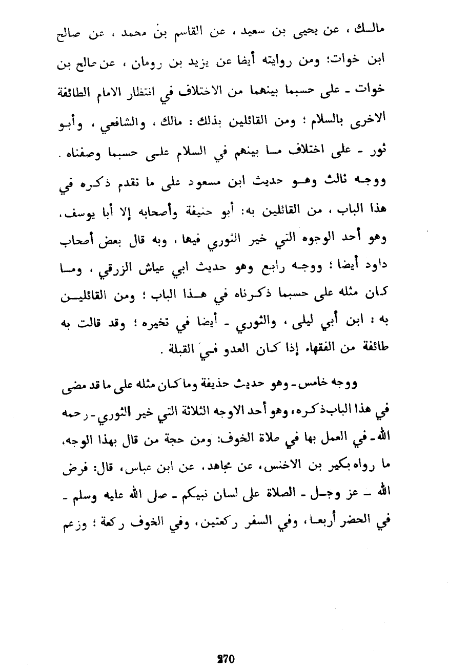 مَالِكٍ عَنْ يَحْيَى بْنِ سَعِيدٍ عَنِ الْقَاسِمِ بْنِ مُحَمَّدٍ عَنْ صَالِحِ بْنِ خَوَّاتٍ وَمِنْ رِوَايَتِهِ أَيْضًا عَنْ يَزِيدَ بْنِ رُومَانَ عَنْ صَالِحِ بْنِ خَوَّاتٍ عَلَى حَسْبَمَا بَيْنَهُمَا مِنَ الِاخْتِلَافِ فِي انْتِظَارِ الْإِمَامِ الطَّائِفَةَ الْأُخْرَى بِالسَّلَامِ وَمِنَ الْقَائِلِينَ بِذَلِكَ مَالِكٌ وَالشَّافِعِيُّ وَأَبُو ثَوْرٍ عَلَى اخْتِلَافِ مَا بَيْنَهُمْ فِي السَّلَامِ عَلَى حَسْبَمَا وَصَفْنَاهُ وَوَجْهٌ ثَالِثٌ وَهُوَ حَدِيثُ ابْنِ مَسْعُودٍ عَلَى مَا تَقَدَّمَ ذِكْرُهُ فِي هَذَا الْبَابِ مِنَ الْقَائِلِينَ بِهِ أَبُو حَنِيفَةَ وَأَصْحَابُهُ إِلَّا أَبَا يُوسُفَ وَهُوَ أَحَدُ الْوُجُوهِ الَّتِي خَيَّرَ الثَّوْرِيُّ فِيهَا وَبِهِ قَالَ بَعْضُ أَصْحَابِ دَاوُدَ أَيْضًا وَوَجْهٌ رَابِعٌ وَهُوَ حَدِيثُ أَبِي عَيَّاشٍ الزُّرَقِيِّ وَمَا كَانَ مِثْلَهُ عَلَى حَسْبَمَا ذَكَرْنَاهُ فِي هَذَا الْبَابِ وَمِنَ الْقَائِلِينَ بِهِ ابْنُ أَبِي لَيْلَى وَالثَّوْرِيُّ أَيْضًا فِي تَخَيُّرِهِ وَقَدْ قَالَتْ بِهِ طَائِفَةٌ مِنَ الْفُقَهَاءِ إِذَا كَانَ الْعَدُوُّ فِي الْقِبْلَةِ وَوَجْهٌ خَامِسٌ وَهُوَ حَدِيثُ حُذَيْفَةَ وَمَا كَانَ مِثْلَهُ عَلَى مَا قَدْ مَضَى فِي هَذَا الْبَابِ ذِكْرُهُ وَهُوَ أَحَدُ الْأَوْجُهِ الثَّلَاثَةِ الَّتِي خَيَّرَ الثَّوْرِيُّ رَحِمَهُ اللَّهُ فِي الْعَمَلِ بِهَا فِي صَلَاةِ الْخَوْفِ وَمِنْ حُجَّةِ مَنْ قَالَ بِهَذَا الْوَجْهِ مَا رَوَاهُ بُكَيْرِ بْنِ الْأَخْنَسِ عَنْ مُجَاهِدٍ عَنِ ابْنِ عَبَّاسٍ قَالَ فَرَضَ اللَّهُ عَزَّ وَجَلَّ الصَّلَاةَ عَلَى لِسَانِ نَبِيِّكُمْ صَلَّى اللَّهُ عَلَيْهِ وَسَلَّمَ فِي الْحَضَرِ أَرْبَعًا وَفِي السَّفَرِ رَكْعَتَيْنِ وَفِي الْخَوْفِ رَكْعَةً وَزَعَمَ