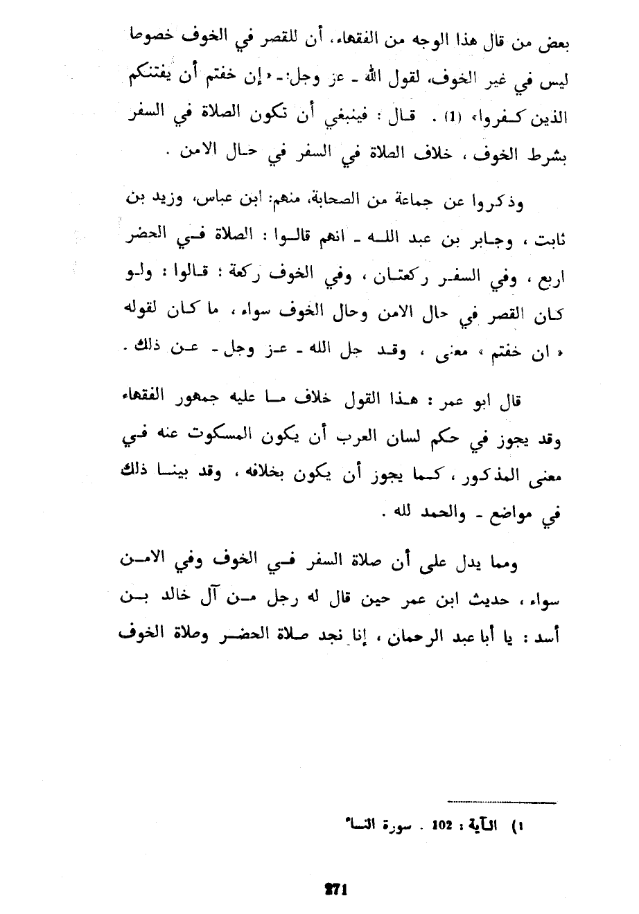 بَعْضُ مَنْ قَالَ هَذَا الْوَجْهَ مِنَ الْفُقَهَاءِ أَنَّ لِلْقَصْرِ فِي الْخَوْفِ خُصُوصًا لَيْسَ فِي غَيْرِ الْخَوْفِ لِقَوْلِ اللَّهُ عَزَّ وَجَلَّ إِنْ خِفْتُمْ أَنْ يَفْتِنَكُمُ الَّذِينَ كَفَرُوا قَالَ فَيَنْبَغِي أَنْ تَكُونَ الصَّلَاةُ فِي السَّفَرِ بِشَرْطِ الْخَوْفِ خِلَافَ الصَّلَاةِ فِي السَّفَرِ فِي حَالِ الْأَمْنِ وَذَكَرُوا عَنْ جَمَاعَةٍ مِنَ الصَّحَابَةِ مِنْهُمُ ابْنُ عَبَّاسٍ وَزَيْدُ بْنُ ثَابِتٍ وَجَابِرُ بْنُ عَبْدِ اللَّهِ أَنَّهُمْ قَالُوا الصَّلَاةُ فِي الْحَضَرِ أَرْبَعٌ وَفِي السَّفَرِ رَكْعَتَانِ وَفِي الْخَوْفِ رَكْعَةٌ قَالُوا وَلَوْ كَانَ الْقَصْرُ فِي حَالِ الْأَمْنِ وَحَالِ الْخَوْفِ سَوَاءً مَا كَانَ لِقَوْلِهِ إِنْ خِفْتُمْ مَعْنًى وَقَدْ جَلَّ اللَّهُ عَزَّ وَجَلَّ عَنْ ذَلِكَ قَالَ أَبُو عُمَرَ هَذَا الْقَوْلُ خِلَافُ مَا عَلَيْهِ جُمْهُورُ الْفُقَهَاءِ وَقَدْ يَجُوزُ فِي حُكْمِ لِسَانِ الْعَرَبِ أَنْ يَكُونَ الْمَسْكُوتُ عَنْهُ فِي مَعْنَى الْمَذْكُورِ كَمَا يَجُوزُ أَنْ يَكُونَ بِخِلَافِهِ وَقَدْ بَيَّنَّا ذَلِكَ فِي مَوَاضِعَ وَالْحَمْدُ لِلَّهِ وَمِمَّا يَدُلُّ عَلَى أَنَّ صَلَاةَ السَّفَرِ فِي الْخَوْفِ وَفِي الْأَمْنِ سَوَاءٌ حَدِيثُ ابْنِ عُمَرَ حِينَ قَالَ لَهُ رَجُلٌ مِنْ آلِ خالد بن أسد يا أبا عبد الرحمان إِنَّا نَجِدُ صَلَاةَ الْحَضَرِ وَصَلَاةَ الْخَوْفِ