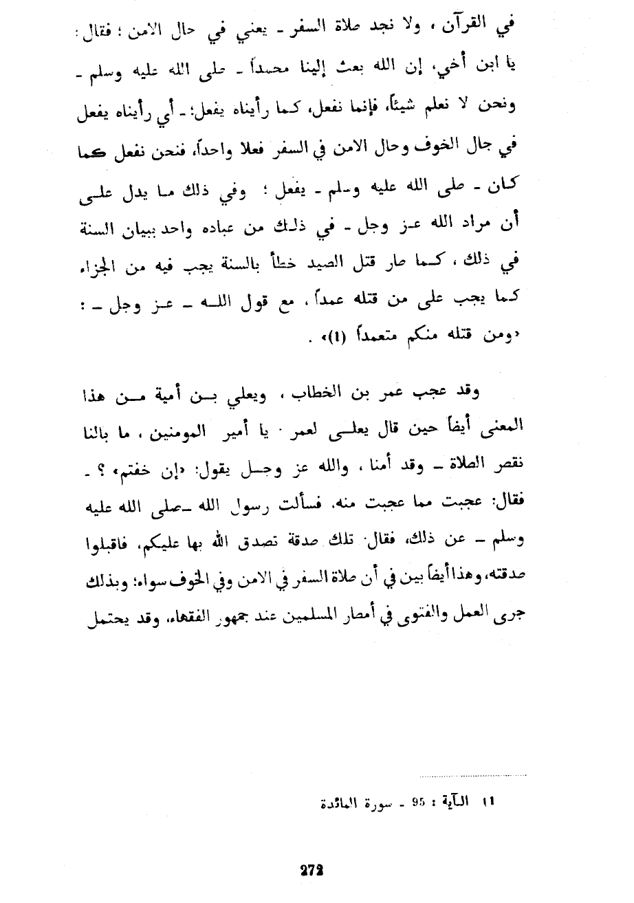 فِي الْقُرْآنِ وَلَا نَجِدُ صَلَاةَ السَّفَرِ يَعْنِي فِي حَالِ الْأَمْنِ فَقَالَ يَا ابْنَ أَخِي إِنَّ اللَّهَ بَعَثَ إِلَيْنَا مُحَمَّدًا صَلَّى اللَّهُ عَلَيْهِ وَسَلَّمَ وَنَحْنُ لَا نَعْلَمُ شَيْئًا فَإِنَّمَا نَفْعَلُ كَمَا رَأَيْنَاهُ يَفْعَلُ أَيْ رَأَيْنَاهُ يَفْعَلُ فِي حَالِ الْخَوْفِ وَحَالِ الْأَمْنِ فِي السَّفَرِ فِعْلًا وَاحِدًا فَنَحْنُ نَفْعَلُ كَمَا كَانَ صَلَّى اللَّهُ عَلَيْهِ وَسَلَّمَ يَفْعَلُ وَفِي ذَلِكَ مَا يَدُلُّ عَلَى أَنَّ مُرَادَ اللَّهِ عَزَّ وَجَلَّ فِي ذَلِكَ مِنْ عِبَادِهِ وَاحِدٌ بِبَيَانِ السُّنَّةِ فِي ذَلِكَ كَمَا صَارَ قَتْلُ الصَّيْدِ خَطَأً بِالسُّنَّةِ يَجِبُ فِيهِ مِنَ الْجَزَاءِ كَمَا يَجِبُ على من تقله عَمْدًا مَعَ قَوْلِ اللَّهِ عَزَّ وَجَلَّ وَمَنْ قَتَلَهُ مِنْكُمْ مُتَعَمِّدًا وَقَدْ عَجِبَ عُمَرُ بْنُ الْخَطَّابِ وَيَعْلَى بْنُ أُمَيَّةَ مِنْ هَذَا الْمَعْنَى أَيْضًا حِينَ قَالَ يَعْلَى لِعُمَرَ يَا أَمِيرَ الْمُؤْمِنِينَ مَا بَالُنَا نَقْصُرُ الصَّلَاةَ وَقَدْ أَمِنَّا وَاللَّهُ عَزَّ وَجَلَّ يَقُولُ إِنْ خِفْتُمْ فَقَالَ عَجِبْتُ مِمَّا عَجِبْتَ مِنْهُ فَسَأَلْتُ رَسُولَ اللَّهِ صَلَّى اللَّهُ عَلَيْهِ وَسَلَّمَ عَنْ ذَلِكَ فَقَالَ تِلْكَ صَدَقَةٌ تَصَدَّقَ اللَّهُ بِهَا عَلَيْكُمْ فَاقْبَلُوا صَدَقَتَهُ وَهَذَا أَيْضًا بَيِّنٌ فِي أَنَّ صَلَاةَ السَّفَرِ فِي الْأَمْنِ وَفِي الْخَوْفِ سَوَاءٌ وَبِذَلِكَ جَرَى الْعَمَلُ وَالْفَتْوَى فِي أَمْصَارِ الْمُسْلِمِينَ عِنْدَ جُمْهُورِ الْفُقَهَاءِ وَقَدْ يُحْتَمَلُ
