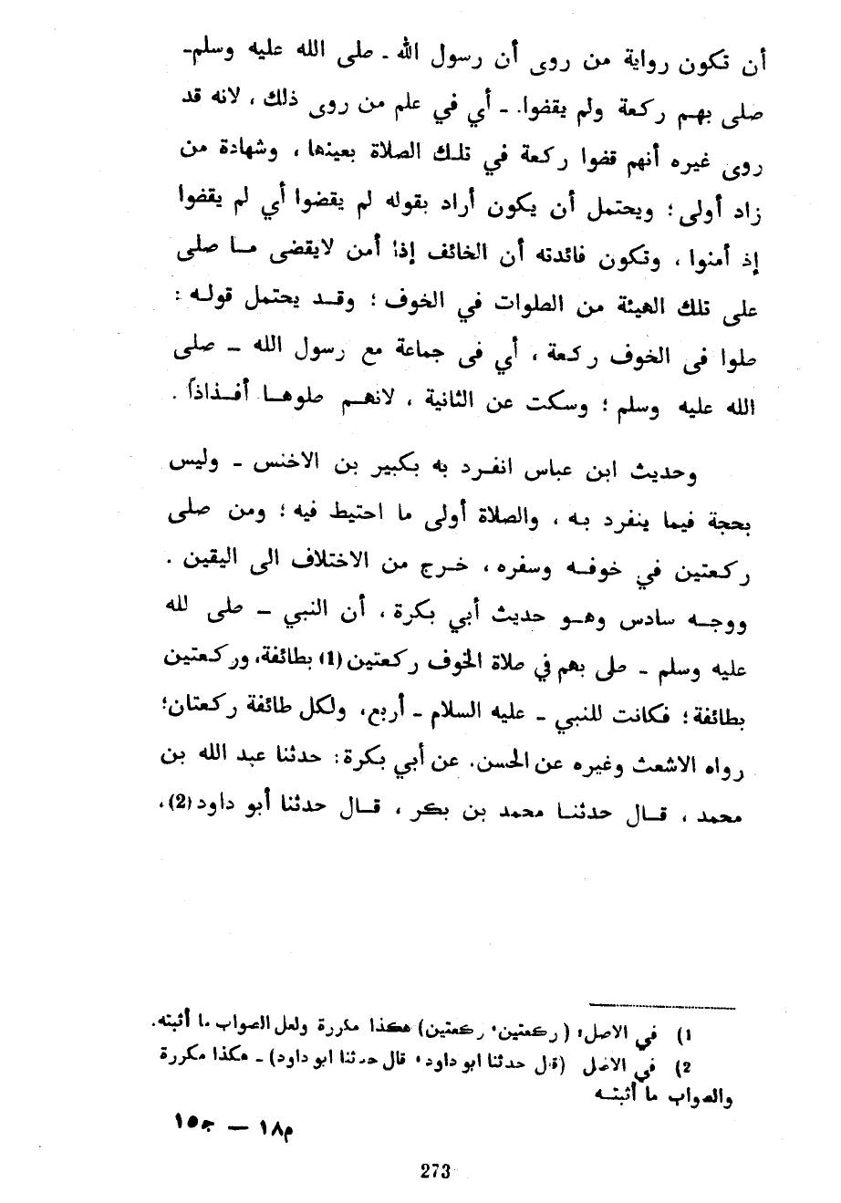 أَنْ تَكُونَ رِوَايَةُ مَنْ رُوِيَ أَنَّ رَسُولَ اللَّهِ صَلَّى اللَّهُ عَلَيْهِ وَسَلَّمَ صَلَّى بِهِمْ رَكْعَةً وَلَمْ يَقْضُوا أَيْ فِي عِلْمِ مَنْ رَوَى ذَلِكَ لِأَنَّهُ قَدْ رَوَى غَيْرَهُ أَنَّهُمْ قَضَوْا رَكْعَةً فِي تِلْكَ الصَّلَاةِ بِعَيْنِهَا وَشَهَادَةُ مَنْ زَادَ أَوْلَى وَيُحْتَمَلُ أَنْ يَكُونَ أَرَادَ بِقَوْلِهِ لَمْ يَقْضُوا أَيْ لَمْ يَقْضُوا إِذْ أَمِنُوا وَتَكُونُ فَائِدَتُهُ أَنَّ الْخَائِفَ إِذَا أَمِنَ لَا يَقْضِي مَا صَلَّى عَلَى تِلْكَ الْهَيْئَةِ مِنَ الصَّلَوَاتِ فِي الْخَوْفِ وَقَدْ يَحْتَمِلُ قَوْلُهُ صَلَّوْا فِي الْخَوْفِ رَكْعَةً أَيْ فِي جَمَاعَةٍ مَعَ رَسُولِ اللَّهِ صَلَّى اللَّهُ عَلَيْهِ وَسَلَّمَ وَسَكَتَ عَنِ الثَّانِيَةِ لِأَنَّهُمْ صَلَّوْهَا أَفْذَاذًا وَحَدِيثُ ابْنِ عَبَّاسٍ انْفَرَدَ بِهِ بُكَيْرُ بْنُ الْأَخْنَسِ وَلَيْسَ بِحُجَّةٍ فِيمَا يَنْفَرِدُ بِهِ وَالصَّلَاةُ أَوْلَى مَا احْتِيطَ فِيهِ وَمَنْ صَلَّى رَكْعَتَيْنِ فِي خَوْفِهِ وَسَفَرِهِ خَرَجَ مِنَ الِاخْتِلَافِ إِلَى الْيَقِينِ وَوَجْهٌ سَادِسٌ وَهُوَ حَدِيثِ أَبِي بَكْرَةَ أَنَّ النَّبِيَّ صَلَّى اللَّهُ عَلَيْهِ وَسَلَّمَ صَلَّى بِهِمْ فِي صَلَاةِ الْخَوْفِ رَكْعَتَيْنِ بِطَائِفَةٍ وَرَكْعَتَيْنِ بِطَائِفَةٍ فَكَانَتْ لِلنَّبِيِّ عَلَيْهِ السَّلَامُ أَرْبَعٌ وَلِكُلِّ طَائِفَةٍ رَكْعَتَانِ رَوَاهُ الْأَشْعَثُ وَغَيْرُهُ عَنِ الْحَسَنِ عَنْ أَبِي بَكْرَةَ حَدَّثَنَا عَبْدُ اللَّهِ بْنُ مُحَمَّدٍ قَالَ حَدَّثَنَا مُحَمَّدُ بْنُ بَكْرٍ قَالَ حَدَّثَنَا أَبُو دَاوُدَ