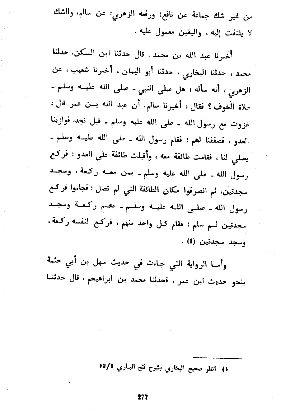 غير شَكِّ جَمَاعَةٍ عَنْ نَافِعٍ وَرَفَعَهُ الزُّهْرِيُّ عَنْ سَالِمٍ وَالشَّكُّ لَا يُلْتَفَتُ إِلَيْهِ وَالْيَقِينُ مَعْمُولٌ عَلَيْهِ أَخْبَرَنَا عَبْدُ اللَّهِ بْنُ مُحَمَّدٍ قَالَ حَدَّثَنَا ابْنُ السَّكَنِ حَدَّثَنَا مُحَمَّدٌ حَدَّثَنَا الْبُخَارِيُّ حَدَّثَنَا أَبُو الْيَمَانِ أَخْبَرَنَا شُعَيْبٌ عَنِ الزُّهْرِيِّ أَنَّهُ سَأَلَهُ هَلْ صَلَّى النَّبِيُّ صَلَّى اللَّهُ عَلَيْهِ وَسَلَّمَ صَلَاةَ الْخَوْفِ فَقَالَ أَخْبَرَنَا سَالِمٌ أَنَّ عَبْدَ اللَّهِ بْنَ عُمَرَ قَالَ غَزَوْتُ مَعَ رَسُولِ اللَّهِ صَلَّى اللَّهُ عَلَيْهِ وَسَلَّمَ قِبَلَ نَجْدٍ فَوَازَيْنَا الْعَدُوَّ فَصَفَفْنَا لَهُمْ فَقَامَ رَسُولُ اللَّهِ صَلَّى اللَّهُ عَلَيْهِ وَسَلَّمَ يصلي لَنَا فَقَامَتْ طَائِفَةٌ مَعَهُ وَأَقْبَلَتْ طَائِفَةٌ عَلَى الْعَدُوِّ فَرَكَعَ رَسُولُ اللَّهِ صَلَّى اللَّهُ عَلَيْهِ وَسَلَّمَ بِمَنْ مَعَهُ رَكْعَةً وَسَجَدَ سَجْدَتَيْنِ ثُمَّ انْصَرَفُوا مَكَانَ الطَّائِفَةِ الَّتِي لَمْ تُصَلِّ فَجَاءُوا فَرَكَعَ رَسُولُ اللَّهِ صَلَّى اللَّهُ عَلَيْهِ وَسَلَّمَ بِهِمْ رَكْعَةً وَسَجَدَ سَجْدَتَيْنِ ثُمَّ سَلَّمَ فَقَامَ كُلُّ وَاحِدٍ مِنْهُمْ فَرَكَعَ لِنَفْسِهِ رَكْعَةً وَسَجَدَ سَجْدَتَيْنِ وَأَمَّا الرِّوَايَةُ الَّتِي جَاءَتْ فِي حَدِيثِ سَهْلِ بْنِ أَبِي حَثْمَةَ بِنَحْوِ حَدِيثِ ابْنِ عُمَرَ فَحَدَّثْنَا مُحَمَّدُ بْنُ إِبْرَاهِيمَ قَالَ حَدَّثَنَا