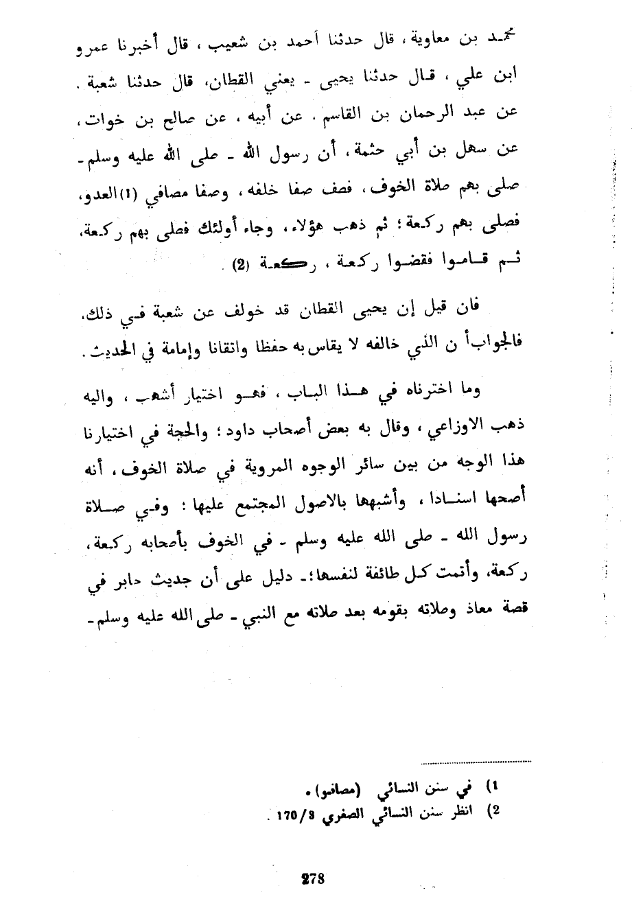 مُحَمَّدُ بْنُ مُعَاوِيَةَ قَالَ حَدَّثَنَا أَحْمَدُ بْنُ شُعَيْبٍ قَالَ أَخْبَرَنَا عَمْرُو بْنُ عَلِيٍّ قَالَ حَدَّثَنَا يَحْيَى يَعْنِي الْقَطَّانَ قَالَ حَدَّثَنَا شُعْبَةُ عن عبد الرحمان بْنِ الْقَاسِمِ عَنْ أَبِيهِ عَنْ صَالِحِ بْنِ خَوَّاتٍ عَنْ سَهْلِ بْنِ أَبِي حَثْمَةَ أَنَّ رَسُولَ اللَّهِ صَلَّى اللَّهُ عَلَيْهِ وَسَلَّمَ صَلَّى بِهِمْ صَلَاةَ الْخَوْفِ فَصَفَّ صَفًّا خَلْفَهُ وَصَفًّا مَصَافِيَ الْعَدُوِّ فَصَلَّى بِهِمْ رَكْعَةً ثُمَّ ذَهَبَ هَؤُلَاءِ وَجَاءَ أُولَئِكَ فَصَلَّى بِهِمْ رَكْعَةً ثُمَّ قَامُوا فَقَضَوْا رَكْعَةً رَكْعَةً فَإِنْ قِيلَ إِنَّ يَحْيَى الْقَطَّانَ قَدْ خُولِفَ عَنْ شُعْبَةَ فِي ذَلِكَ فَالْجَوَابُ أَنَّ الَّذِي خَالَفَهُ لَا يُقَاسُ بِهِ حِفْظًا وَإِتْقَانًا وَإِمَامَةً فِي الْحَدِيثِ وَمَا اخْتَرْنَاهُ فِي هَذَا الْبَابِ فَهُوَ اخْتِيَارُ أَشْهَبَ وَإِلَيْهِ ذَهَبَ الْأَوْزَاعِيُّ وَقَالَ بِهِ بَعْضُ أَصْحَابِ دَاوُدَ وَالْحُجَّةُ فِي اخْتِيَارِنَا هَذَا الْوَجْهَ مِنْ بَيْنِ سَائِرِ الْوُجُوهِ الْمَرْوِيَّةِ فِي صَلَاةِ الْخَوْفِ أَنَّهُ أَصَحُّهَا إِسْنَادًا وَأَشْبَهُهَا بِالْأُصُولِ الْمُجْتَمَعِ عَلَيْهَا وَفِي صَلَاةِ رَسُولِ اللَّهِ صَلَّى اللَّهُ عَلَيْهِ وَسَلَّمَ فِي الْخَوْفِ بِأَصْحَابِهِ رَكْعَةً رَكْعَةً وَأَتَمَّتْ كُلُّ طَائِفَةٍ لِنَفْسِهَا دَلِيلٌ عَلَى أَنَّ حَدِيثَ جَابِرٍ فِي قِصَّةِ مُعَاذٍ وَصَلَاتِهِ بِقَوْمِهِ بَعْدَ صَلَاتِهِ مَعَ النَّبِيِّ صَلَّى اللَّهُ عَلَيْهِ وَسَلَّمَ
