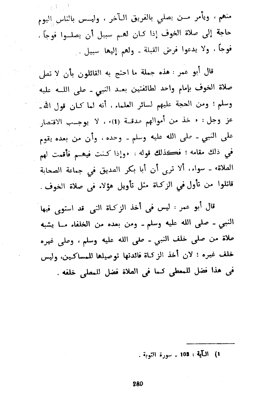 مِنْهُمْ وَيَأْمُرُ مَنْ يُصَلِّي بِالْفَرِيقِ الْآخَرِ وَلَيْسَ بِالنَّاسِ الْيَوْمَ حَاجَةٌ إِلَى صَلَاةِ الْخَوْفِ إِذَا كَانَ لَهُمْ سَبِيلٌ أَنْ يُصَلُّوا فَوْجًا فَوْجًا وَلَا يَدَعُوا فَرْضَ الْقِبْلَةِ وَلَهُمْ إِلَيْهَا سَبِيلٌ قَالَ أَبُو عُمَرَ هَذِهِ جُمْلَةُ مَا احْتَجَّ بِهِ الْقَائِلُونَ بِأَنْ لَا تُصَلَّى صَلَاةُ الْخَوْفِ بِإِمَامٍ وَاحِدٍ لِطَائِفَتَيْنِ بَعْدَ النَّبِيِّ صَلَّى اللَّهُ عَلَيْهِ وَسَلَّمَ وَمِنَ الْحُجَّةِ عَلَيْهِمْ لِسَائِرِ الْعُلَمَاءِ أَنَّهُ لَمَّا كَانَ قَوْلَ اللَّهِ عَزَّ وَجَلَّ خُذْ مِنْ أَمْوَالِهِمْ صَدَقَةً لَا يُوجِبُ الِاقْتِصَارَ عَلَى النَّبِيِّ صَلَّى اللَّهُ عَلَيْهِ وَسَلَّمَ وَحْدَهُ وَأَنَّ مَنْ بَعْدَهُ يَقُومُ فِي ذَلِكَ مَقَامَهُ فَكَذَلِكَ قَوْلُهُ وَإِذَا كُنْتَ فِيهِمْ فَأَقَمْتَ لَهُمُ الصَّلَاةَ سَوَاءً أَلَا تَرَى أَنَّ أَبَا بَكْرٍ الصِّدِّيقَ فِي جَمَاعَةِ الصَّحَابَةِ قَاتَلُوا مَنْ تَأَوَّلَ فِي الزَّكَاةِ مِثْلَ تَأْوِيلِ هَؤُلَاءِ فِي صَلَاةِ الْخَوْفِ قَالَ أَبُو عُمَرَ لَيْسَ فِي أَخْذِ الزَّكَاةِ الَّتِي قَدِ اسْتَوَى فِيهَا النَّبِيُّ صَلَّى اللَّهُ عَلَيْهِ وَسَلَّمَ وَمَنْ بَعْدَهُ مِنَ الْخُلَفَاءِ مَا يُشْبِهُ صَلَاةَ مَنْ صَلَّى خَلْفَ النَّبِيِّ صَلَّى اللَّهُ عَلَيْهِ وَسَلَّمَ وَصَلَّى غَيْرُهُ خَلْفَ غَيْرِهِ لِأَنَّ أَخْذَ الزَّكَاةِ فَائِدَتُهَا تَوْصِيلُهَا لِلْمَسَاكِينِ وَلَيْسَ فِي هَذَا فَضْلٌ لِلْمُعْطَى كَمَا فِي الصَّلَاةِ فَضْلٌ لِلْمُصَلَّى خَلْفَهُ