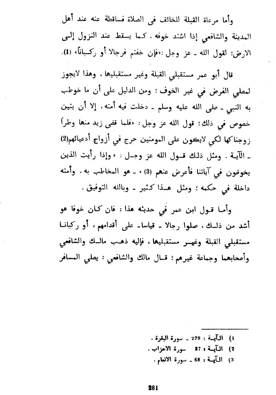 وَأَمَّا مُرَاعَاةُ الْقِبْلَةِ لِلْخَائِفِ فِي الصَّلَاةِ فَسَاقِطَةٌ عَنْهُ عِنْدَ أَهْلِ الْمَدِينَةِ وَالشَّافِعِيُّ إِذَا اشْتَدَّ خَوْفُهُ كَمَا يَسْقُطُ عِنْدَ النُّزُولِ إِلَى الْأَرْضِ لِقَوْلِ اللَّهِ عَزَّ وَجَلَّ فَإِنْ خِفْتُمْ فَرِجَالًا أَوْ رُكْبَانًا قَالَ أَبُو عُمَرَ مُسْتَقْبِلِي الْقِبْلَةِ وَغَيْرَ مُسْتَقْبِلِيهَا وَهَذَا لَا يَجُوزُ لِمُصَلِّي الْفَرْضِ فِي غَيْرِ الْخَوْفِ وَمِنَ الدَّلِيلِ عَلَى أَنَّ مَا خُوطِبَ بِهِ النَّبِيُّ صَلَّى اللَّهُ عَلَيْهِ وَسَلَّمَ دَخَلَتْ فِيهِ أُمَّتُهُ إِلَّا أَنْ يَتَبَيَّنَ خُصُوصٌ فِي ذَلِكَ قَوْلُ اللَّهِ عَزَّ وَجَلَّ فَلَمَّا قَضَى زَيْدٌ مِنْهَا وَطَرًا زَوَّجْنَاكَهَا لِكَيْ لَا يَكُونَ عَلَى الْمُؤْمِنِينَ حَرَجٌ فِي أَزْوَاجِ أَدْعِيَائِهِمْ الْآيَةَ وَمِثْلُ ذَلِكَ قَوْلُ اللَّهِ عَزَّ وَجَلَّ وَإِذَا رَأَيْتَ الَّذِينَ يَخُوضُونَ فِي آيَاتِنَا فَأَعْرِضْ عَنْهُمْ هُوَ الْمُخَاطَبُ بِهِ وَأُمَّتُهُ دَاخِلَةٌ فِي حُكْمِهِ وَمِثْلُ هَذَا كَثِيرٌ وَبِاللَّهِ التَّوْفِيقُ وَأَمَّا قَوْلُ ابْنِ عُمَرَ فِي حَدِيثِهِ هَذَا فَإِنْ كَانَ خَوْفًا هُوَ أَشَدُّ مِنْ ذَلِكَ صَلَّوْا رِجَالًا قِيَاسًا عَلَى أَقْدَامِهِمْ أَوْ رُكْبَانًا مُسْتَقْبِلِي الْقِبْلَةِ وَغَيْرَ مُسْتَقْبِلِيهَا فَإِلَيْهِ ذَهَبَ مَالِكٌ وَالشَّافِعِيُّ وَأَصْحَابُهُمَا وَجَمَاعَةٌ غَيْرُهُمْ قَالَ مَالِكٌ وَالشَّافِعِيُّ يصلي المسافر