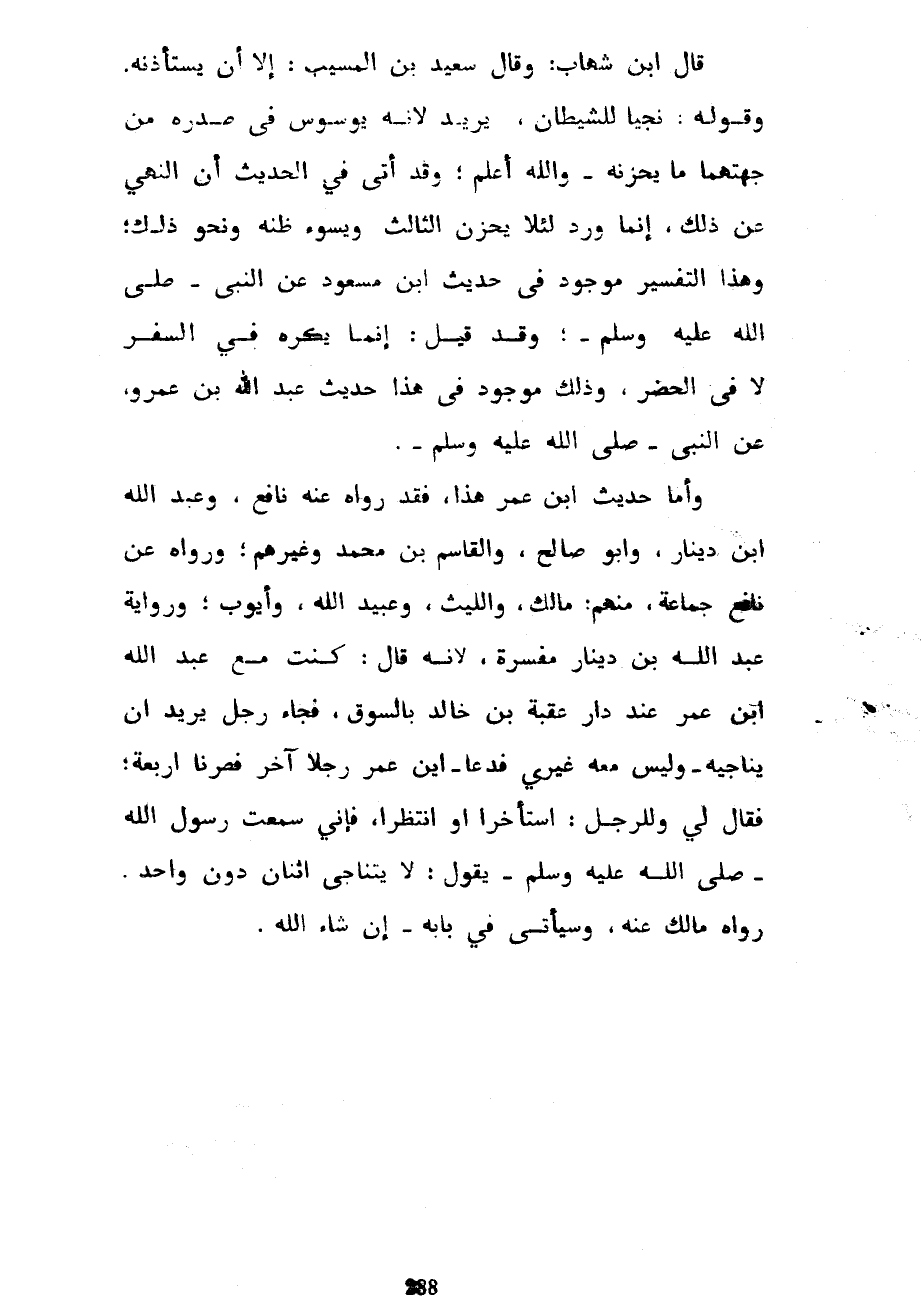 قَالَ ابْنُ شِهَابٍ وَقَالَ سَعِيدُ بْنُ الْمُسَيَّبِ إِلَّا أَنْ يَسْتَأْذِنَهُ وَقَوْلُهُ نَجِيًّا لِلشَّيْطَانِ يُرِيدُ لِأَنَّهُ يُوَسْوِسُ فِي صَدْرِهِ مِنْ جِهَتِهِمَا مَا يُحْزِنُهُ وَاللَّهُ أَعْلَمُ وَقَدْ أَتَى فِي الْحَدِيثِ أَنَّ النَّهْيَ عَنْ ذَلِكَ إِنَّمَا وَرَدَ لِئَلَّا يَحْزَنَ الثَّالِثُ وَيَسُوءُ ظَنُّهُ وَنَحْوُ ذَلِكَ وَهَذَا التَّفْسِيرُ مَوْجُودٌ فِي حَدِيثُ ابْنِ مَسْعُودٍ عَنِ النَّبِيِّ صَلَّى اللَّهُ عَلَيْهِ وَسَلَّمَ قَدْ قِيلَ إِنَّمَا يُكْرَهُ فِي السَّفَرِ لَا فِي الْحَضَرِ وَذَلِكَ مَوْجُودٌ فِي هَذَا حَدِيثِ عَبْدِ اللَّهِ بْنِ عُمَرَ عَنِ النَّبِيِّ صَلَّى اللَّهُ عَلَيْهِ وَسَلَّمَ وَأَمَّا حَدِيثُ ابْنِ عُمَرَ هَذَا فَقَدَ رَوَاهُ عَنْهُ نَافِعٌ وَعَبْدُ اللَّهِ بْنُ دِينَارٍ وَأَبُو صَالِحٍ وَالْقَاسِمُ بْنُ مُحَمَّدٍ وَغَيْرُهُمْ وَرَوَاهُ عن نافع جماعة منهم مالك والليث وَعُبَيْدُ اللَّهِ وَأَيُّوبُ وَرِوَايَةُ عَبْدِ اللَّهِ بْنِ دِينَارٍ مُفَسِّرَةٌ لِأَنَّهُ قَالَ كُنْتُ مَعَ عَبْدِ اللَّهِ بْنِ عُمَرَ عِنْدَ دَارِ عُقْبَةَ بْنِ خَالِدٍ بِالسُّوقِ فَجَاءَ رَجُلٌ يُرِيدُ أَنْ يُنَاجِيَهُ وَلَيْسَ مَعَهُ غَيْرِي فَدَعَا ابْنُ عُمَرَ رَجُلًا آخَرَ فَصِرْنَا أَرْبَعَةً فَقَالَ لِي وَلِلرَّجُلِ اسْتَأْخِرَا أَوِ انْتَظِرَا فَإِنِّي سَمِعْتُ رَسُولَ اللَّهِ صَلَّى اللَّهُ عَلَيْهِ وَسَلَّمَ يَقُولُ لَا يَتَنَاجَى اثْنَانِ دُونَ وَاحِدٍ رَوَاهُ مَالِكٌ عَنْهُ وَسَيَأْتِي فِي بَابِهِ إِنْ شَاءَ اللَّهُ