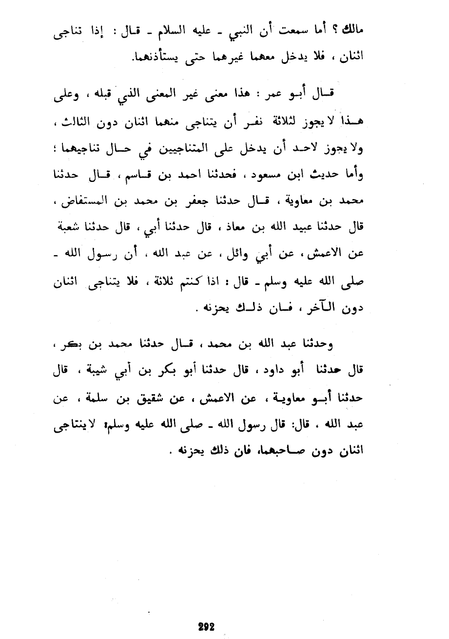 مَالِكٌ أَمَا سَمِعْتَ أَنَّ النَّبِيَّ عَلَيْهِ السَّلَامُ قَالَ إِذَا تَنَاجَى اثْنَانِ فَلَا يَدْخُلُ مَعَهُمَا غَيْرُهُمَا حَتَّى يَسْتَأْذِنَهُمَا قَالَ أَبُو عُمَرَ هَذَا مَعْنًى غَيْرُ الْمَعْنَى الَّذِي قَبْلَهُ وَعَلَى هَذَا لَا يَجُوزُ لِثَلَاثَةِ نَفَرٍ أَنْ يَتَنَاجَى مِنْهُمَا اثْنَانِ دُونَ الثَّالِثِ وَلَا يَجُوزُ لِأَحَدٍ أَنْ يَدْخُلَ عَلَى الْمُتَنَاجِيَيْنِ فِي حَالِ تَنَاجِيهِمَا وَأَمَّا حَدِيثُ ابْنِ مَسْعُودٍ فَحَدَّثَنَا أَحْمَدُ بْنُ قَاسِمٍ قَالَ حَدَّثَنَا مُحَمَّدُ بْنُ مُعَاوِيَةَ قَالَ حَدَّثَنَا جَعْفَرُ بْنُ مُحَمَّدِ بْنِ الْمُسْتَفَاضِ قَالَ حَدَّثَنَا عُبَيْدُ اللَّهِ بْنُ مُعَاذٍ قَالَ حَدَّثَنَا أَبِي قَالَ حَدَّثَنَا شُعْبَةُ عَنِ الْأَعْمَشِ عَنْ أَبِي وَائِلٍ عَنْ عَبْدِ اللَّهِ أَنَّ رَسُولَ اللَّهِ صَلَّى اللَّهُ عَلَيْهِ وَسَلَّمَ قَالَ إِذَا كُنْتُمْ ثَلَاثَةً فَلَا يَتَنَاجَى اثْنَانِ دُونَ الْآخَرِ فَإِنَّ ذَلِكَ يُحْزِنُهُ وَحَدَّثَنَا عَبْدُ اللَّهِ بْنُ مُحَمَّدٍ قَالَ حَدَّثَنَا مُحَمَّدُ بْنُ بَكْرٍ قَالَ حَدَّثَنَا أَبُو دَاوُدَ قَالَ حَدَّثَنَا أَبُو بَكْرِ بْنُ أَبِي شَيْبَةَ قَالَ حَدَّثَنَا أَبُو مُعَاوِيَةَ عَنِ الْأَعْمَشِ عَنْ شَقِيقِ بْنِ سَلَمَةَ عَنْ عَبْدِ اللَّهِ قَالَ قَالَ رَسُولُ اللَّهِ صَلَّى اللَّهُ عَلَيْهِ وَسَلَّمَ لَا يَتَنَاجَى اثْنَانِ دُونَ صَاحِبِهِمَا فَإِنَّ ذَلِكَ يُحْزِنُهُ