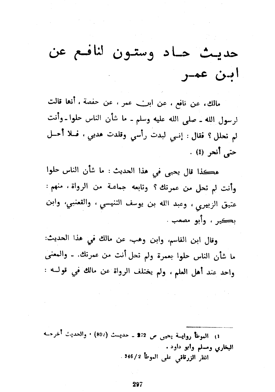 حَدِيثٌ حَادٍ وَسِتُّونَ لِنَافِعٍ عَنِ ابْنِ عُمَرَ مالك عَنْ نَافِعٍ عَنِ ابْنِ عُمَرَ عَنْ حَفْصَةَ أَنَّهَا قَالَتْ لِرَسُولِ اللَّهِ صَلَّى اللَّهُ عَلَيْهِ وَسَلَّمَ مَا شَأْنُ النَّاسِ حَلُّوا وَأَنْتَ لَمْ تَحْلِلْ فَقَالَ إِنِّي لَبَّدْتُ رَأْسِي وَقَلَّدْتُ هَدْيِي فَلَا أَحِلُّ حَتَّى أَنْحَرَ كَهَذَا قَالَ يَحْيَى فِي هَذَا الْحَدِيثِ مَا شَأْنُ النَّاسِ حَلُّوا وَأَنْتَ لَمْ تَحِلَّ مِنْ عُمْرَتِكَ وَتَابَعَهُ جَمَاعَةٌ مِنَ الرُّوَاةِ مِنْهُمْ عَتِيقٌ الزُّبَيْرِيُّ وَعَبْدُ اللَّهِ بْنُ يُوسُفَ التِّنِّيسِيُّ وَالْقَعْنَبِيُّ وَابْنُ بُكَيْرٍ وَأَبُو مُصْعَبٍ وَقَالَ ابْنُ الْقَاسِمِ وَابْنُ وَهْبٍ عَنْ مَالِكٍ فِي هَذَا الْحَدِيثِ مَا شَأْنُ النَّاسِ حَلُّوا بِعُمْرَةٍ وَلَمْ تَحِلَّ أَنْتَ مِنْ عُمْرَتِكَ وَالْمَعْنَى وَاحِدٌ عِنْدَ أَهْلِ الْعِلْمِ وَلَمْ يَخْتَلِفِ الرُّوَاةُ عَنْ مَالِكٍ فِي قَوْلِهِ
