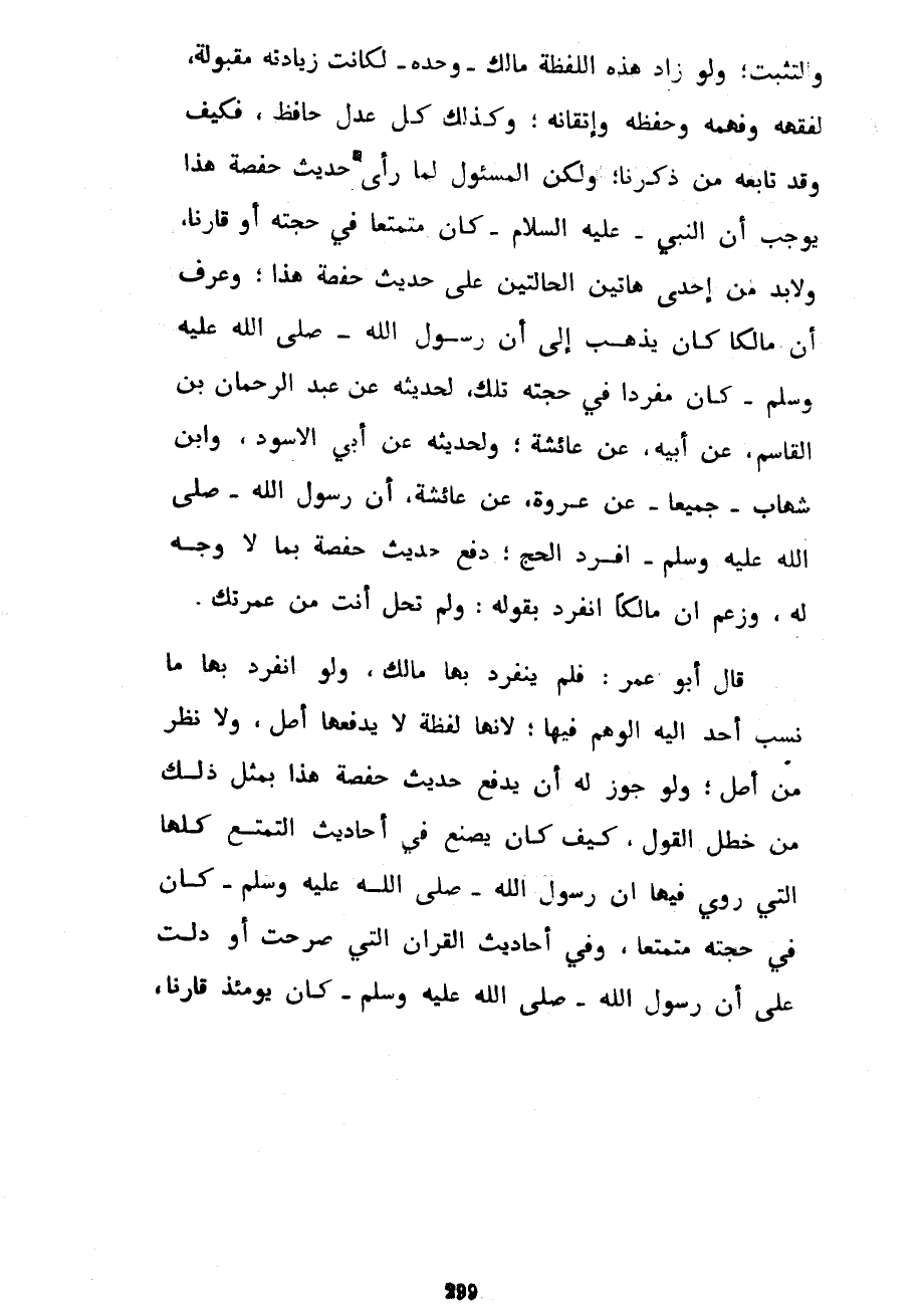 وَالتَّثَبُّتِ وَلَوْ زَادَ هَذِهِ اللَّفْظَةَ مَالِكٌ وَحْدَهُ لَكَانَتْ زِيَادَتُهُ مَقْبُولَةً لِفِقْهِهِ وَفَهْمِهِ وَحِفْظِهِ وَإِتْقَانِهِ وَكَذَلِكَ كُلُّ عَدْلٍ حَافِظٍ فَكَيْفَ وَقَدْ تَابَعَهُ مَنْ ذَكَرْنَا وَلَكِنَّ الْمَسْئُولَ لَمَّا رَأَى حَدِيثَ حَفْصَةَ هَذَا يُوجِبُ أَنَّ النَّبِيَّ عَلَيْهِ السَّلَامُ كان متمتعا في حجته أو قارنا ولا بد مِنْ إِحْدَى هَاتَيْنِ الْحَالَتَيْنِ عَلَى حَدِيثِ حَفْصَةَ هَذَا وَعَرَفَ أَنَّ مَالِكًا كَانَ يَذْهَبُ إِلَى أَنَّ رَسُولَ اللَّهِ صَلَّى اللَّهُ عَلَيْهِ وسلم كَانَ مُفْرِدًا فِي حَجَّتِهِ تِلْكَ لِحَدِيثِهِ عَنْ عبد الرحمان بْنِ الْقَاسِمِ عَنْ أَبِيهِ عَنْ عَائِشَةَ وَلِحَدِيثِهِ عَنْ أَبِي الْأَسْوَدِ وَابْنِ شِهَابٍ جَمِيعًا عَنْ عُرْوَةَ عَنْ عَائِشَةَ أَنَّ رَسُولَ اللَّهِ صَلَّى اللَّهُ عَلَيْهِ وَسَلَّمَ أَفْرَدَ الْحَجَّ دَفَعَ حَدِيثَ حَفْصَةَ بِمَا لَا وَجْهَ لَهُ وَزَعَمَ أَنَّ مَالِكًا انْفَرَدَ بِقَوْلِهِ وَلَمْ تَحِلَّ أَنْتَ مِنْ عُمْرَتِكَ قَالَ أَبُو عُمَرَ فَلَمْ يَنْفَرِدْ بِهَا مَالِكٌ وَلَوِ انْفَرَدَ بِهَا مَا نَسَبَ أَحَدٌ إِلَيْهِ الْوَهْمَ فِيهَا لِأَنَّهَا لَفْظَةٌ لَا يَدْفَعُهَا أَصْلٌ وَلَا نَظَرٌ مِنْ أَصْلٍ وَلَوْ جُوِّزَ لَهُ أَنْ يَدْفَعَ حَدِيثَ حَفْصَةَ هَذَا بِمِثْلِ ذَلِكَ مِنْ خَطَلِ الْقَوْلِ كَيْفَ كَانَ يَصْنَعُ فِي أَحَادِيثِ التَّمَتُّعِ كُلِّهَا الَّتِي رُوِيَ فِيهَا أن رسول الله صلى الله عليه وسلم كَانَ فِي حَجَّتِهِ مُتَمَتِّعًا وَفِي أَحَادِيثِ الْقِرَانِ الَّتِي صَرَّحَتْ أَوْ دَلَّتْ عَلَى أَنَّ رَسُولَ اللَّهِ صَلَّى اللَّهُ عَلَيْهِ وَسَلَّمَ كَانَ يَوْمَئِذٍ قارنا