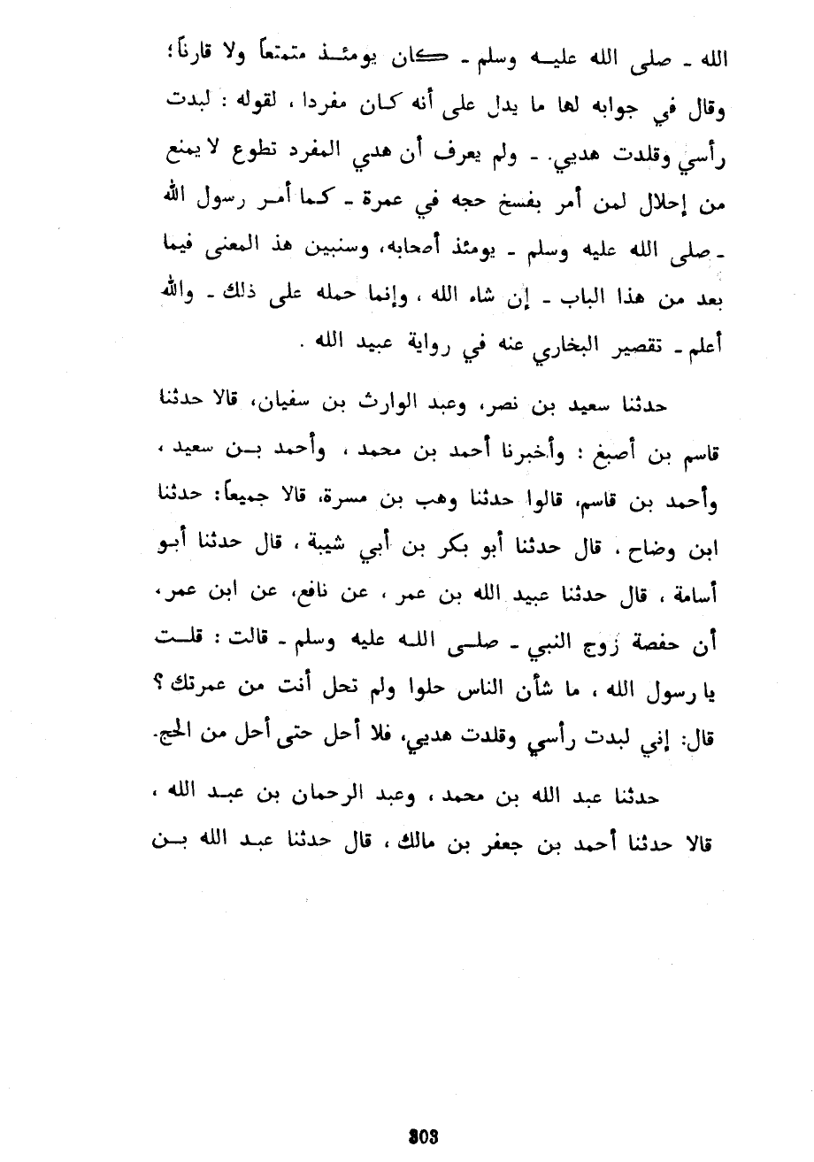 اللَّهِ صَلَّى اللَّهُ عَلَيْهِ وَسَلَّمَ كَانَ يَوْمَئِذٍ مُتَمَتِّعًا وَلَا قَارِنًا وَقَالَ فِي جَوَابِهِ لَهَا مَا يَدُلُّ عَلَى أَنَّهُ كَانَ مُفْرِدًا لِقَوْلِهِ لَبَّدْتُ رَأْسِي وَقَلَّدْتُ هَدْيِي وَلَمْ يَعْرِفْ أَنَّ هَدْيَ الْمُفْرِدِ تَطَوُّعٌ لَا يَمْنَعُ مِنْ إِحْلَالٍ لِمَنْ أُمِرَ بِفَسْخِ حَجِّهِ فِي عُمْرَةٍ كَمَا أَمَرَ رَسُولُ اللَّهِ صَلَّى اللَّهُ عَلَيْهِ وَسَلَّمَ يَوْمَئِذٍ أَصْحَابَهُ وَسَنُبَيِّنُ هَذَا الْمَعْنَى فِيمَا بَعْدُ مِنْ هَذَا الْبَابِ إِنْ شَاءَ اللَّهُ وَإِنَّمَا حَمَلَهُ عَلَى ذَلِكَ وَاللَّهُ أَعْلَمُ تَقْصِيرُ الْبُخَارِيِّ عَنْهُ فِي رِوَايَةِ عُبَيْدِ اللَّهِ حَدَّثَنَا سَعِيدُ بْنُ نَصْرٍ وَعَبْدُ الْوَارِثِ بْنُ سُفْيَانَ قَالَا حَدَّثَنَا قَاسِمُ بْنُ أَصْبَغَ وَأَخْبَرَنَا أَحْمَدُ بْنُ مُحَمَّدٍ وَأَحْمَدُ بْنُ سَعِيدٍ وَأَحْمَدُ بْنُ قَاسِمٍ قَالُوا حَدَّثَنَا وَهْبُ بْنُ مَسَرَّةَ قَالَا جَمِيعًا حَدَّثَنَا ابْنُ وَضَّاحٍ قَالَ حَدَّثَنَا أَبُو بَكْرِ بْنُ أَبِي شَيْبَةَ قَالَ حَدَّثَنَا أَبُو أُسَامَةَ قَالَ حَدَّثَنَا عُبَيْدُ اللَّهِ بْنُ عُمَرَ عَنْ نافع عن ابن عمر أن حَفْصَةُ زَوْجُ النَّبِيِّ صَلَّى اللَّهُ عَلَيْهِ وَسَلَّمَ قَالَتْ قُلْتُ يَا رَسُولَ اللَّهِ مَا شَأْنُ النَّاسِ حَلُّوا وَلَمْ تَحِلَّ أَنْتَ مِنْ عُمْرَتِكَ قَالَ إِنِّي لَبَّدْتُ رَأْسِي وَقَلَّدْتُ هَدْيِي فَلَا أَحِلُّ حَتَّى أَحِلَّ مِنَ الْحَجِّ حَدَّثَنَا عَبْدُ اللَّهِ بْنُ محمد وعبد الرحمان بْنُ عَبْدِ اللَّهِ قَالَا حَدَّثَنَا أَحْمَدُ بْنُ جَعْفَرِ بْنِ مَالِكٍ قَالَ حَدَّثَنَا عَبْدُ اللَّهِ بْنُ