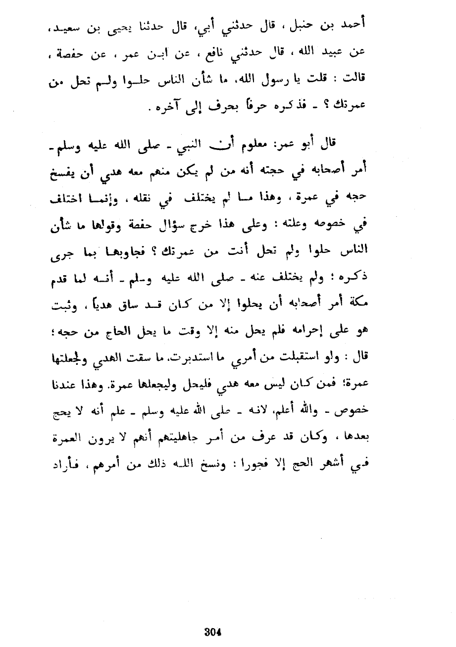 أَحْمَدَ بْنِ حَنْبَلٍ قَالَ حَدَّثَنِي أَبِي قَالَ حَدَّثَنَا يَحْيَى بْنُ سَعِيدٍ عَنْ عُبَيْدِ اللَّهِ قَالَ حَدَّثَنِي نَافِعٌ عَنِ ابن عمر عن حَفْصَةَ قَالَتْ قُلْتُ يَا رَسُولَ اللَّهِ مَا شَأْنُ النَّاسِ حَلُّوا وَلَمْ تَحِلَّ مِنْ عُمْرَتِكَ فَذَكَرَهُ حَرْفًا بِحَرْفٍ إِلَى آخِرِهِ قَالَ أَبُو عُمَرَ مَعْلُومٌ أَنَّ النَّبِيَّ صَلَّى اللَّهُ عَلَيْهِ وَسَلَّمَ أَمَرَ أَصْحَابَهُ فِي حَجَّتِهِ أَنَّهُ مَنْ لَمْ يَكُنْ مِنْهُمْ مَعَهُ هَدْيٌ أَنْ يَفْسَخَ حَجَّهُ فِي عُمْرَةٍ وَهَذَا مَا لَمْ يُخْتَلَفْ فِي نَقْلِهِ وَإِنَّمَا اخْتُلِفَ فِي خُصُوصِهِ وَعِلَّتِهِ وَعَلَى هَذَا خَرَجَ سُؤَالُ حَفْصَةَ وَقَوْلُهَا مَا شَأْنُ النَّاسِ حَلُّوا وَلَمْ تَحِلَّ أَنْتَ مِنْ عُمْرَتِكَ فَجَاوَبَهَا بِمَا جَرَى ذِكْرُهُ وَلَمْ يَخْتَلِفْ عَنْهُ صَلَّى اللَّهُ عَلَيْهِ وَسَلَّمَ أَنَّهُ لَمَّا قَدَّمَ مَكَّةَ أَمَرَ أَصْحَابَهُ أَنْ يَحِلُّوا إِلَّا مَنْ كَانَ قَدْ سَاقَ هَدْيًا وَثَبَتَ هُوَ عَلَى إِحْرَامِهِ فَلَمْ يَحِلَّ مِنْهُ إِلَّا وَقْتَ مَا يَحِلُّ الْحَاجُّ مِنْ حَجِّهِ قَالَ وَلَوِ اسْتَقْبَلْتُ مِنْ أَمْرِي مَا اسْتَدْبَرْتُ مَا سُقْتُ الْهَدْيَ وَلَجَعَلْتُهَا عُمْرَةً فَمَنْ كَانَ لَيْسَ مَعَهُ هَدْيٌ فَلْيَحِلَّ وَلْيَجْعَلْهَا عُمْرَةً وَهَذَا عِنْدَنَا خُصُوصٌ وَاللَّهُ أَعْلَمُ لِأَنَّهُ صَلَّى اللَّهُ عَلَيْهِ وَسَلَّمَ عَلِمَ أَنَّهُ لَا يَحُجُّ بَعْدَهَا وَكَانَ قَدْ عَرَفَ مِنْ أَمْرِ جَاهِلِيَّتِهِمْ أَنَّهُمْ لَا يَرَوْنَ الْعُمْرَةَ فِي أَشْهُرِ الْحَجِّ إِلَّا فُجُورًا وَنَسْخَ اللَّهُ ذَلِكَ مِنْ أَمْرِهِمْ فَأَرَادَ