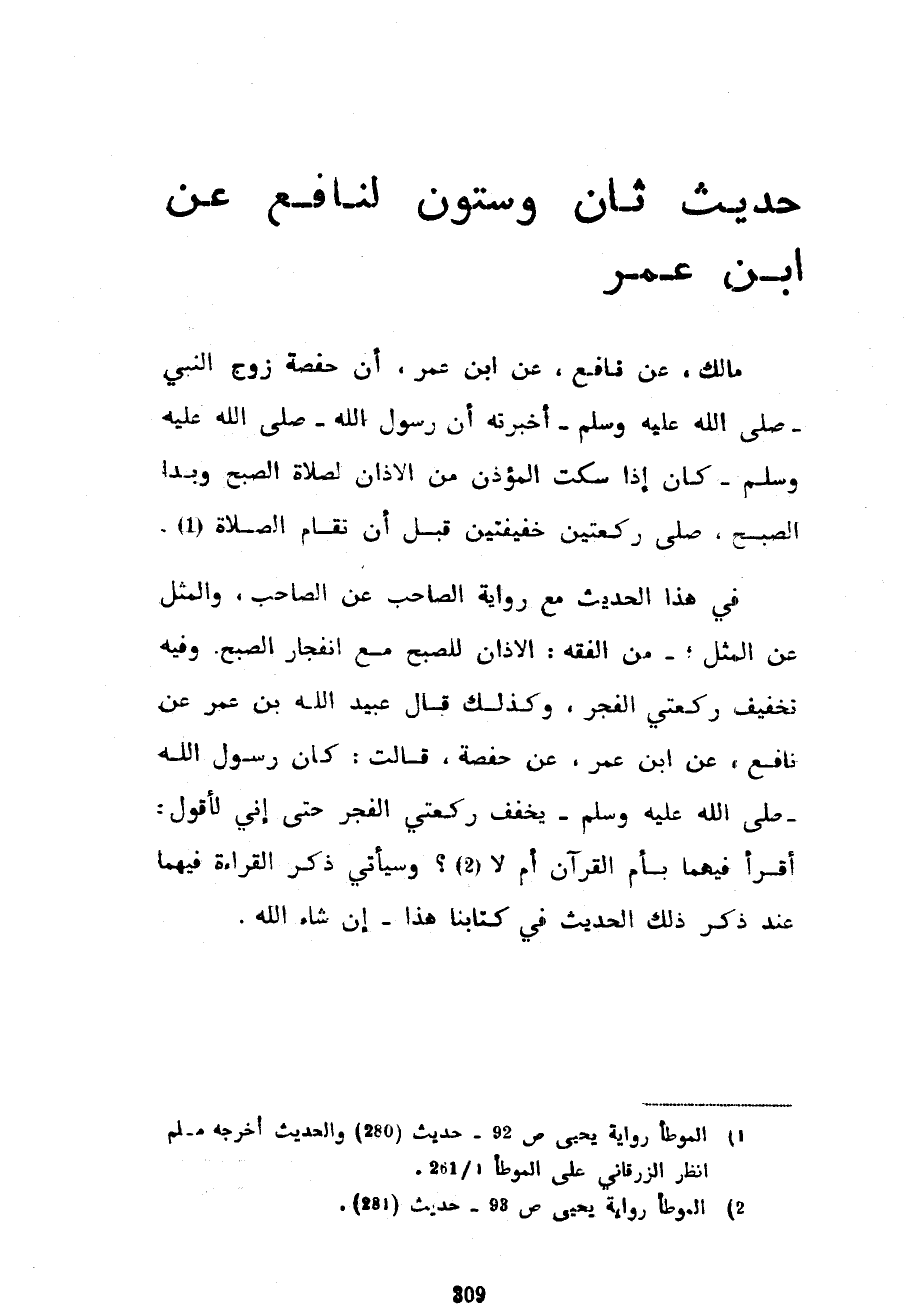 حَدِيثٌ ثَانٍ وَسِتُّونَ لِنَافِعٍ عَنِ ابْنِ عُمَرَ مَالِكٍ عَنْ نَافِعٍ عَنِ ابْنِ عُمَرَ أَنَّ حَفْصَةُ زَوْجُ النَّبِيِّ صَلَّى اللَّهُ عَلَيْهِ وَسَلَّمَ أَخْبَرَتْهُ أَنَّ رَسُولَ اللَّهِ صَلَّى اللَّهُ عَلَيْهِ وَسَلَّمَ كَانَ إِذَا سَكَتَ الْمُؤَذِّنُ مِنَ الْأَذَانِ لِصَلَاةِ الصُّبْحِ وَبَدَا الصُّبْحُ صَلَّى رَكْعَتَيْنِ خَفِيفَتَيْنِ قَبْلَ أَنْ تُقَامَ الصَّلَاةُ فِي هَذَا الْحَدِيثِ مَعَ رِوَايَةِ الصَّاحِبِ عَنِ الصَّاحِبِ وَالْمَثَلِ عَنِ الْمَثَلِ مِنَ الْفِقْهِ الْأَذَانُ لِلصُّبْحِ مَعَ انْفِجَارِ الصُّبْحِ وَفِيهِ تَخْفِيفُ رَكْعَتَيِ الْفَجْرِ وَكَذَلِكَ قَالَ عُبَيْدُ اللَّهِ بْنُ عُمَرَ عَنْ نَافِعٍ عن ابْنِ عُمَرَ عَنْ حَفْصَةَ قَالَتْ كَانَ رَسُولُ اللَّهِ صَلَّى اللَّهُ عَلَيْهِ وَسَلَّمَ يُخَفِّفُ رَكْعَتَيِ الْفَجْرِ حَتَّى إِنِّي لَأَقُولُ أَقَرَأَ فِيهِمَا بِأُمِّ الْقُرْآنِ أَمْ لَا وَسَيَأْتِي ذِكْرُ الْقِرَاءَةِ فِيهِمَا عند ذِكْرُ ذَلِكَ الْحَدِيثِ فِي كِتَابِنَا هَذَا إِنْ شَاءَ اللَّهُ