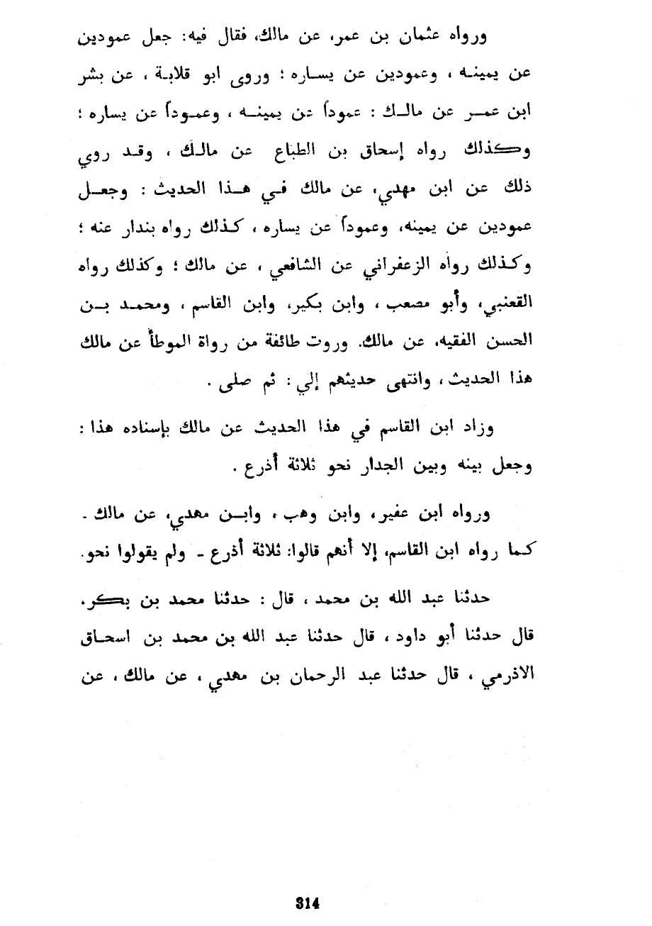 وَرَوَاهُ عُثْمَانُ بْنُ عُمَرَ عَنْ مَالِكٍ فَقَالَ فِيهِ جَعَلَ عَمُودَيْنِ عَنْ يَمِينِهِ وَعَمُودَيْنِ عَنْ يَسَارِهِ وَرَوَى أَبُو قِلَابَةَ عَنْ بِشْرِ بْنِ عُمَرَ عَنْ مَالِكٍ عَمُودًا عَنْ يَمِينِهِ وَعَمُودًا عَنْ يَسَارِهِ وَكَذَلِكَ رَوَاهُ إِسْحَاقُ بْنُ الطِّبَّاعِ عَنْ مَالِكٍ وَقَدْ رُوِيَ ذَلِكَ عَنِ ابْنِ مَهْدِيٍّ عَنْ مَالِكٍ فِي هَذَا الْحَدِيثِ وَجَعَلَ عَمُودَيْنِ عَنْ يَمِينِهِ وَعَمُودًا عَنْ يَسَارِهِ كَذَلِكَ رَوَاهُ بُنْدَارٌ عَنْهُ وَكَذَلِكَ رَوَاهُ الزَّعْفَرَانِيُّ عَنِ الشافعي عن مالك وكذلك رواه القعنبي وَأَبُو مُصْعَبٍ وَابْنُ بُكَيْرٍ وَابْنُ الْقَاسِمِ وَمُحَمَّدُ بْنُ الْحَسَنِ الْفَقِيهُ عَنْ مَالِكٍ وَرَوَتْ طَائِفَةٌ مِنْ رُوَاةِ الْمُوَطَّإِ عَنْ مَالِكٍ هَذَا الْحَدِيثَ وَانْتَهَى حَدِيثُهُمْ إِلَيَّ ثُمَّ صَلَّى وَزَادَ ابْنُ الْقَاسِمِ فِي هَذَا الْحَدِيثِ عَنْ مَالِكٍ بِإِسْنَادِهِ هَذَا وَجَعَلَ بَيْنَهُ وَبَيْنَ الْجِدَارِ نَحْوَ ثَلَاثَةِ أَذْرُعٍ وَرَوَاهُ ابْنُ عُفَيْرٍ وَابْنُ وَهْبٍ وَابْنُ مَهْدِيٍّ عَنْ مَالِكٍ كَمَا رَوَاهُ ابْنُ الْقَاسِمِ إِلَّا أَنَّهُمْ قَالُوا ثَلَاثَةَ أَذْرُعٍ وَلَمْ يَقُولُوا نَحْوَ حَدَّثَنَا عَبْدُ اللَّهِ بْنُ مُحَمَّدٍ قَالَ حَدَّثَنَا مُحَمَّدُ بْنُ بَكْرٍ قَالَ حَدَّثَنَا أَبُو دَاوُدَ قَالَ حَدَّثَنَا عَبْدُ اللَّهِ بْنُ مُحَمَّدِ بْنِ إسحاق الأذرمي قال حدثنا عبد الرحمان بْنُ مَهْدِيٍّ عَنْ مَالِكٍ عَنْ