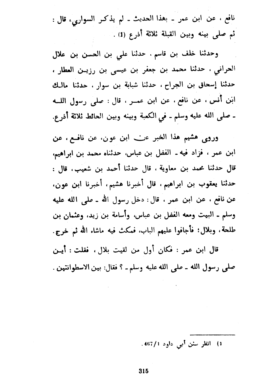 نَافِعٍ عَنِ ابْنِ عُمَرَ بِهَذَا الْحَدِيثِ لَمْ يَذْكُرِ السَّوَارِيَ قَالَ ثُمَّ صَلَّى بَيْنَهُ وَبَيْنَ الْقِبْلَةِ ثَلَاثَةُ أَذْرُعٍ وَحَدَّثَنَا خَلَفُ بْنُ قَاسِمٍ حَدَّثَنَا عَلِيُّ بْنُ الْحَسَنِ بْنِ عِلَالٍ الْحَرَّانِيُّ حَدَّثَنَا مُحَمَّدُ بْنُ جَعْفَرِ بْنِ عِيسَى بْنِ رزين العطار حدثنا إسحاق بن الجرااح حَدَّثَنَا شَبَابَةُ بْنُ سَوَّارٍ حَدَّثَنَا مَالِكِ بْنُ أَنَسٍ عَنْ نَافِعٍ عَنِ ابْنِ عُمَرَ قَالَ صَلَّى رَسُولُ اللَّهِ صَلَّى اللَّهُ عَلَيْهِ وَسَلَّمَ فِي الْكَعْبَةِ بَيْنَهُ وَبَيْنَ الْحَائِطِ ثَلَاثَةُ أَذْرُعٍ وَرَوَى هُشَيْمٌ هَذَا الْخَبَرَ عَنِ ابْنِ عَوْنٍ عَنْ نَافِعٍ عَنِ ابْنِ عُمَرَ فَزَادَ فِيهِ الْفَضْلَ بْنَ عَبَّاسٍ حَدَّثَنَاهُ مُحَمَّدُ بْنُ إِبْرَاهِيمَ قَالَ حَدَّثَنَا مُحَمَّدُ بْنُ مُعَاوِيَةَ قَالَ حَدَّثَنَا أَحْمَدُ بْنُ شُعَيْبٍ قَالَ حَدَّثَنَا يَعْقُوبُ بْنُ إِبْرَاهِيمَ قَالَ أَخْبَرَنَا هُشَيْمٌ أَخْبَرَنَا ابْنُ عَوْنٍ عَنْ نَافِعٍ عَنِ ابْنِ عُمَرَ قَالَ دَخَلَ رَسُولُ اللَّهِ صَلَّى اللَّهُ عَلَيْهِ وَسَلَّمَ الْبَيْتَ وَمَعَهُ الْفَضْلُ بْنُ عَبَّاسٍ وَأُسَامَةُ بْنُ زَيْدٍ وَعُثْمَانُ بْنُ طَلْحَةَ وَبِلَالٌ فَأَجَافُوا عَلَيْهِمُ الْبَابَ فَمَكَثَ فِيهِ مَا شَاءَ اللَّهُ ثُمَّ خَرَجَ قَالَ ابْنُ عُمَرَ فَكَانَ أَوَّلَ مَنْ لَقِيتُ بِلَالٌ فَقُلْتُ أَيْنَ صَلَّى رَسُولُ اللَّهِ صَلَّى اللَّهُ عَلَيْهِ وَسَلَّمَ فَقَالَ بَيْنَ الْأُسْطُوَانَتَيْنِ