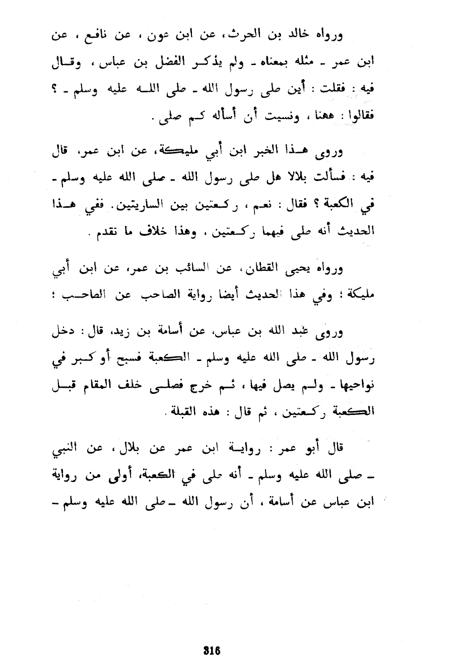 ورواه خالد بن الحرث عَنِ ابْنِ عَوْنٍ عَنْ نَافِعٍ عَنِ ابْنِ عمر مثله بمعناه وَلَمْ يَذْكُرِ الْفَضْلَ بْنَ عَبَّاسٍ وَقَالَ فِيهِ فَقُلْتُ أَيْنَ صَلَّى رَسُولُ اللَّهِ صَلَّى اللَّهُ عَلَيْهِ وَسَلَّمَ فقالوا ههنا وَنَسِيتُ أَنْ أَسْأَلَهُ كَمْ صَلَّى وَرَوَى هَذَا الْخَبَرَ ابْنُ أَبِي مُلَيْكَةَ عَنِ ابْنِ عُمَرَ قَالَ فِيهِ فَسَأَلْتُ بِلَالًا هَلْ صَلَّى رَسُولُ اللَّهِ صَلَّى اللَّهُ عَلَيْهِ وَسَلَّمَ فِي الْكَعْبَةِ فَقَالَ نَعَمْ رَكْعَتَيْنِ بَيْنَ السَّارِيَتَيْنِ فَفِي هَذَا الْحَدِيثِ أَنَّهُ صَلَّى فِيهِمَا رَكْعَتَيْنِ وَهَذَا خِلَافُ مَا تَقَدَّمَ وَرَوَاهُ يَحْيَى الْقَطَّانُ عَنِ السَّائِبِ بْنِ عُمَرَ عَنِ ابْنِ أَبِي مُلَيْكَةَ وَفِي هَذَا الْحَدِيثِ أَيْضًا رِوَايَةُ الصَّاحِبِ عَنِ الصَّاحِبِ وَرَوَى عَبْدُ اللَّهِ بْنُ عَبَّاسٍ عَنْ أُسَامَةَ بْنِ زَيْدٍ قَالَ دَخَلَ رَسُولُ اللَّهِ صَلَّى اللَّهُ عَلَيْهِ وَسَلَّمَ الْكَعْبَةَ فَسَبَّحَ أَوْ كَبَّرَ فِي نَوَاحِيهَا وَلَمْ يُصَلِّ فِيهَا ثُمَّ خَرَجَ فَصَلَّى خَلْفَ الْمَقَامِ قِبَلَ الْكَعْبَةِ رَكْعَتَيْنِ ثُمَّ قَالَ هَذِهِ الْقِبْلَةُ قَالَ أَبُو عُمَرَ رِوَايَةُ ابْنِ عُمَرَ عَنْ بِلَالٍ عَنِ النَّبِيِّ صَلَّى اللَّهُ عَلَيْهِ وَسَلَّمَ أَنَّهُ صَلَّى فِي الْكَعْبَةِ أَوْلَى مِنْ رِوَايَةِ ابْنِ عَبَّاسٍ عَنْ أُسَامَةَ أن رسول الله صلى الله عليه وسلم