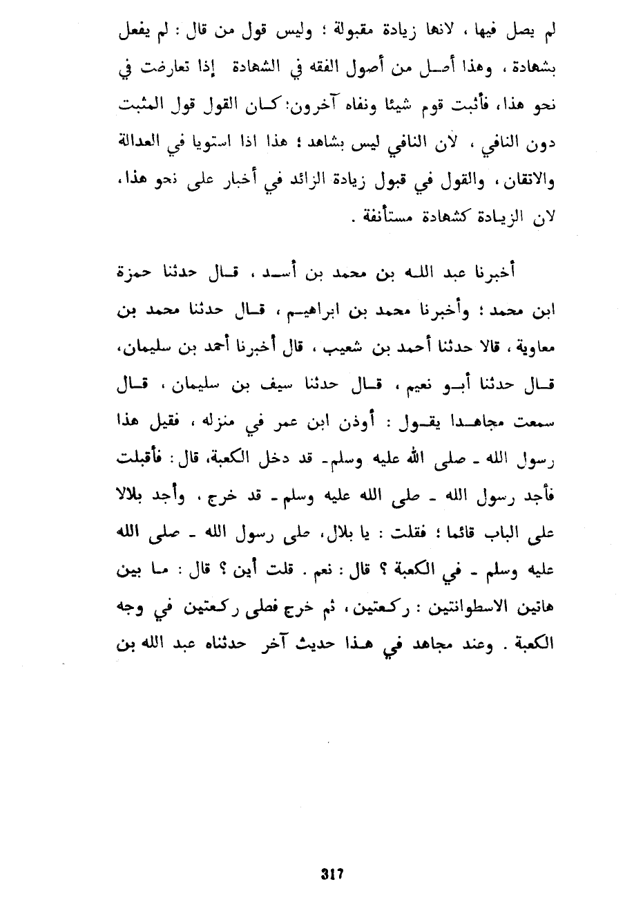 لَمْ يُصَلِّ فِيهَا لِأَنَّهَا زِيَادَةٌ مَقْبُولَةٌ وَلَيْسَ قَوْلُ مَنْ قَالَ لَمْ يَفْعَلْ بِشَهَادَةٍ وَهَذَا أَصْلٌ مِنْ أُصُولِ الْفِقْهِ فِي الشَّهَادَةِ إِذَا تَعَارَضَتْ فِي نَحْوِ هَذَا فَأَثْبَتَ قَوْمٌ شَيْئًا وَنَفَاهُ آخَرُونَ كَانَ الْقَوْلُ قَوْلَ الْمُثْبِتِ دُونَ النَّافِي لِأَنَّ النَّافِيَ لَيْسَ بِشَاهِدٍ هَذَا إِذَا اسْتَوَيَا فِي الْعَدَالَةِ وَالْإِتْقَانِ وَالْقَوْلِ فِي قَبُولِ زِيَادَةِ الزَّائِدِ فِي أَخْبَارٍ عَلَى نَحْوِ هَذَا لِأَنَّ الزِّيَادَةَ كَشَهَادَةٍ مُسْتَأْنَفَةٍ أَخْبَرَنَا عَبْدُ اللَّهِ بْنُ مُحَمَّدِ بْنِ أَسَدٍ قَالَ حَدَّثَنَا حَمْزَةُ بْنُ مُحَمَّدٍ وَأَخْبَرَنَا مُحَمَّدُ بْنُ إِبْرَاهِيمَ قَالَ حَدَّثَنَا مُحَمَّدُ بْنُ مُعَاوِيَةَ قَالَا حَدَّثَنَا أَحْمَدُ بْنُ شُعَيْبٍ قَالَ أَخْبَرَنَا أَحْمَدُ بْنُ سُلَيْمَانَ قَالَ حَدَّثَنَا أَبُو نُعَيْمٍ قَالَ حَدَّثَنَا سَيْفُ بْنُ سُلَيْمَانَ قَالَ سَمِعْتُ مُجَاهِدًا يَقُولُ أُوذِنَ ابْنُ عُمَرَ فِي مَنْزِلِهِ فَقِيلَ هَذَا رَسُولُ اللَّهِ صَلَّى اللَّهُ عَلَيْهِ وَسَلَّمَ قَدْ دَخَلَ الْكَعْبَةَ قَالَ فَأَقْبَلْتُ فَأَجِدُ رَسُولَ اللَّهِ صَلَّى اللَّهُ عَلَيْهِ وَسَلَّمَ قَدْ خَرَجَ وَأَجِدُ بِلَالًا عَلَى الْبَابِ قَائِمًا فَقُلْتُ يَا بِلَالُ صَلَّى رَسُولُ اللَّهِ صَلَّى اللَّهُ عَلَيْهِ وَسَلَّمَ في الْكَعْبَةِ قَالَ نَعَمْ قُلْتُ أَيْنَ قَالَ مَا بَيْنَ هَاتَيْنِ الْأُسْطُوَانَتَيْنِ رَكْعَتَيْنِ ثُمَّ خَرَجَ فَصَلَّى رَكْعَتَيْنِ فِي وَجْهِ الْكَعْبَةِ وَعِنْدَ مُجَاهِدٍ فِي هَذَا حَدِيثٌ آخَرُ حَدَّثَنَاهُ عَبْدُ اللَّهِ بْنُ