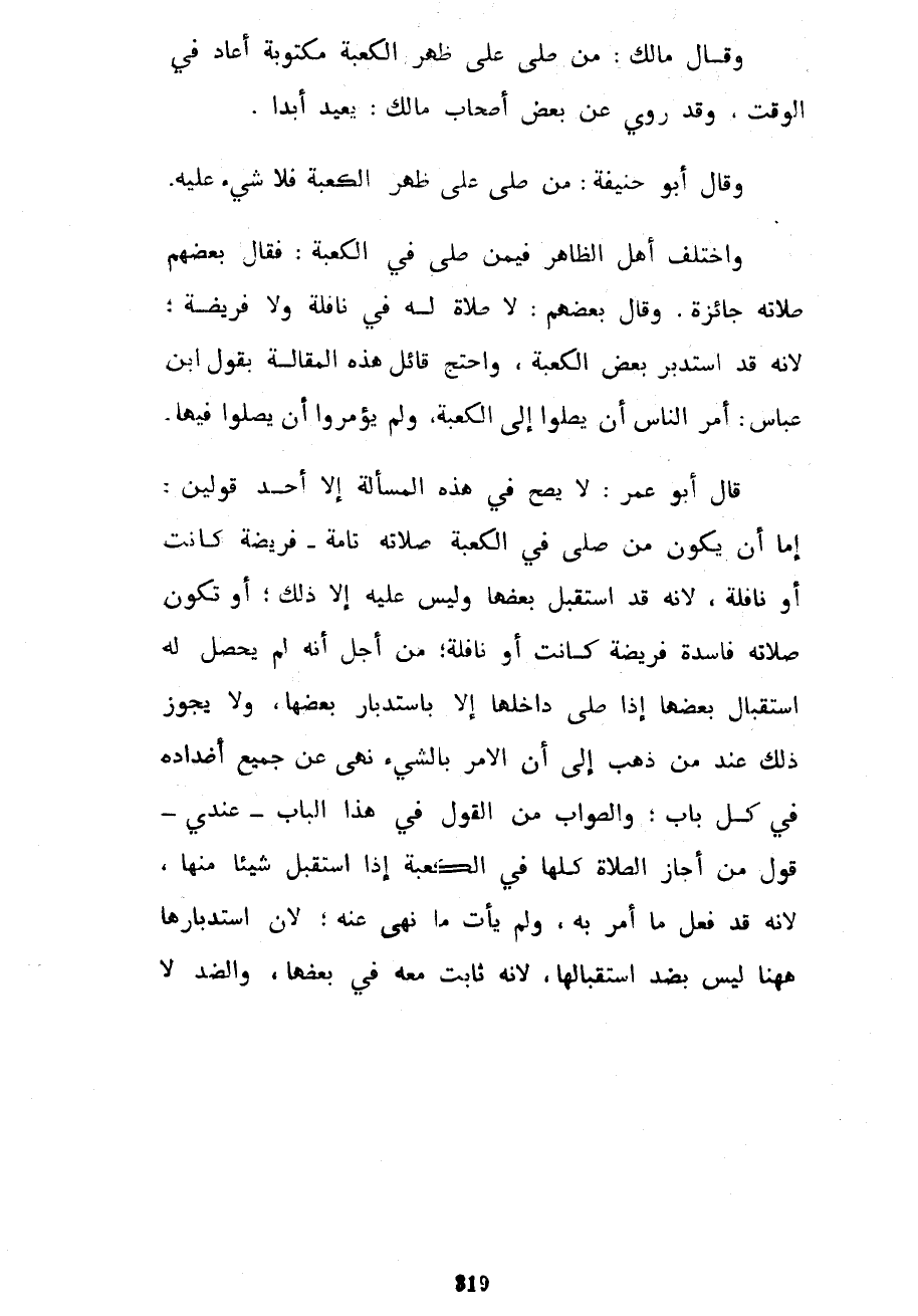 وَقَالَ مَالِكٌ مَنْ صَلَّى عَلَى ظَهْرِ الْكَعْبَةِ مَكْتُوبَةً أَعَادَ فِي الْوَقْتِ وَقَدْ رُوِيَ عَنْ بَعْضِ أَصْحَابِ مَالِكٍ يُعِيدُ أَبَدًا وَقَالَ أَبُو حَنِيفَةَ مَنْ صَلَّى عَلَى ظَهْرِ الْكَعْبَةِ فَلَا شَيْءَ عَلَيْهِ وَاخْتَلَفَ أَهْلُ الظَّاهِرِ فِيمَنْ صَلَّى فِي الْكَعْبَةِ فَقَالَ بَعْضُهُمْ صَلَاتُهُ جَائِزَةٌ وَقَالَ بَعْضُهُمْ لَا صَلَاةَ لَهُ فِي نَافِلَةٍ وَلَا فَرِيضَةٍ لِأَنَّهُ قَدِ اسْتَدْبَرَ بَعْضَ الْكَعْبَةِ وَاحْتَجَّ قَائِلُ هَذِهِ الْمَقَالَةِ بِقَوْلِ ابْنِ عَبَّاسٍ أُمِرَ النَّاسُ أَنْ يُصَلُّوا إِلَى الْكَعْبَةِ وَلَمْ يُؤْمَرُوا أَنْ يُصَلُّوا فِيهَا قَالَ أَبُو عُمَرَ لَا يَصِحُّ فِي هَذِهِ الْمَسْأَلَةِ إِلَّا أَحَدُ قَوْلَيْنِ إِمَّا أَنْ يَكُونَ مَنْ صَلَّى فِي الْكَعْبَةِ صَلَاتُهُ تَامَّةٌ فَرِيضَةً كَانَتْ أَوْ نَافِلَةً لِأَنَّهُ قَدِ اسْتَقْبَلَ بَعْضَهَا وَلَيْسَ عَلَيْهِ إِلَّا ذَلِكَ أَوْ تَكُونُ صَلَاتُهُ فَاسِدَةً فَرِيضَةً كَانَتْ أَوْ نَافِلَةً مِنْ أَجْلِ أَنَّهُ لَمْ يَحْصُلْ لَهُ اسْتِقْبَالُ بَعْضِهَا إِذَا صَلَّى دَاخِلَهَا إِلَّا بِاسْتِدْبَارِ بَعْضِهَا وَلَا يَجُوزُ ذَلِكَ عِنْدَ مَنْ ذَهَبَ إِلَى أَنَّ الْأَمْرَ بِالشَّيْءِ نَهْيٌ عَنْ جَمِيعِ أَضْدَادِهِ فِي كُلِّ بَابٍ وَالصَّوَابُ مِنَ الْقَوْلِ فِي هَذَا الْبَابِ عِنْدِي قَوْلُ مَنْ أَجَازَ الصَّلَاةَ كُلَّهَا فِي الْكَعْبَةِ إِذَا اسْتَقْبَلَ شَيْئًا مِنْهَا لِأَنَّهُ قَدْ فَعَلَ مَا أُمِرَ بِهِ وَلَمْ يَأْتِ مَا نُهِيَ عَنْهُ لِأَنَّ اسْتِدْبَارَهَا ههنا لَيْسَ بِضِدِّ اسْتِقْبَالِهَا لِأَنَّهُ ثَابِتٌ مَعَهُ فِي بَعْضِهَا وَالضِّدُّ لَا