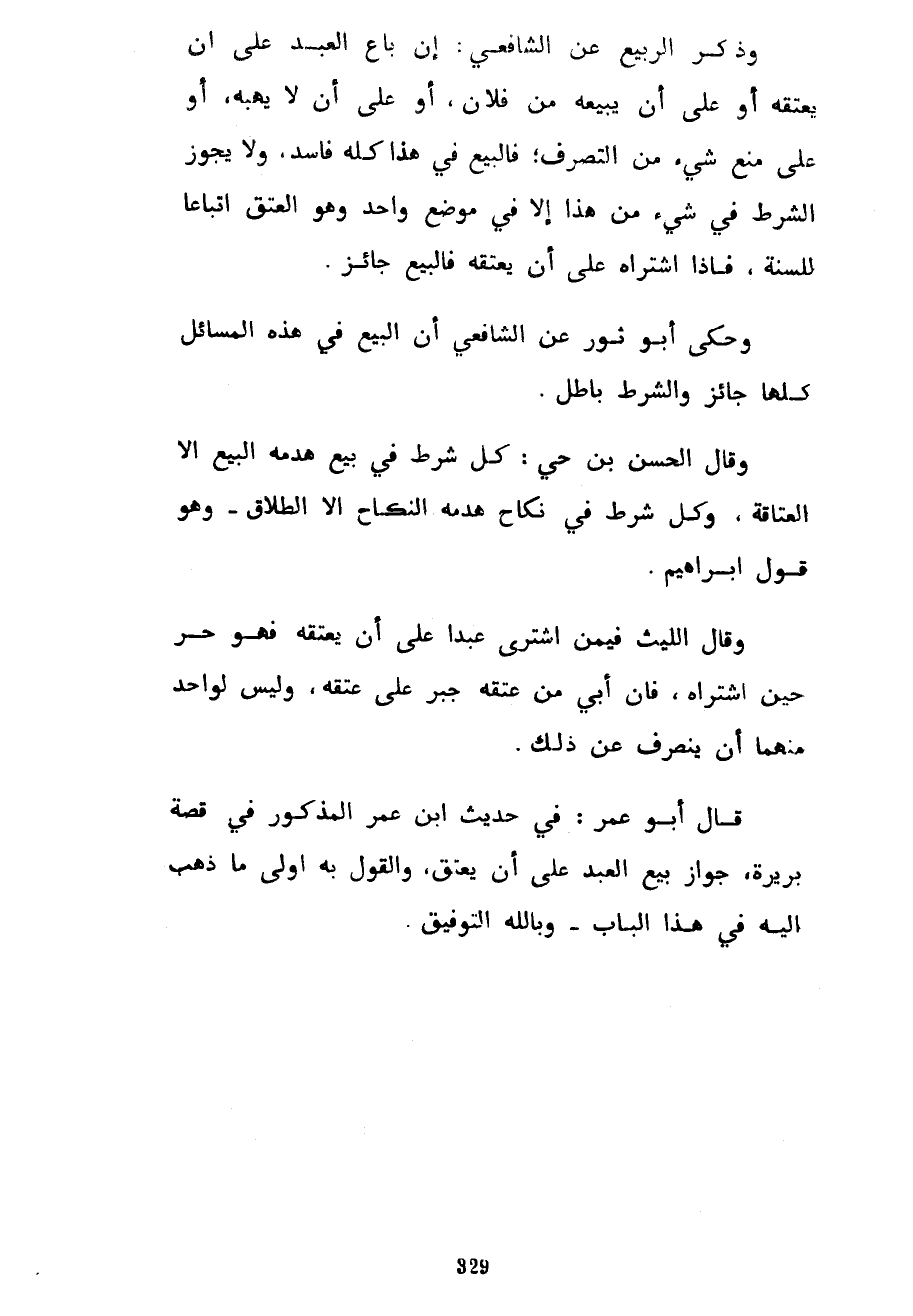 وَذَكَرَ الرَّبِيعُ عَنِ الشَّافِعِيِّ إِنْ بَاعَ الْعَبْدَ عَلَى أَنْ يُعْتِقَهُ أَوْ عَلَى أَنْ يَبِيعَهُ مِنْ فُلَانٍ أَوْ عَلَى أَنْ لَا يَهَبَهُ أَوْ عَلَى مَنْعِ شَيْءٍ مِنَ التَّصَرُّفِ فَالْبَيْعُ فِي هَذَا كُلِّهِ فَاسِدٌ وَلَا يَجُوزُ الشَّرْطُ فِي شَيْءٍ مِنْ هَذَا إِلَّا فِي مَوْضِعٍ وَاحِدٍ وَهُوَ الْعِتْقُ اتِّبَاعًا لِلسُّنَّةِ فَإِذَا اشْتَرَاهُ عَلَى أَنْ يُعْتِقَهُ فَالْبَيْعُ جَائِزٌ وَحَكَى أَبُو ثَوْرٍ عَنِ الشَّافِعِيِّ أَنَّ الْبَيْعَ فِي هَذِهِ الْمَسَائِلِ كُلِّهَا جَائِزٌ وَالشَّرْطُ بَاطِلٌ وَقَالَ الْحَسَنُ بْنُ حَيٍّ كُلُّ شَرْطٍ فِي بَيْعٍ هَدْمُهُ الْبَيْعُ إِلَّا الْعَتَاقَةَ وَكُلُّ شَرْطٍ فِي نِكَاحٍ هَدْمُهُ النِّكَاحُ إِلَّا الطَّلَاقَ وَهُوَ قَوْلُ إِبْرَاهِيمَ وَقَالَ اللَّيْثُ فِيمَنِ اشْتَرَى عَبْدًا عَلَى أَنْ يُعْتِقَهُ فَهُوَ حُرٌّ حِينَ اشْتَرَاهُ فَإِنْ أَبَى مَنْ عَتَقَهُ جُبِرَ عَلَى عِتْقِهِ وَلَيْسَ لِوَاحِدٍ مِنْهُمَا أَنْ يَنْصَرِفَ عَنْ ذَلِكَ قَالَ أَبُو عُمَرَ فِي حَدِيثِ ابْنِ عُمَرَ الْمَذْكُورِ فِي قِصَّةِ بَرِيرَةَ جَوَازُ بِيعِ الْعَبْدِ عَلَى أَنْ يُعْتَقَ وَالْقَوْلُ بِهِ أَوْلَى مَا ذَهَبَ إِلَيْهِ في هذا الباب وبالله التوفيق