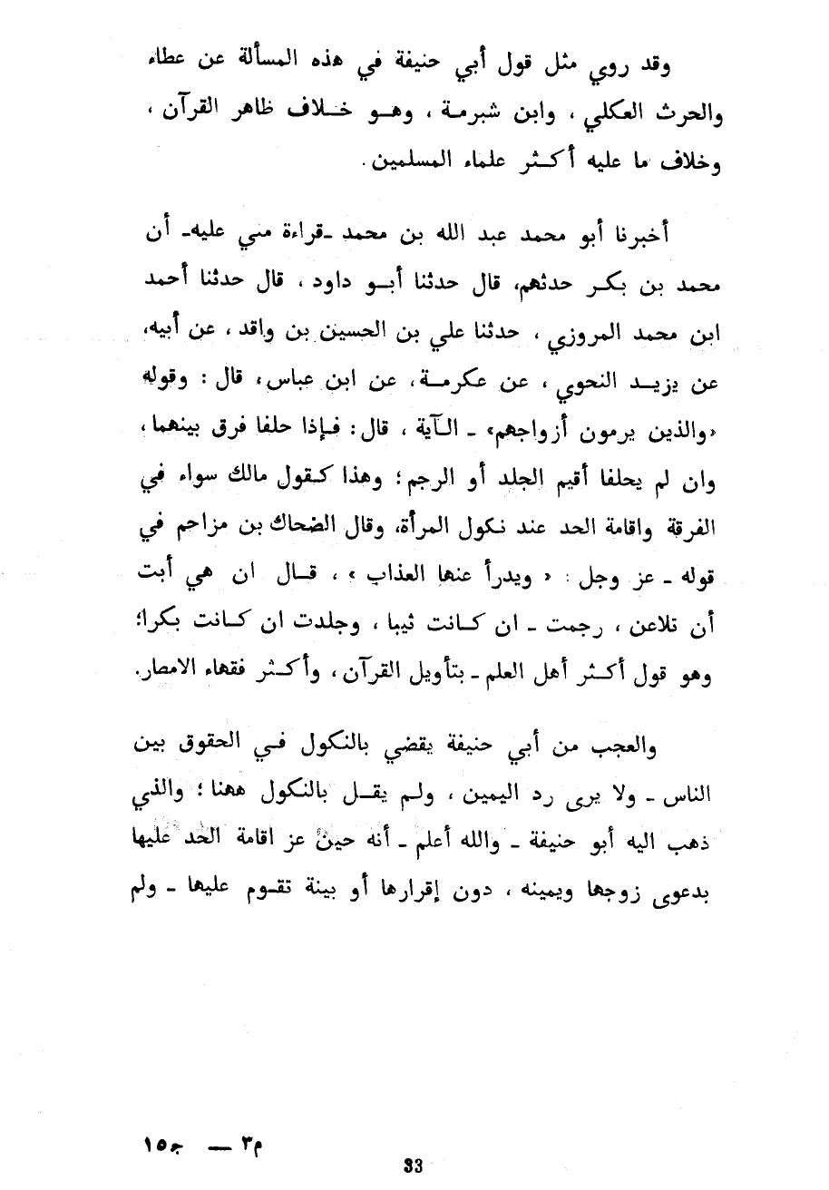 وَقَدْ رُوِيَ مِثْلُ قَوْلِ أَبِي حَنِيفَةَ فِي هَذِهِ الْمَسْأَلَةِ عن عطاء والحرث الْعُكْلِيِّ وَابْنِ شُبْرُمَةَ وَهُوَ خِلَافُ ظَاهِرِ الْقُرْآنِ وَخِلَافُ مَا عَلَيْهِ أَكْثَرُ عُلَمَاءِ الْمُسْلِمِينَ أَخْبَرَنَا أَبُو مُحَمَّدٍ عَبْدُ اللَّهِ بْنُ مُحَمَّدِ قِرَاءَةً مِنِّي عَلَيْهِ أَنَّ مُحَمَّدَ بْنَ بَكْرٍ حَدَّثَهُمْ قَالَ حَدَّثَنَا أَبُو دَاوُدَ قَالَ حَدَّثَنَا أَحْمَدُ بْنُ مُحَمَّدٍ الْمَرْوَزِيُّ حَدَّثَنَا عَلِيُّ بْنُ الْحُسَيْنِ بْنِ وَاقِدٍ عَنْ أَبِيهِ عَنْ يَزِيدَ النَّحْوِيِّ عَنْ عِكْرِمَةَ عَنِ ابْنِ عَبَّاسٍ قَالَ وَقَوْلُهُ وَالَّذِينَ يَرْمُونَ أَزْوَاجَهُمْ الْآيَةَ قَالَ فَإِذَا حَلَفَا فُرِّقَ بَيْنَهُمَا وَإِنْ لَمْ يَحْلِفَا أُقِيمَ الْجَلْدُ أَوِ الرَّجْمُ وَهَذَا كَقَوْلِ مَالِكٍ سَوَاءٌ فِي الْفُرْقَةِ وَإِقَامَةِ الْحَدِّ عِنْدَ نُكُولِ الْمَرْأَةِ وَقَالَ الضَّحَّاكُ بْنُ مُزَاحِمٍ فِي قَوْلِهِ عَزَّ وَجَلَّ وَيَدْرَأُ عَنْهَا الْعَذَابَ قَالَ إِنْ هِيَ أَبَتْ أَنْ تُلَاعِنَ رُجِمَتْ إِنْ كَانَتْ ثَيِّبًا وَجُلِدَتْ إِنْ كَانَتْ بِكْرًا وَهُوَ قَوْلُ أَكْثَرِ أَهْلِ الْعِلْمِ بِتَأْوِيلِ الْقُرْآنِ وَأَكْثَرِ فُقَهَاءِ الْأَمْصَارِ وَالْعَجَبُ مِنْ أَبِي حَنِيفَةَ يَقْضِي بِالنُّكُولِ فِي الْحُقُوقِ بَيْنَ النَّاسِ وَلَا يَرَى رَدَّ الْيَمِينِ وَلَمْ يقل بالنكول ههنا وَالَّذِي ذَهَبَ إِلَيْهِ أَبُو حَنِيفَةَ وَاللَّهُ أَعْلَمُ أَنَّهُ حِينَ عَزَّ إِقَامَةُ الْحَدِّ عَلَيْهَا بِدَعْوَى زَوْجِهَا وَيَمِينِهِ دُونَ إِقْرَارِهَا أَوْ بَيِّنَةٍ تَقُومُ عليها ولم
