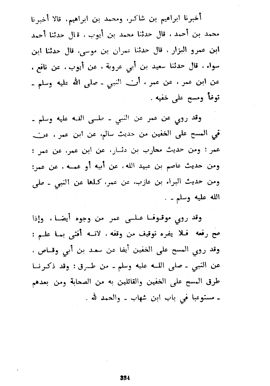 أَخْبَرَنَا إِبْرَاهِيمُ بْنُ شَاكِرٍ وَمُحَمَّدُ بْنُ إِبْرَاهِيمَ قَالَا أَخْبَرَنَا مُحَمَّدِ بْنِ أَحْمَدَ قَالَ حَدَّثَنَا مُحَمَّدُ بْنُ أَيُّوبَ قَالَ حَدَّثَنَا أَحْمَدُ بْنُ عَمْرٍو الْبَزَّارُ قَالَ حَدَّثَنَا عِمْرَانُ بْنُ مُوسَى قَالَ حَدَّثَنَا ابْنُ سَوَاءٍ قَالَ حَدَّثَنَا سَعِيدُ بْنُ أَبِي عَرُوبَةَ عَنْ أَيُّوبَ عَنْ نَافِعٍ عَنِ ابْنِ عُمَرَ عَنِ عُمَرَ أَنَّ النَّبِيَّ صَلَّى اللَّهُ عَلَيْهِ وَسَلَّمَ تَوَضَّأَ وَمَسَحَ عَلَى خُفَّيْهِ وَقَدْ رُوِيَ عَنْ عُمَرَ عَنِ النَّبِيِّ صَلَّى اللَّهُ عَلَيْهِ وَسَلَّمَ فِي الْمَسْحِ عَلَى الْخُفَّيْنِ مِنْ حَدِيثِ سَالِمٍ عَنِ ابْنِ عُمَرَ عَنْ عُمَرَ وَمِنْ حَدِيثِ مُحَارِبِ بْنِ دِثَارٍ عَنِ ابْنِ عُمَرَ عَنْ عُمَرَ وَمِنْ حَدِيثِ عَاصِمِ بْنِ عُبَيْدِ اللَّهِ عَنْ أَبِيهِ أَوْ عَمِّهِ عَنْ عُمَرَ وَمِنْ حَدِيثِ الْبَرَاءِ بْنِ عَازِبٍ عَنْ عُمَرَ كُلُّهَا عَنِ النَّبِيِّ صَلَّى اللَّهُ عَلَيْهِ وَسَلَّمَ وَقَدْ رُوِيَ مَوْقُوفًا عَلَى عُمَرَ مِنْ وُجُوهٍ أَيْضًا وَإِذَا صَحَّ رَفْعُهُ فَلَا يَضُرُّهُ تَوْقِيفُ مَنْ وَقَفَهُ لِأَنَّهُ أَفْتَى بِمَا عَلِمَ وَقَدْ رُوِيَ الْمَسْحُ عَلَى الْخُفَّيْنِ أَيْضًا عَنْ سَعْدِ بْنِ أَبِي وَقَّاصٍ عَنِ النَّبِيِّ صَلَّى اللَّهُ عَلَيْهِ وَسَلَّمَ مِنْ طُرُقٍ وَقَدْ ذَكَرْنَا طُرُقَ الْمَسْحِ عَلَى الْخُفَّيْنِ وَالْقَائِلِينَ بِهِ مِنَ الصَّحَابَةِ وَمَنْ بَعْدَهُمْ مُسْتَوْعَبًا فِي بَابِ ابْنِ شِهَابٍ وَالْحَمْدُ لِلَّهِ