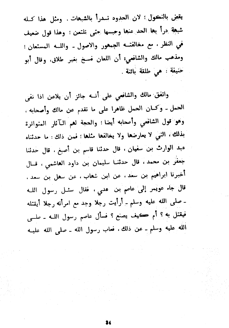 يَقْضِ بِالنُّكُولِ لِأَنَّ الْحُدُودَ تُدْرَأُ بِالشُّبُهَاتِ وَمِثْلُ هَذَا كُلِّهِ شُبْهَةٌ دَرَأَ بِهَا الْحَدَّ عَنْهَا وَحَبَسَهَا حَتَّى تَلْتَعِنَ وَهَذَا قَوْلٌ ضَعِيفٌ فِي النَّظَرِ مَعَ مُخَالَفَتِهِ الْجُمْهُورَ وَالْأُصُولَ وَاللَّهُ الْمُسْتَعَانُ وَمَذْهَبُ مَالِكٍ وَالشَّافِعِيِّ أَنَّ اللِّعَانَ فَسْخٌ بِغَيْرِ طَلَاقٍ وَقَالَ أَبُو حَنِيفَةَ هِيَ طَلْقَةٌ بَائِنَةٌ وَاتَّفَقَ مَالِكٌ وَالشَّافِعِيُّ عَلَى أَنَّهُ جَائِزٌ أَنْ يُلَاعِنَ إِذَا نَفَى الْحَمْلَ وَكَانَ الْحَمْلُ ظَاهِرًا عَلَى مَا تَقَدَّمَ عَنْ مَالِكٍ وَأَصْحَابِهِ وَهُوَ قَوْلُ الشَّافِعِيِّ وَأَصْحَابِهِ أَيْضًا وَالْحُجَّةُ لَهُمُ الْآثَارُ الْمُتَوَاتِرَةُ بِذَلِكَ الَّتِي لَا يُعَارِضُهَا وَلَا يُخَالِفُهَا مِثْلُهَا فَمِنْ ذَلِكَ مَا حَدَّثَنَاهُ عَبْدُ الْوَارِثِ بْنُ سُفْيَانَ قَالَ حَدَّثَنَا قَاسِمُ بْنُ أَصْبَغَ قَالَ حَدَّثَنَا جَعْفَرُ بْنُ مُحَمَّدٍ قَالَ حَدَّثَنَا سُلَيْمَانُ بْنُ دَاوُدَ الْهَاشِمِيُّ قَالَ أَخْبَرَنَا إِبْرَاهِيمُ بْنُ سَعْدٍ عَنِ ابْنِ شِهَابٍ عَنْ سَهْلِ بْنِ سَعْدٍ قَالَ جَاءَ عُوَيْمِرٌ إِلَى عَاصِمِ بْنِ عَدِيٍّ فَقَالَ سُئِلَ رَسُولُ اللَّهِ صَلَّى اللَّهُ عَلَيْهِ وَسَلَّمَ أَرَأَيْتَ رَجُلًا وَجَدَ مَعَ امْرَأَتِهِ رَجُلًا أَيَقْتُلُهُ فَيُقْتَلُ بِهِ أَمْ كَيْفَ يَصْنَعُ فَسَأَلَ عَاصِمٌ رَسُولَ اللَّهِ صَلَّى اللَّهُ عَلَيْهِ وَسَلَّمَ عَنْ ذَلِكَ فَعَابَ رَسُولُ اللَّهِ صَلَّى اللَّهُ عَلَيْهِ وَسَلَّمَ
