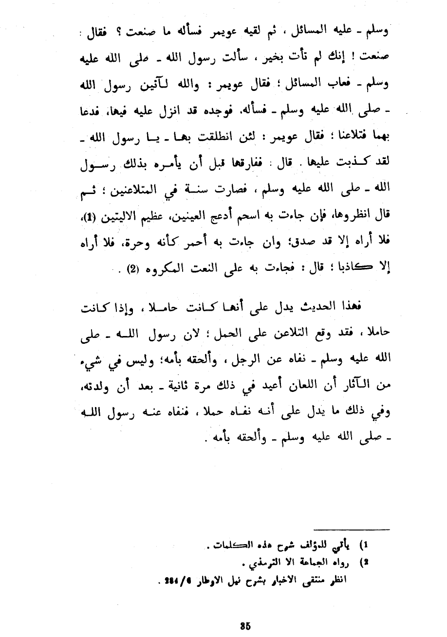 عَلَيْهِ الْمَسَائِلَ ثُمَّ لَقِيَهُ عُوَيْمِرٌ فَسَأَلَهُ مَا صَنَعْتَ فَقَالَ صَنَعْتُ إِنَّكَ لَمْ تَأْتِ بِخَيْرٍ سَأَلْتُ رَسُولَ اللَّهِ صَلَّى اللَّهُ عَلَيْهِ وَسَلَّمَ فَعَابَ الْمَسَائِلَ فَقَالَ عُوَيْمِرٌ وَاللَّهِ لَآتِيَنَّ رَسُولِ اللَّهِ صَلَّى اللَّهُ عَلَيْهِ وَسَلَّمَ فَسَأَلَهُ فَوَجَدَهُ قَدْ أُنْزِلَ عَلَيْهِ فِيهَا فَدَعَا بِهِمَا فَتَلَاعَنَا فَقَالَ عُوَيْمِرٌ لَئِنِ انْطَلَقْتُ بِهَا يَا رَسُولَ اللَّهِ لَقَدْ كَذَبْتُ عَلَيْهَا قَالَ فَفَارَقَهَا قَبْلَ أَنْ يَأْمُرَهُ بِذَلِكَ رَسُولُ اللَّهِ صَلَّى اللَّهُ عَلَيْهِ وَسَلَّمَ فَصَارَتْ سُنَّةً فِي الْمُتَلَاعِنَيْنِ ثُمَّ قَالَ انْظُرُوهَا فَإِنْ جَاءَتْ بِهِ أَسْحَمَ أَدْعَجَ الْعَيْنَيْنِ عَظِيمَ الْإِلْيَتَيْنِ فَلَا أُرَاهُ إِلَّا قَدْ صَدَقَ وَإِنْ جَاءَتْ بِهِ أَحْمَرَ كَأَنَّهُ وَحَرَةٌ فَلَا أُرَاهُ إِلَّا كَاذِبًا قَالَ فَجَاءَتْ بِهِ عَلَى النَّعْتِ الْمَكْرُوهِ فَهَذَا الْحَدِيثُ يَدُلُّ عَلَى أَنَّهَا كَانَتْ حَامِلًا وَإِذَا كَانَتْ حَامِلًا فَقَدْ وَقَعَ التَّلَاعُنُ عَلَى الْحَمْلِ لِأَنَّ رَسُولَ اللَّهِ صَلَّى اللَّهُ عَلَيْهِ وَسَلَّمَ نَفَاهُ عَنِ الرَّجُلِ وَأَلْحَقَهُ بِأُمِّهِ وَلَيْسَ فِي شَيْءٍ مِنَ الْآثَارِ أَنَّ اللِّعَانَ أُعِيدَ فِي ذَلِكَ مَرَّةً ثَانِيَةً بَعْدَ أَنْ وَلَدَتْهُ وَفِي ذَلِكَ مَا يَدُلُّ عَلَى أَنَّهُ نَفَاهُ حَمْلًا فَنَفَاهُ عَنْهُ رَسُولُ اللَّهِ صَلَّى اللَّهُ عَلَيْهِ وَسَلَّمَ وَأَلْحَقَهُ بِأُمِّهِ