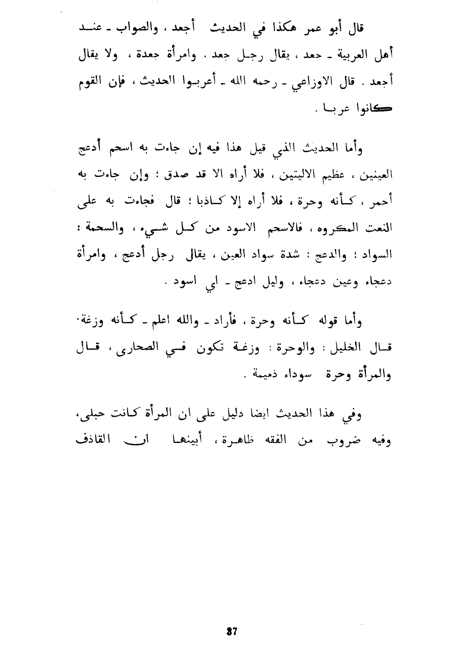 قَالَ أَبُو عُمَرَ هَكَذَا فِي الْحَدِيثِ أَجْعَدَ وَالصَّوَابُ عِنْدَ أَهْلِ الْعَرَبِيَّةِ جَعْدٌ يُقَالُ رَجُلٌ جَعْدٌ وَامْرَأَةٌ جَعْدَةٌ وَلَا يُقَالُ أَجْعَدُ قَالَ الْأَوْزَاعِيُّ رَحِمَهُ اللَّهُ أَعْرِبُوا الْحَدِيثَ فَإِنَّ الْقَوْمَ كَانُوا عَرَبًا وَأَمَّا الْحَدِيثُ الَّذِي قِيلَ هَذَا فِيهِ إِنْ جَاءَتْ بِهِ أَسْحَمَ أَدْعَجَ الْعَيْنَيْنِ عَظِيمَ الْإِلْيَتَيْنِ فَلَا أُرَاهُ إِلَّا قَدْ صَدَقَ وَإِنْ جَاءَتْ بِهِ أَحْمَرَ كَأَنَّهُ وَحَرَةٌ فَلَا أُرَاهُ إِلَّا كَاذِبًا قَالَ فَجَاءَتْ بِهِ عَلَى النَّعْتِ الْمَكْرُوهِ فَالْأَسْحَمُ الْأَسْوَدُ مِنْ كُلِّ شَيْءٍ وَالسُّحْمَةُ السَّوَادُ وَالدَّعَجُ شِدَّةُ سَوَادِ الْعَيْنِ يُقَالُ رَجُلٌ أَدْعَجُ وَامْرَأَةٌ دَعْجَاءُ وَعَيْنٌ دَعْجَاءُ وَلَيْلٌ أَدْعَجُ أَيْ أَسْوَدُ وَأَمَّا قَوْلُهُ كَأَنَّهُ وَحَرَةٌ فَأَرَادَ وَاللَّهُ أَعْلَمُ كَأَنَّهُ وَزَغَةٌ قَالَ الْخَلِيلُ وَالْوَحَرَةُ وَزَغَةٌ تَكُونُ فِي الصَّحَارِي قَالَ وَالْمَرْأَةُ وَحَرَةٌ سَوْدَاءُ ذَمِيمَةٌ وَفِي هَذَا الْحَدِيثِ أَيْضًا دَلِيلٌ عَلَى أَنَّ الْمَرْأَةَ كَانَتْ حُبْلَى وَفِيهِ ضُرُوبٌ مِنَ الْفِقْهِ ظَاهِرَةٌ أَبْيَنُهَا أَنَّ الْقَاذِفَ
