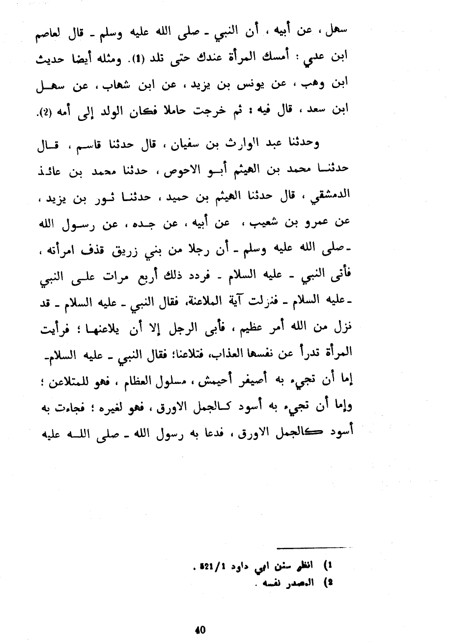 سَهْلٍ عَنْ أَبِيهِ أَنَّ النَّبِيَّ صَلَّى اللَّهُ عَلَيْهِ وَسَلَّمَ قَالَ لِعَاصِمِ بْنِ عَدِيٍّ أَمْسِكِ الْمَرْأَةَ عِنْدَكَ حَتَّى تَلِدَ وَمِثلُهُ أَيْضًا حَدِيثُ ابْنُ وَهْبٍ عَنْ يُونُسَ بْنِ يَزِيدَ عَنِ ابْنِ شِهَابٍ عَنْ سَهْلِ بْنِ سَعْدٍ قَالَ فِيهِ ثُمَّ خَرَجَتْ حَامِلًا فَكَانَ الْوَلَدُ إِلَى أُمِّهِ وَحَدَّثَنَا عَبْدُ الْوَارِثِ بْنُ سُفْيَانَ قَالَ حَدَّثَنَا قَاسِمٌ قَالَ حَدَّثَنَا مُحَمَّدُ بْنُ الْهَيْثَمِ أَبُو الْأَحْوَصِ حَدَّثَنَا مُحَمَّدُ بْنُ عَائِذٍ الدِّمَشْقِيُّ قَالَ حَدَّثَنَا الْهَيْثَمُ بْنُ حُمَيْدٍ حَدَّثَنَا ثَوْرُ بْنُ يَزِيدَ عَنْ عَمْرِو بْنِ شُعَيْبٍ عَنْ أَبِيهِ عَنْ جَدِّهِ عَنْ رَسُولِ اللَّهِ صَلَّى اللَّهُ عَلَيْهِ وَسَلَّمَ أَنَّ رَجُلًا مِنْ بَنِي زُرَيْقٍ قَذَفَ امْرَأَتَهُ فَأَتَى النَّبِيَّ عَلَيْهِ السَّلَامُ فَرَدَّدَ ذَلِكَ أَرْبَعَ مَرَّاتٍ عَلَى النَّبِيِّ عَلَيْهِ السَّلَامُ فَنَزَلَتْ آيَةُ الْمُلَاعَنَةِ فَقَالَ النَّبِيُّ عَلَيْهِ السَّلَامُ قَدْ نَزَلَ مِنَ اللَّهِ أَمْرٌ عَظِيمٌ فَأَبَى الرَّجُلُ إِلَّا أَنْ يُلَاعِنَهَا فَرَأَيْتُ الْمَرْأَةَ تَدْرَأُ عَنْ نَفْسِهَا الْعَذَابَ فَتَلَاعَنَا فَقَالَ النَّبِيُّ عَلَيْهِ السَّلَامُ إِمَّا أَنْ تَجِيءَ بِهِ أُصَيْفِرَ أُحَيْمِشَ مَسْلُولَ الْعِظَامِ فَهُوَ لِلْمُتَلَاعِنِ وَإِمَّا أَنْ تَجِيءَ بِهِ أَسْوَدَ كَالْجَمَلِ الْأَوْرَقِ فَهُوَ لِغَيْرِهِ فَجَاءَتْ بِهِ أَسْوَدَ كَالْجَمَلِ الْأَوْرَقِ فَدَعَا بِهِ رَسُولُ اللَّهِ صَلَّى اللَّهُ عَلَيْهِ وَسَلَّمَ