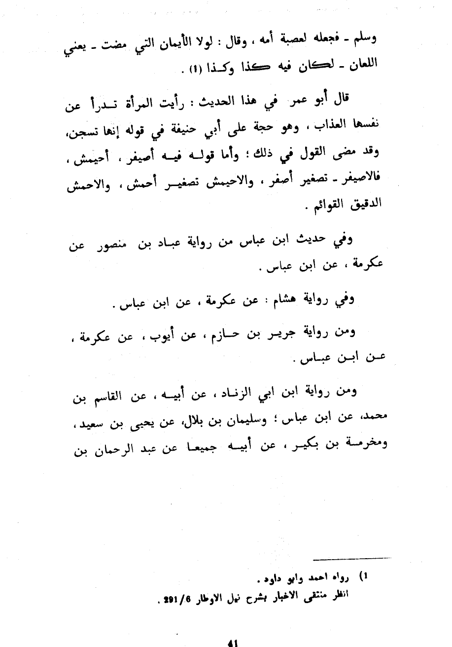 فَجَعَلَهُ لِعَصَبَةِ أُمِّهُ وَقَالَ لَوْلَا الْأَيْمَانُ الَّتِي مَضَتْ يَعْنِي اللِّعَانَ لَكَانَ فِيهِ كَذَا وَكَذَا قَالَ أَبُو عُمَرَ فِي هَذَا الْحَدِيثِ رَأَيْتُ الْمَرْأَةَ تَدْرَأُ عَنْ نَفْسِهَا الْعَذَابَ وَهُوَ حُجَّةٌ عَلَى أَبِي حَنِيفَةَ فِي قَوْلِهِ إِنَّهَا تُسْجَنُ وَقَدْ مَضَى الْقَوْلُ فِي ذَلِكَ وَأَمَّا قَوْلُهُ فِيهِ أُصَيْفِرَ أُحَيْمِشَ فَالْأُصَيْفِرُ تَصْغِيرُ أَصْفَرَ وَالْأُحَيْمِشُ تَصْغِيرُ أَحْمَشَ وَالْأَحْمَشُ الدَّقِيقُ الْقَوَائِمِ وَفِي حَدِيثِ ابْنِ عَبَّاسٍ مِنْ رِوَايَةِ عَبَّادُ بْنُ مَنْصُورٍ عَنْ عِكْرِمَةَ عَنِ ابْنِ عَبَّاسٍ وَفِي رِوَايَةِ هِشَامٍ عَنْ عِكْرِمَةَ عَنِ ابْنِ عَبَّاسٍ وَمِنْ رِوَايَةِ جَرِيرُ بْنُ حَازِمٍ عَنْ أَيُّوبَ عَنْ عِكْرِمَةَ عَنِ ابْنِ عَبَّاسٍ وَمِنْ رِوَايَةِ ابْنِ أَبِي الزِّنَادِ عَنْ أَبِيهِ عَنِ الْقَاسِمِ بْنِ مُحَمَّدٍ عَنِ ابْنِ عَبَّاسٍ وَسُلَيْمَانُ بْنُ بِلَالٍ عَنْ يَحْيَى بْنِ سَعِيدٍ وَمَخْرَمَةَ بْنِ بُكَيْرٍ عن أبيه جميعا عن عبد الرحمان بن