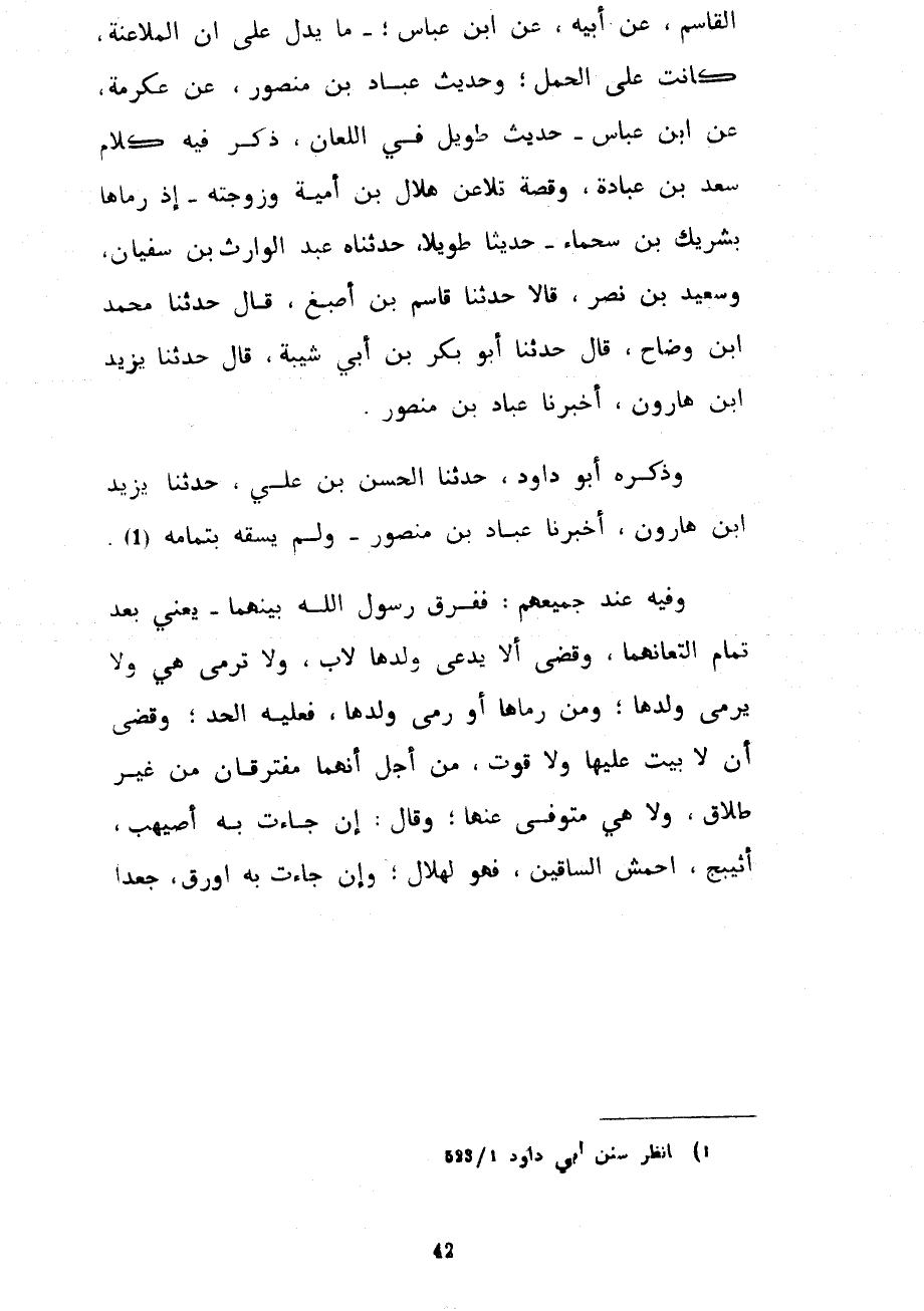 الْقَاسِمِ عَنْ أَبِيهِ عَنِ ابْنِ عَبَّاسٍ مَا يَدُلُّ عَلَى أَنَّ الْمُلَاعَنَةَ كَانَتْ عَلَى الْحَمْلِ وَحَدِيثُ عَبَّادُ بْنُ مَنْصُورٍ عَنْ عِكْرِمَةَ عَنِ ابْنِ عباس حديث طويل فِي اللِّعَانِ ذَكَرَ فِيهِ كَلَامَ سَعْدِ بْنِ عُبَادَةَ وَقِصَّةَ تَلَاعُنِ هِلَالِ بْنِ أُمَيَّةَ وَزَوْجَتِهِ إِذْ رَمَاهَا بِشَرِيكِ بْنِ سَحْمَاءَ حَدِيثًا طَوِيلًا حَدَّثَنَاهُ عَبْدُ الْوَارِثِ بْنُ سُفْيَانَ وَسَعِيدُ بْنُ نَصْرٍ قَالَا حَدَّثَنَا قَاسِمُ بْنُ أَصْبَغَ قَالَ حَدَّثَنَا مُحَمَّدُ بْنُ وَضَّاحٍ قَالَ حَدَّثَنَا أَبُو بَكْرِ بْنُ أَبِي شَيْبَةَ قَالَ حَدَّثَنَا يَزِيدُ بْنُ هَارُونَ أَخْبَرَنَا عَبَّادُ بْنُ مَنْصُورٍ وَذَكَرَهُ أَبُو دَاوُدَ حَدَّثَنَا الْحَسَنُ بْنُ عَلِيٍّ حَدَّثَنَا يَزِيدُ بْنُ هَارُونَ أَخْبَرَنَا عَبَّادُ بْنُ مَنْصُورٍ وَلَمْ يَسُقْهُ بِتَمَامِهِ وَفِيهِ عِنْدَ جَمِيعِهِمْ فَفَرَّقَ رَسُولُ اللَّهِ بَيْنَهُمَا يَعْنِي بَعْدَ تَمَامِ الْتِعَانِهِمَا وَقَضَى أَلَّا يُدْعَى وَلَدُهَا لِأَبٍ وَلَا تُرْمَى هِيَ وَلَا يُرْمَى وَلَدُهَا وَمَنْ رَمَاهَا أَوْ رَمَى وَلَدَهَا فَعَلَيْهِ الْحَدُّ وَقَضَى أَنْ لَا بَيْتَ عَلَيْهَا وَلَا قُوتَ مِنْ أَجْلِ أَنَّهُمَا مُفْتَرِقَانِ مِنْ غَيْرِ طَلَاقٍ وَلَا هِيَ مُتَوَفًّى عَنْهَا وَقَالَ إِنْ جَاءَتْ بِهِ أُصَيْهِبَ أُثَيْبِجَ أَحْمَشَ السَّاقَيْنِ فَهُوَ لِهِلَالٍ وَإِنْ جَاءَتْ بِهِ أورق جعدا