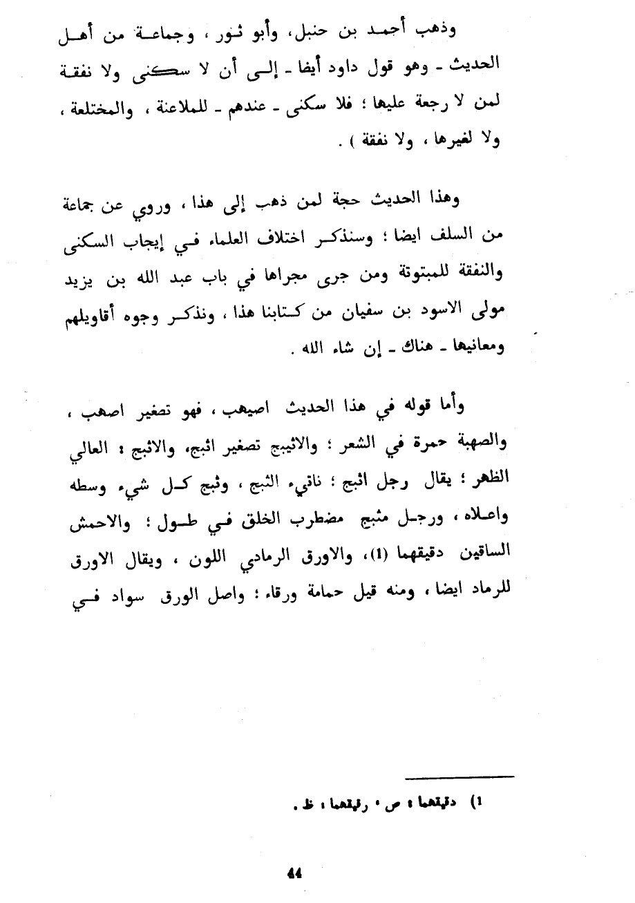 وَذَهَبَ أَحْمَدُ بْنُ حَنْبَلٍ وَأَبُو ثَوْرٍ وَجَمَاعَةٌ مِنْ أَهْلِ الْحَدِيثِ وَهُوَ قَوْلُ دَاوُدَ أَيْضًا إِلَى أَنْ لَا سُكْنَى وَلَا نَفَقَةَ لِمَنْ لَا رَجْعَةَ عَلَيْهَا فَلَا سُكْنَى عِنْدَهُمْ لِلْمُلَاعَنَةِ وَالْمُخْتَلِعَةِ وَلَا لِغَيْرِهَا وَلَا نَفَقَةَ) وَهَذَا الْحَدِيثُ حُجَّةٌ لِمَنْ ذَهَبَ إِلَى هَذَا وَرُوِيَ عَنْ جَمَاعَةٍ مِنَ السَّلَفِ أَيْضًا وَسَنَذْكُرُ اخْتِلَافَ الْعُلَمَاءِ فِي إِيجَابِ السُّكْنَى وَالنَّفَقَةِ لِلْمَبْتُوتَةِ وَمَنْ جَرَى مَجْرَاهَا فِي بَابِ عَبْدِ اللَّهِ بْنِ يَزِيدَ مَوْلَى الْأَسْوَدِ بْنِ سُفْيَانَ مِنْ كِتَابِنَا هَذَا وَنَذْكُرُ وُجُوهَ أَقَاوِيلِهِمْ وَمَعَانِيَهَا هُنَاكَ إِنْ شَاءَ اللَّهُ وَأَمَّا قَوْلُهُ فِي هَذَا الْحَدِيثِ أُصَيْهِبَ فَهُوَ تَصْغِيرُ أَصْهَبَ وَالصُّهْبَةُ حُمْرَةٌ فِي الشَّعْرِ والأثيبج تصغير أثبج والأثبج العالي اظهر يُقَالُ رَجُلٌ أَثْبَجُ نَاتِئُ الثَّبَجِ وَثَبَجُ كُلِّ شَيْءٍ وَسَطُهُ وَأَعْلَاهُ وَرَجُلٌ مُثَبَّجٌ مُضْطَرِبُ الْخَلْقِ فِي طُولٍ وَالْأَحْمَشُ السَّاقَيْنِ دَقِيقُهُمَا وَالْأَوْرَقُ الرَّمَادِيُّ اللَّوْنِ وَيُقَالُ الْأَوْرَقُ لِلرَّمَادِ أَيْضًا وَمِنْهُ قِيلَ حَمَامَةٌ وَرْقَاءُ وَأَصْلُ الْوَرَقِ سَوَادٌ فِي