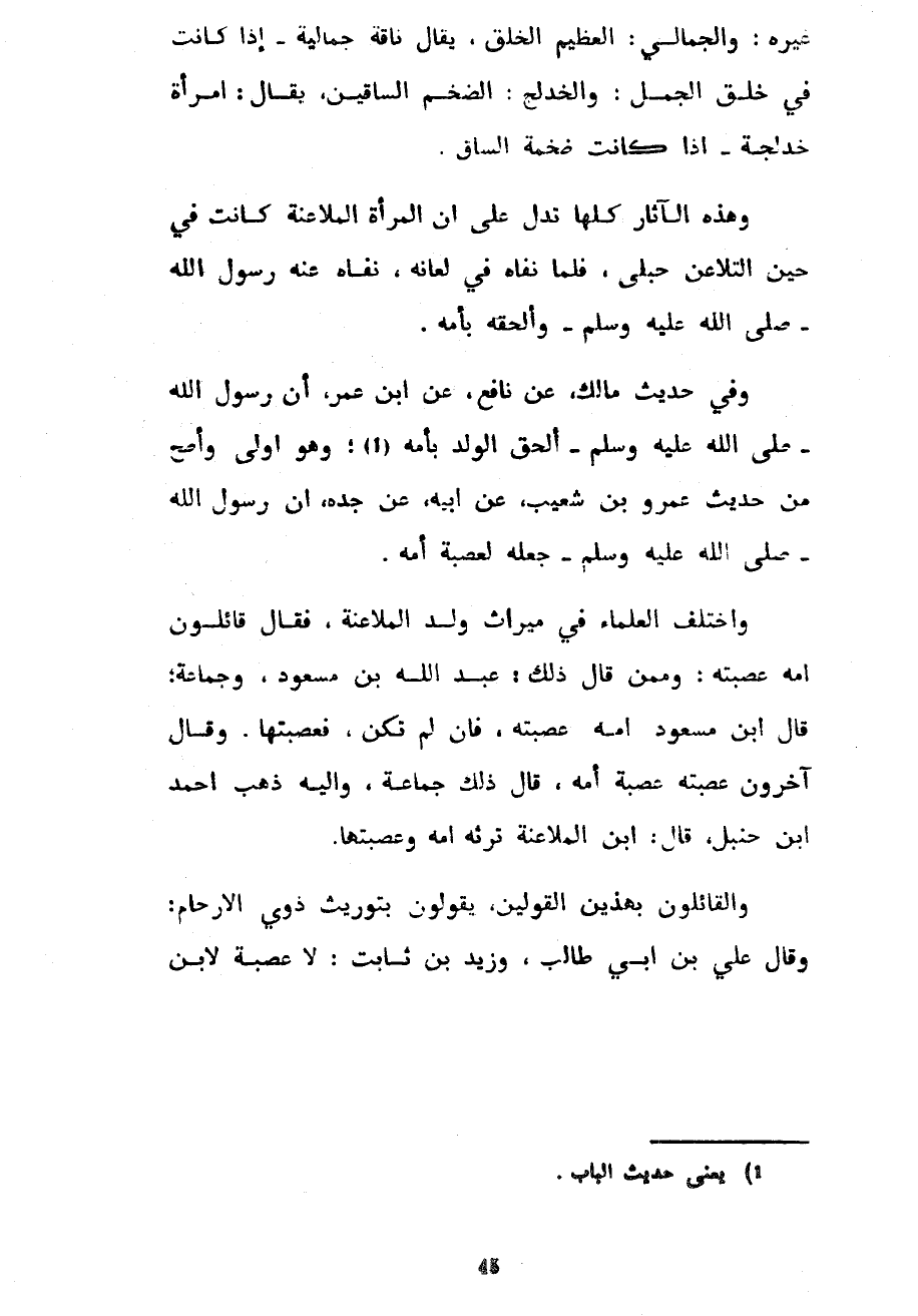 غَيْرِهِ وَالْجُمَالِيُّ الْعَظِيمُ الْخَلْقِ يُقَالُ نَاقَةٌ جُمَالِيَّةٌ إِذَا كَانَتْ فِي خَلْقِ الْجَمَلِ وَالْخَدَلَّجُ الضَّخْمُ السَّاقَيْنِ يُقَالُ امْرَأَةٌ خَدَلَّجَةٌ إِذَا كَانَتْ ضَخْمَةَ السَّاقِ وَهَذِهِ الْآثَارُ كُلُّهَا تَدُلُّ عَلَى أَنَّ الْمَرْأَةَ الْمُلَاعَنَةَ كَانَتْ فِي حِينِ التَّلَاعُنِ حُبْلَى فَلَمَّا نَفَاهُ فِي لِعَانِهِ نَفَاهُ عَنْهُ رَسُولُ اللَّهِ صَلَّى اللَّهُ عَلَيْهِ وَسَلَّمَ وَأَلْحَقَهُ بِأُمِّهِ وَفِي حَدِيثِ مَالِكٍ عَنْ نَافِعٍ عَنِ ابْنِ عُمَرَ أَنَّ رسول الله صلى الله عليه وَسَلَّمَ أَلْحَقَ الْوَلَدَ بِأُمِّهِ وَهُوَ أَوْلَى وَأَصَحُّ مِنْ حَدِيثِ عَمْرِو بْنِ شُعَيْبٍ عَنْ أَبِيهِ عَنْ جَدِّهِ أَنَّ رَسُولَ اللَّهِ صَلَّى اللَّهُ عَلَيْهِ وَسَلَّمَ جَعَلَهُ لِعُصْبَةِ أُمِّهِ وَاخْتَلَفَ الْعُلَمَاءُ فِي مِيرَاثِ وَلَدِ الْمُلَاعَنَةِ فَقَالَ قَائِلُونَ أُمُّهُ عَصَبَتُهُ وَمِمَّنْ قَالَ ذَلِكَ عَبْدُ اللَّهِ بْنُ مَسْعُودٍ وَجَمَاعَةٌ قَالَ ابْنُ مَسْعُودٍ أُمُّهُ عَصَبَتُهُ فَإِنْ لَمْ تَكُنْ فَعَصَبَتُهَا وَقَالَ آخَرُونَ عَصَبَتُهُ عَصَبَةُ أُمِّهِ قَالَ ذَلِكَ جَمَاعَةٌ وَإِلَيْهِ ذَهَبَ أَحْمَدُ بْنُ حَنْبَلٍ قَالَ ابْنُ الْمُلَاعَنَةِ تَرِثُهُ أُمُّهُ وَعَصَبَتُهَا وَالْقَائِلُونَ بِهَذَيْنَ الْقَوْلَيْنِ يَقُولُونَ بِتَوْرِيثِ ذَوِي الْأَرْحَامِ وَقَالَ عَلِيُّ بْنُ أَبِي طَالِبٍ وَزَيْدُ بْنُ ثَابِتٍ لَا عَصَبَةَ لِابْنِ