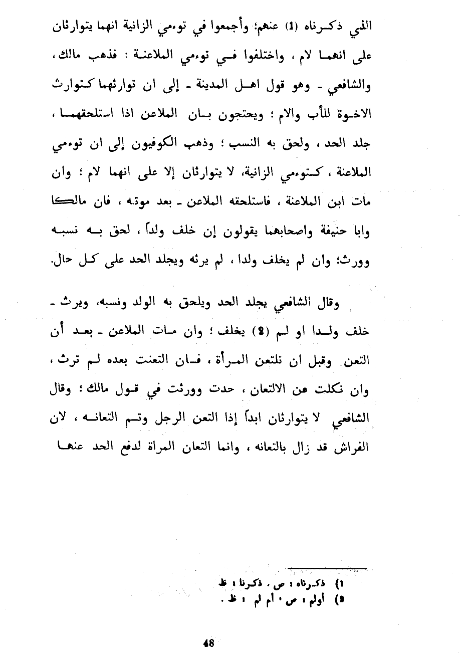 الذي ذكرناه عنهم وأجمعوا في توءمي الزَّانِيَةِ أَنَّهُمَا يَتَوَارَثَانِ عَلَى أَنَّهُمَا لِأُمٍّ وَاخْتَلَفُوا في توءمي الْمُلَاعَنَةِ فَذَهَبَ مَالِكٌ وَالشَّافِعِيُّ وَهُوَ قَوْلُ أَهْلِ الْمَدِينَةِ إِلَى أَنَّ تَوَارُثَهُمَا كَتَوَارُثِ الْإِخْوَةِ لِلْأَبِ وَالْأُمِّ وَيَحْتَجُّونَ بِأَنَّ الْمُلَاعِنَ إِذَا اسْتَلْحَقَهُمَا جُلِدَ الْحَدَّ وَلَحِقَ بِهِ النَّسَبُ وَذَهَبَ الْكُوفِيُّونَ إِلَى أن توءمي الملاعنة كتوءمي الزَّانِيَةِ لَا يَتَوَارَثَانِ إِلَّا عَلَى أَنَّهُمَا لِأُمٍّ وَإِنْ مَاتَ ابْنُ الْمُلَاعَنَةِ فَاسْتَلْحَقَهُ الْمُلَاعِنُ بَعْدَ مَوْتِهِ فَإِنَّ مَالِكًا وَأَبَا حَنِيفَةَ وَأَصْحَابَهُمَا يَقُولُونَ إِنْ خَلَفَ وَلَدًا لَحِقَ بِهِ نَسَبُهُ وَوَرِثَ وَإِنْ لَمْ يُخْلِفْ وَلَدًا لَمْ يَرِثْهُ وَيُجْلَدُ الْحَدَّ عَلَى كُلِّ حَالٍ وَقَالَ الشَّافِعِيُّ يُجْلَدُ الْحَدَّ وَيَلْحَقُ بِهِ الْوَلَدُ وَنَسَبُهُ وَيَرِثُ خَلَّفَ وَلَدًا أَوْ لَمْ يُخْلِّفْ وَإِنْ مَاتَ الْمُلَاعِنُ بَعْدَ أَنِ الْتَعَنَ وَقَبْلَ أَنْ تَلْتَعِنَ الْمَرْأَةُ فَإِنِ الْتَعَنَتْ بَعْدَهُ لَمْ تَرِثْ وَإِنْ نَكَلَتْ عَنْ الِالْتِعَانِ حُدَّتْ وَوَرِثَتْ فِي قَوْلِ مَالِكٍ وَقَالَ الشَّافِعِيُّ لَا يَتَوَارَثَانِ أَبَدًا إِذَا الْتَعْنَ الرَّجُلُ وَتَمَّ الْتِعَانُهُ لِأَنَّ الْفِرَاشَ قَدْ زَالَ بِالْتِعَانِهِ وَإِنَّمَا الْتِعَانُ الْمَرْأَةِ لِدَفْعِ الْحَدِّ عَنْهَا