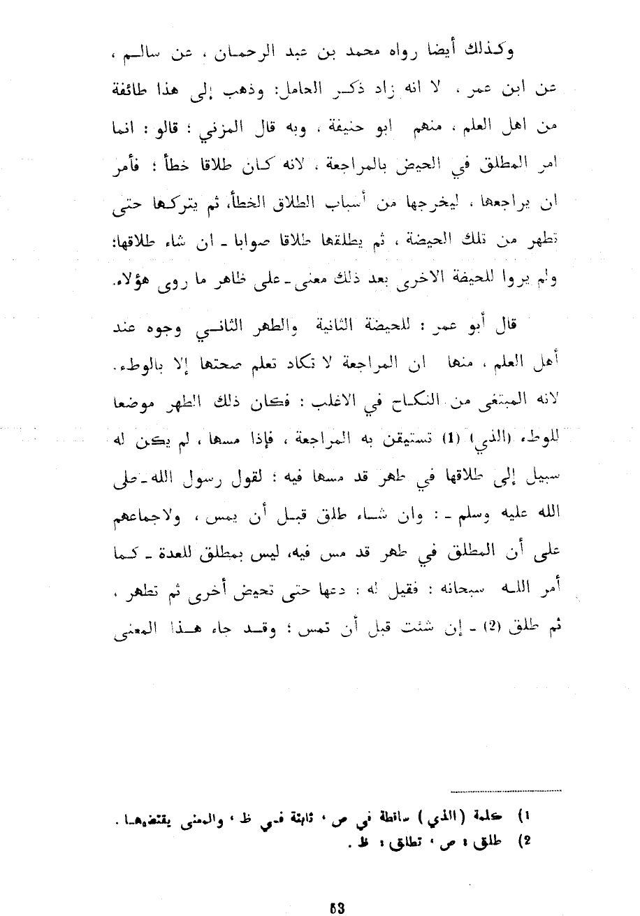 وكذلك أيضا رواه محمد بن عبد الرحمان عَنْ سَالِمٍ عَنِ ابْنِ عُمَرَ لَا أَنَّهُ زَادَ ذِكْرَ الْحَامِلِ وَذَهَبَ إِلَى هَذَا طَائِفَةٌ مِنْ أَهْلِ الْعِلْمِ مِنْهُمْ أَبُو حَنِيفَةَ وَبِهِ قَالَ الْمُزَنِيُّ قَالُوا إِنَّمَا أُمِرَ الْمُطَلِّقُ فِي الْحَيْضِ بِالْمُرَاجَعَةِ لِأَنَّهُ كَانَ طَلَاقًا خَطَأً فَأُمِرَ أَنْ يُرَاجِعَهَا لِيُخْرِجَهَا مِنْ أَسْبَابِ الطَّلَاقِ الْخَطَأِ ثُمَّ يَتْرُكَهَا حَتَّى تَطْهُرَ مِنْ تِلْكَ الْحَيْضَةِ ثُمَّ يُطَلِّقُهَا طَلَاقًا صَوَابًا إِنْ شَاءَ طَلَاقَهَا وَلَمْ يَرَوْا لِلْحَيْضَةِ الْأُخْرَى بَعْدَ ذَلِكَ مَعْنًى عَلَى ظَاهِرِ مَا رَوَى هَؤُلَاءِ قَالَ أَبُو عُمَرَ لِلْحَيْضَةِ الثَّانِيَةِ وَالطُّهْرِ الثَّانِي وُجُوهٌ عِنْدَ أَهْلِ الْعِلْمِ مِنْهَا أَنَّ الْمُرَاجَعَةَ لَا تَكَادُ تُعْلَمُ صِحَّتُهَا إِلَّا بِالْوَطْءِ لِأَنَّهُ الْمُبْتَغَى مِنَ النِّكَاحِ فِي الْأَغْلَبِ فَكَانَ ذَلِكَ الطُّهْرُ مَوْضِعًا لِلْوَطْءِ (الَّذِي) تُسْتَيْقَنُ بِهِ الْمُرَاجَعَةُ فَإِذَا مَسَّهَا لَمْ يَكُنْ لَهُ سَبِيلٌ إِلَى طَلَاقِهَا فِي طُهْرٍ قَدْ مَسَّهَا فِيهِ لِقَوْلِ رَسُولِ اللَّهِ صَلَّى اللَّهُ عَلَيْهِ وَسَلَّمَ وَإِنْ شَاءَ طَلَّقَ قَبْلَ أَنْ يَمَسَّ وَلِإِجْمَاعِهِمْ عَلَى أَنَّ الْمُطَلِّقَ فِي طُهْرٍ قَدْ مَسَّ فِيهِ لَيْسَ بِمُطَلِّقٍ لِلْعِدَّةِ كَمَا أَمَرَ اللَّهُ سُبْحَانَهُ فَقِيلَ لَهُ دَعْهَا حَتَّى تَحِيضَ أُخْرَى ثُمَّ تَطْهُرَ ثُمَّ طَلِّقْ إِنْ شِئْتَ قَبْلَ أَنْ تَمَسَّ وَقَدْ جَاءَ هَذَا الْمَعْنَى