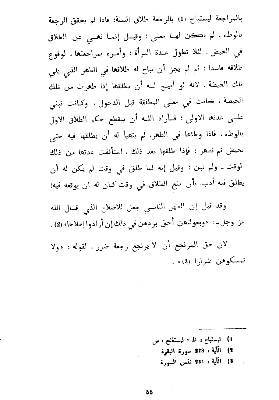 بِالْمُرَاجَعَةِ لِيُسْتَبَاحَ بِالرَّجْعَةِ طَلَاقُ السُّنَّةِ فَإِذَا لَمْ يُحَقِّقِ الرَّجْعَةَ بِالْوَطْءِ لَمْ يَكُنْ لَهَا مَعْنًى وَقِيلَ إِنَّمَا نُهِيَ عَنِ الطَّلَاقِ فِي الْحَيْضِ لِئَلَّا تَطُولَ عِدَّةُ الْمَرْأَةِ وَأَمَرَهُ بِمُرَاجَعَتِهَا لِوُقُوعِ طَلَاقِهِ فَاسِدًا ثُمَّ لَمْ يَجُزْ أَنْ يُبَاحَ لَهُ طَلَاقُهَا فِي الطُّهْرِ الَّذِي يَلِي تِلْكَ الْحَيْضَةَ لِأَنَّهُ لَوْ أُبِيحَ لَهُ أَنْ يُطَلِّقَهَا إِذَا طَهُرَتْ مِنْ تِلْكَ الْحَيْضَةِ كَانَتْ فِي مَعْنَى الْمُطَلَّقَةِ قَبْلَ الدُّخُولِ وَكَانَتْ تَبْنِي عَلَى عِدَّتِهَا الْأُولَى فَأَرَادَ اللَّهُ أَنْ يَنْقَطِعَ حُكْمُ الطَّلَاقِ الْأَوَّلِ بِالْوَطْءِ فَإِذَا وَطِئَهَا فِي الطُّهْرِ لَمْ يَتَهَيَّأْ لَهُ أَنْ يُطَلِّقَهَا فِيهِ حَتَّى تَحِيضَ ثُمَّ تَطْهُرَ فَإِذَا طَلَّقَهَا بَعْدَ ذَلِكَ اسْتَأْنَفَتْ عِدَّتُهَا مِنْ ذَلِكَ الْوَقْتِ وَلَمْ تَبِنْ وَقِيلَ إِنَّهُ لَمَّا طَلَّقَ فِي وَقْتٍ لَمْ يَكُنْ لَهُ أَنْ يُطَلِّقَ فِيهِ أُدِّبَ بِأَنْ مُنِعَ الطَّلَاقَ فِي وَقْتٍ كَانَ لَهُ أَنْ يُوقِعَهُ فِيهِ وَقَدْ قِيلَ إِنَّ الطُّهْرَ الثَّانِيَ جُعِلَ لِلْإِصْلَاحِ الَّذِي قَالَ اللَّهُ عَزَّ وَجَلَّ وَبُعُولَتُهُنَّ أَحَقُّ بِرَدِّهِنَّ فِي ذَلِكَ إِنْ أَرَادُوا إِصْلَاحًا لِأَنَّ حَقَّ الْمُرْتَجِعِ أَنْ لَا يَرْتَجِعَ رَجْعَةَ ضَرَرٍ لِقَوْلِهِ وَلَا تُمْسِكُوهُنَّ ضِرَارًا